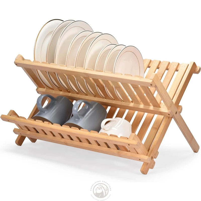 Foldable Compact Bamboo Dish Rack Kitchen Household Storage Rack 2 tier dish drying rack