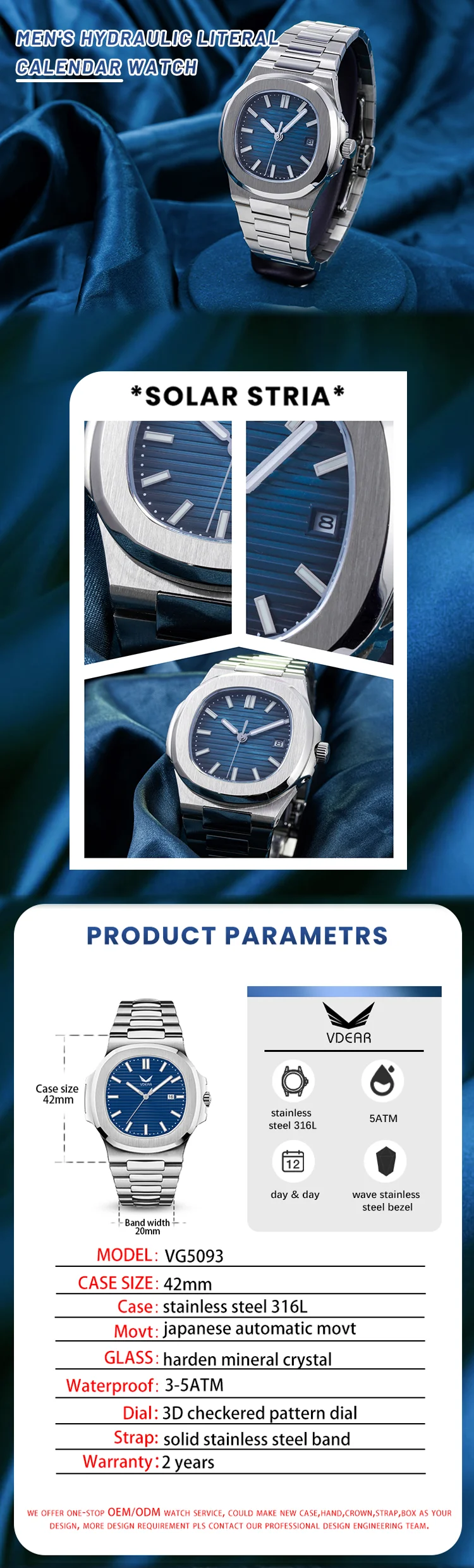 1. What's your best price for this watch? A: Quotation will depend on your quantity and material Please kindly let us know your quantity when you inquired. Any question about the prices, please contact us for discussion. Price is negotiable. 2. What's your MOQ? A: For stainless steel case, we require 200 pcs for each model, 100pcs per color. For alloy case, we require 300 pcs for each model, 100pcs per color. If you need low moq,please contact us,we can supply in stock watch with our logo if you dont mind 3.How about the sample? Can I get it for free? And the sample delivery time? A: * For samples, the cost would be 100usd/pcs for normal quartz watch; 200usd / 400usd per piece for mechanical watches and dive watches. * And shipping cost depends on which area you are. * But don’t worry, sample fee is refundable if we can reach an order for near future * For the delivery time, about 30 days are needed for existing models and about 45 days for new models. 4. What's the delivery time? A: Normally, it’s 35 – 40 days after every details confirmed for mass production.The earlier you order,the sooner we arrange production plan And goods will be delivered when balance is received. 5.What's your packing? A: We offer two packing options for our customers. * Free packing, our normal packing is 1 opp bag for 1 watch. * Customized your own watch box. But please notice it will take extra charge for it. Download Watch Boxes Catalogue. 6.Can we have our own logo or design? A: Sure, your own logo is welcomed and we can make it free for you. You can be customized on dial, caseback, band, buckle or any other places. Also your own design is welcomed, we can make samples or mass production according to your provided samples or designs. 7.What about the warranty? A: We have our QC department. All the goods would be 100% inspected before shipment. Any problems that you find after receiving the goods, please contact us immediately for solutions. We provide 1 year warranty for the customize watches and 2 years for the movement from the date of delivery. We can repair the defect part for free and stand half of the freight. 8: When does your watch factory established? A: Our watch factory is established in 2008, with over 10 years professional experience on watches line, Workers are well-trained and educated. 9: What kind of watches do you offer? A: Basically all kinds of quartz and mechanical watches, by using Japan or Swiss original movement. Different kinds of material: alloy watches. 316l Stainless steel watches, silicone watches, wood watches/ mineral glass, sapphire glass, dome glass/ Genuine full grain leather strap, vegan leather, stainless steel link band, stainless steel mesh band, nylon strap. Please note that we don’t provide digital or smart watches. 10: What's your production capacity per month? A: Our production capacity per month is 500,000pcs. 11: Do your watches meet Europe & American standard? And what kinds of certificate would you have? A: Yes, our watches do meet Europe & American standard. And we have CE, ROHS, SGS, ISO9001, you can check the copy of them on our website. 12: Would you have your own design team to design watches per our request? A: Sure, our professional design team will provide the best design drawing before sampling or order. When you need an artwork, just let us know, free charge. 13: Can you ship to my country? How long will the shipment take? A: Sure, we ship goods worldwide by DHL / TNT / UPS / EMS / FedEx / Aramex, etc. It would take about 3-7 days depend on different courier you choose. Default courier is DHL(door to door). The cost mostly depends on the final choice for the watches models, packing and shipping method, for sure we will recommending the most economic one for you.