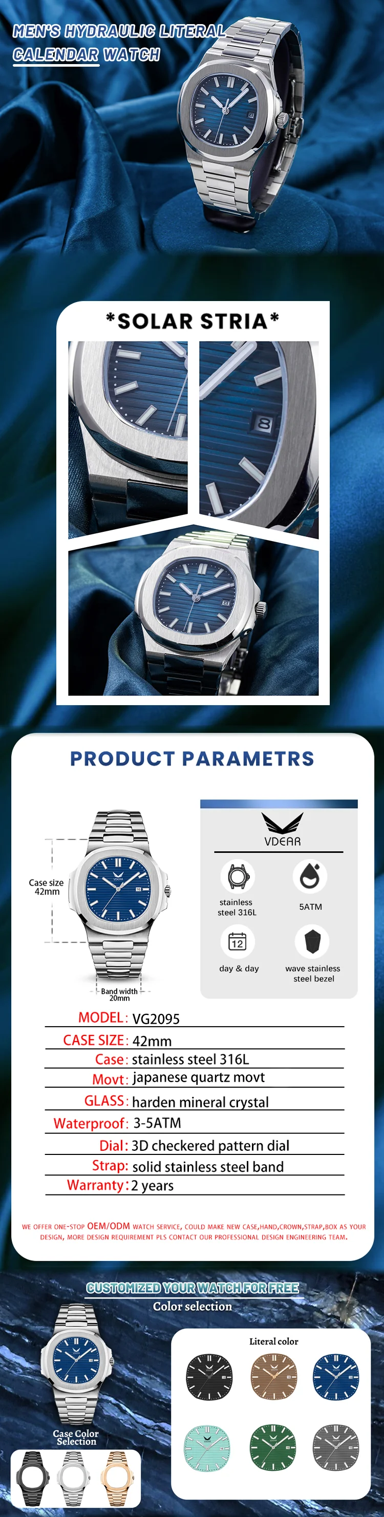 1. What's your best price for this watch? A: Quotation will depend on your quantity and material Please kindly let us know your quantity when you inquired. Any question about the prices, please contact us for discussion. Price is negotiable. 2. What's your MOQ? A: For stainless steel case, we require 200 pcs for each model, 100pcs per color. For alloy case, we require 300 pcs for each model, 100pcs per color. If you need low moq,please contact us,we can supply in stock watch with our logo if you dont mind 3.How about the sample? Can I get it for free? And the sample delivery time? A: * For samples, the cost would be 100usd/pcs for normal quartz watch; 200usd / 400usd per piece for mechanical watches and dive watches. * And shipping cost depends on which area you are. * But don’t worry, sample fee is refundable if we can reach an order for near future * For the delivery time, about 30 days are needed for existing models and about 45 days for new models. 4. What's the delivery time? A: Normally, it’s 35 – 40 days after every details confirmed for mass production.The earlier you order,the sooner we arrange production plan And goods will be delivered when balance is received. 5.What's your packing? A: We offer two packing options for our customers. * Free packing, our normal packing is 1 opp bag for 1 watch. * Customized your own watch box. But please notice it will take extra charge for it. Download Watch Boxes Catalogue. 6.Can we have our own logo or design? A: Sure, your own logo is welcomed and we can make it free for you. You can be customized on dial, caseback, band, buckle or any other places. Also your own design is welcomed, we can make samples or mass production according to your provided samples or designs. 7.What about the warranty? A: We have our QC department. All the goods would be 100% inspected before shipment. Any problems that you find after receiving the goods, please contact us immediately for solutions. We provide 1 year warranty for the customize watches and 2 years for the movement from the date of delivery. We can repair the defect part for free and stand half of the freight. 8: When does your watch factory established? A: Our watch factory is established in 2008, with over 10 years professional experience on watches line, Workers are well-trained and educated. 9: What kind of watches do you offer? A: Basically all kinds of quartz and mechanical watches, by using Japan or Swiss original movement. Different kinds of material: alloy watches. 316l Stainless steel watches, silicone watches, wood watches/ mineral glass, sapphire glass, dome glass/ Genuine full grain leather strap, vegan leather, stainless steel link band, stainless steel mesh band, nylon strap. Please note that we don’t provide digital or smart watches. 10: What's your production capacity per month? A: Our production capacity per month is 500,000pcs. 11: Do your watches meet Europe & American standard? And what kinds of certificate would you have? A: Yes, our watches do meet Europe & American standard. And we have CE, ROHS, SGS, ISO9001, you can check the copy of them on our website. 12: Would you have your own design team to design watches per our request? A: Sure, our professional design team will provide the best design drawing before sampling or order. When you need an artwork, just let us know, free charge. 13: Can you ship to my country? How long will the shipment take? A: Sure, we ship goods worldwide by DHL / TNT / UPS / EMS / FedEx / Aramex, etc. It would take about 3-7 days depend on different courier you choose. Default courier is DHL(door to door). The cost mostly depends on the final choice for the watches models, packing and shipping method, for sure we will recommending the most economic one for you.
