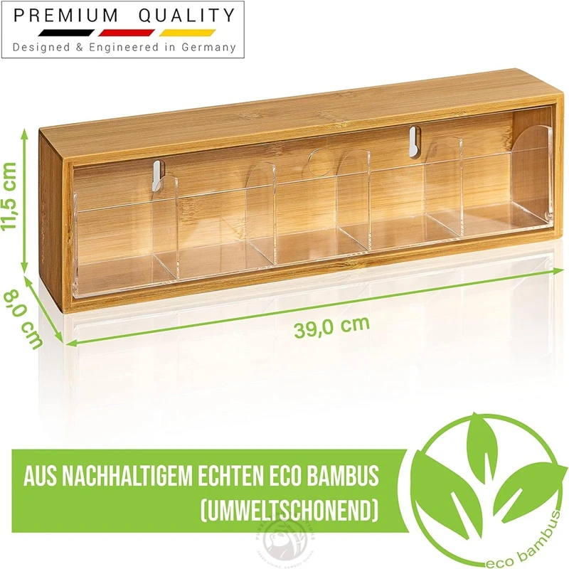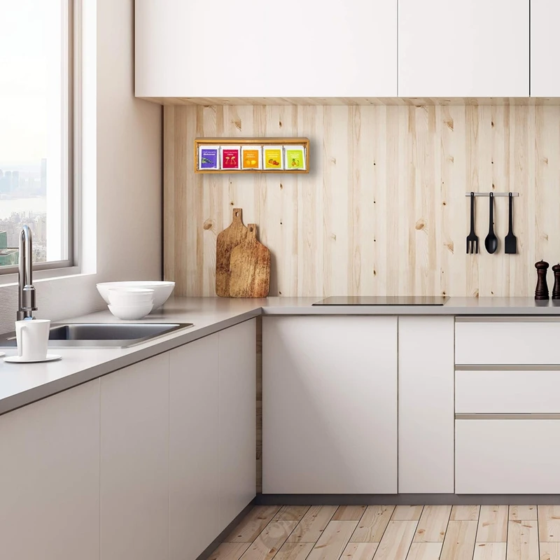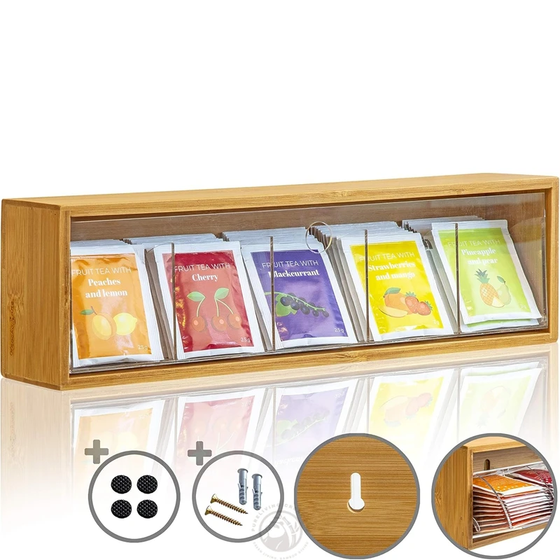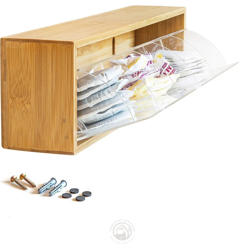 Tea Bag Storage Box Organiser Tea Box with Tilt Lid for Wall Hanging Tea Bag Dispenser Natural Bamboo Wood