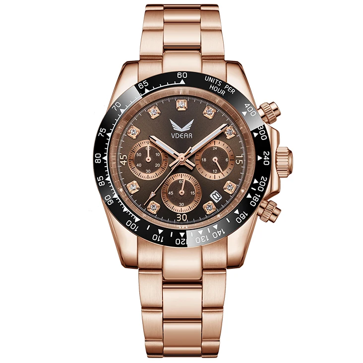 Male Ceramic Bezel 5atm Waterproof Luminous Date Diamond Brown Three Eye Dial Men Luxury Watch Steel Rose Gold Quartz Horloges