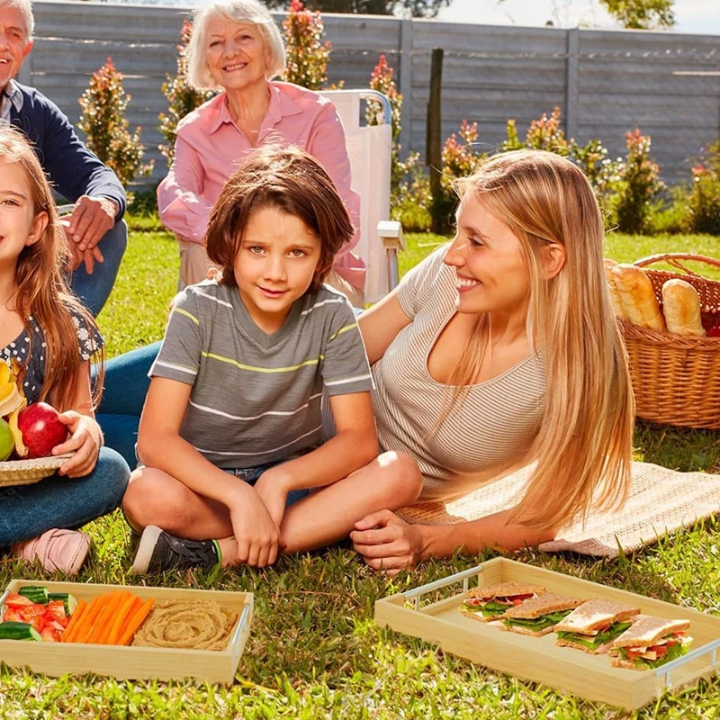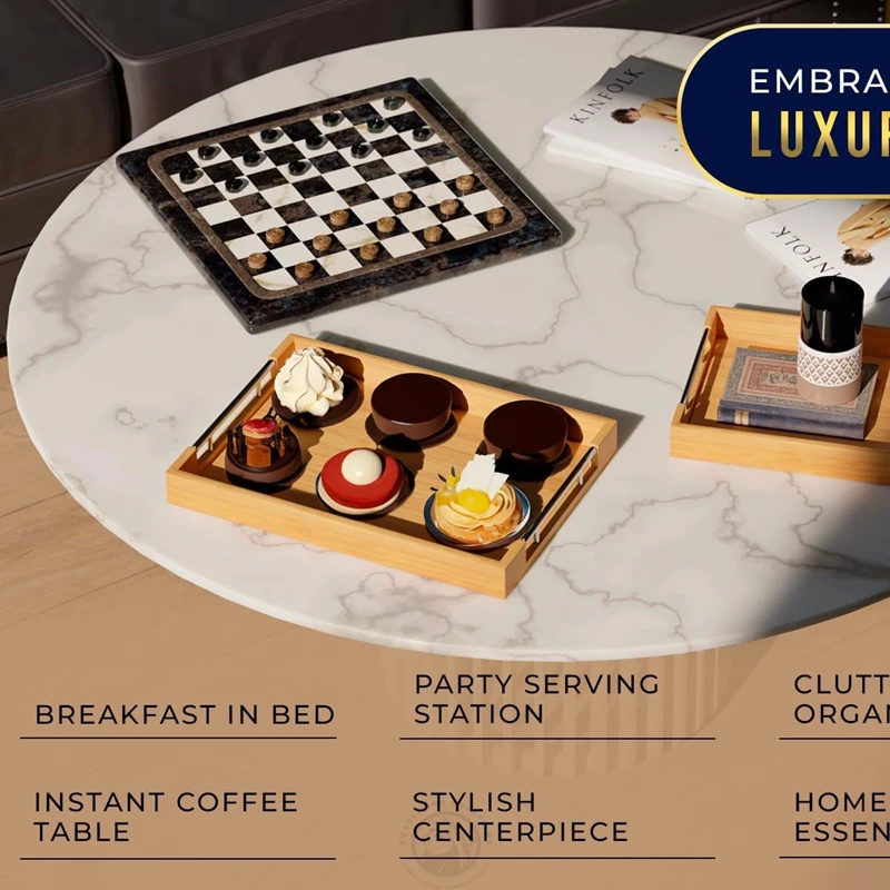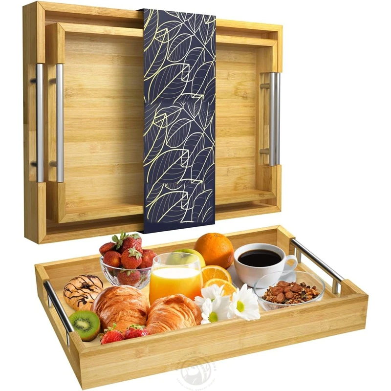 Set of 2 Modern Bamboo Serving Trays with Metal Handles, Natural Color wooden trays