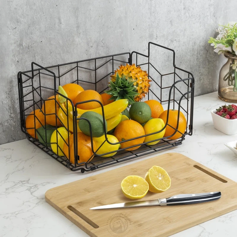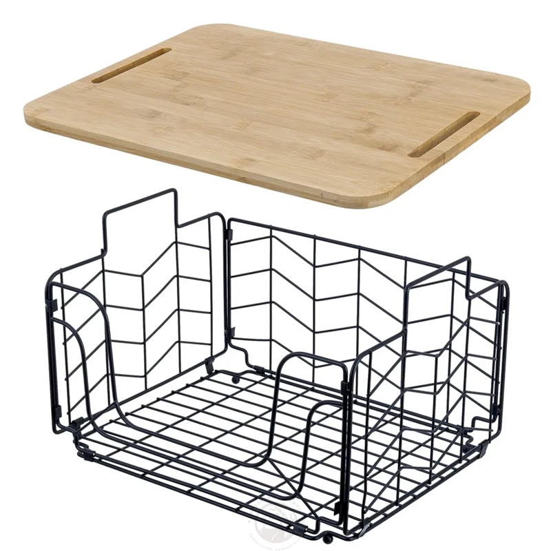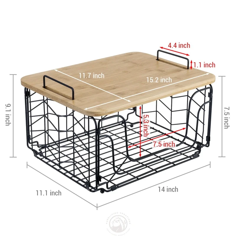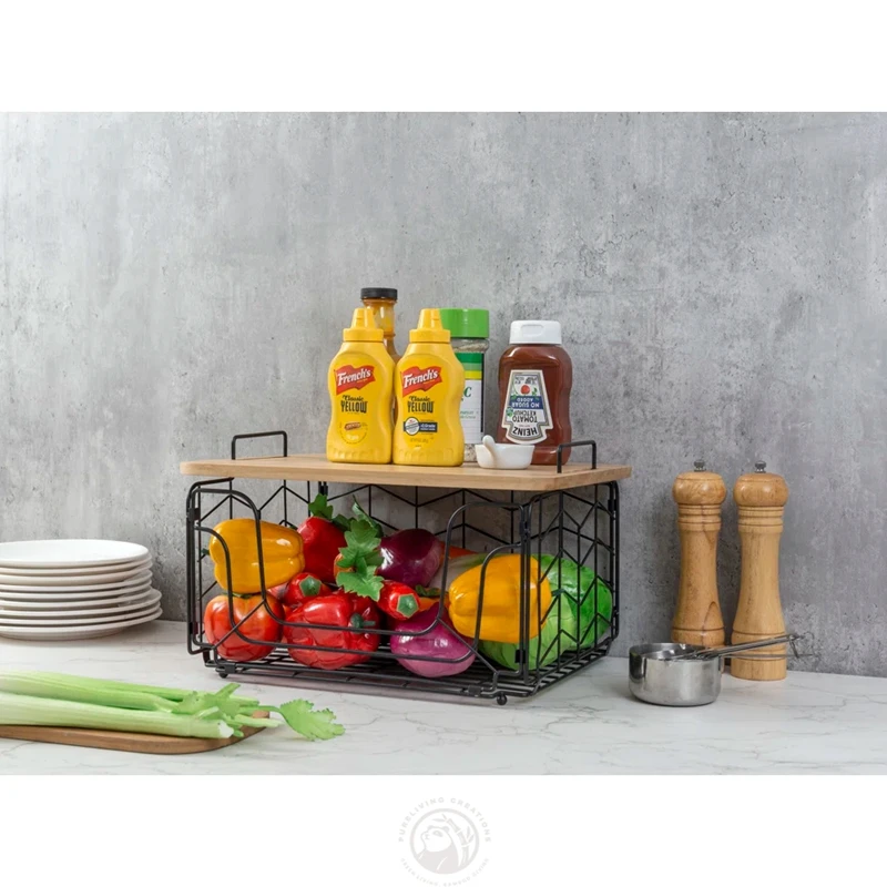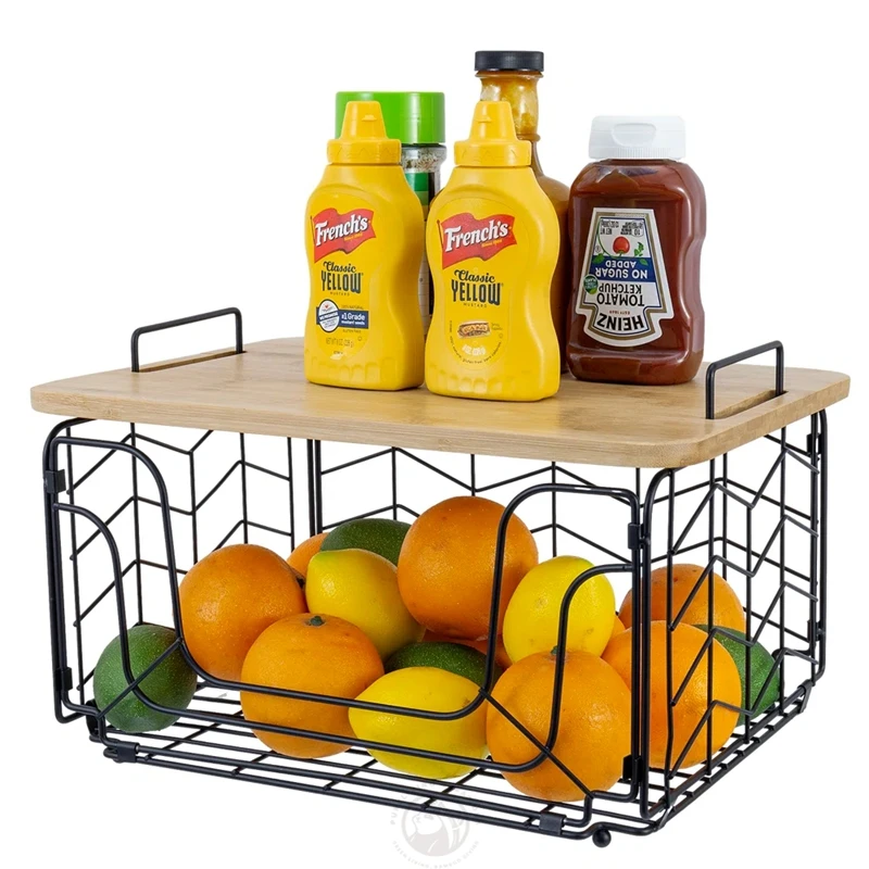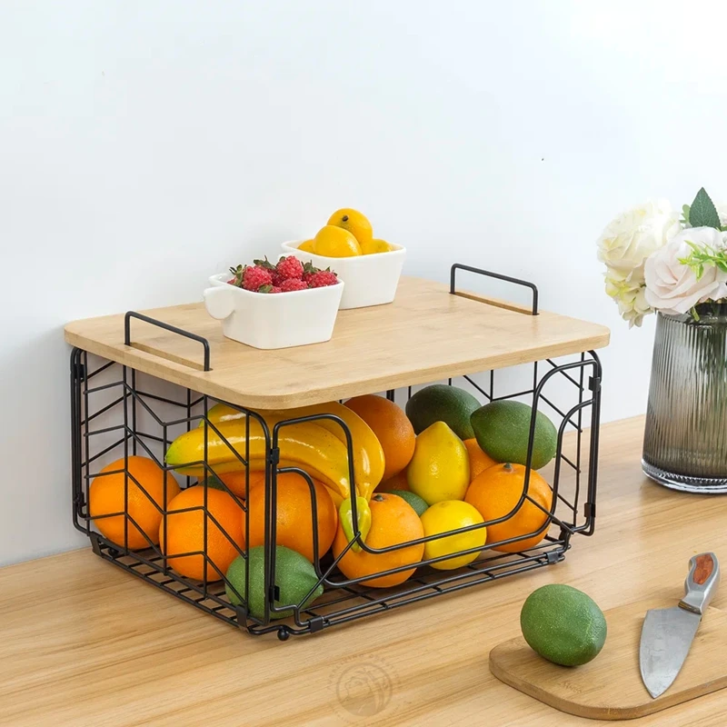 Bread, Vegetables and Fruit Storage Box with Bamboo Lid, Storage Room Cabinet Metal Rectangular Wire Basket