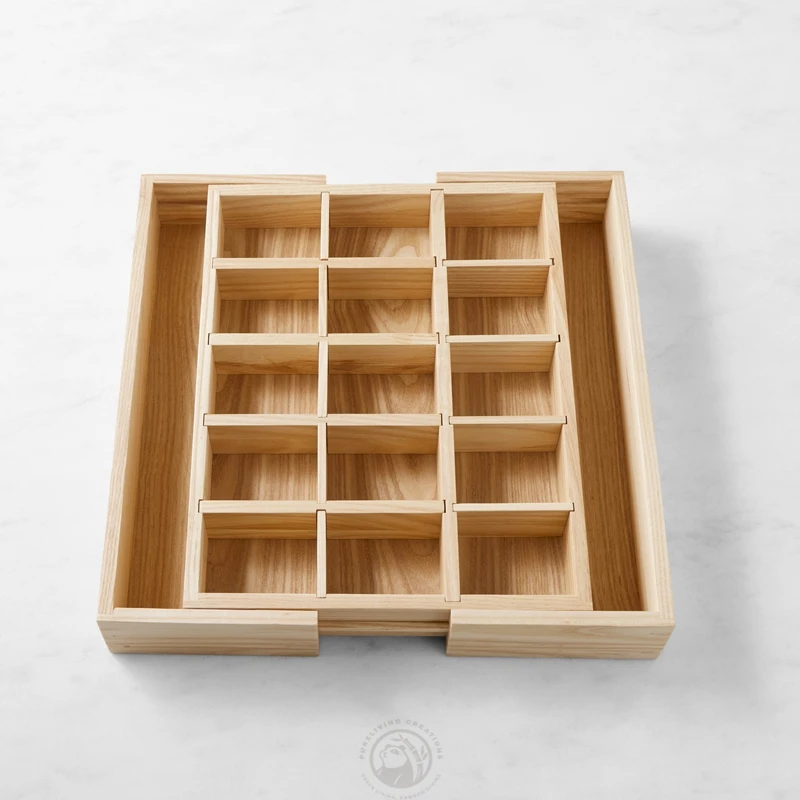 Adjustable 17 Compartments Solid Bamboo Sectioned Storage Tray for Kitchen Gadgets Utensils Cutlery Flatware Silverware