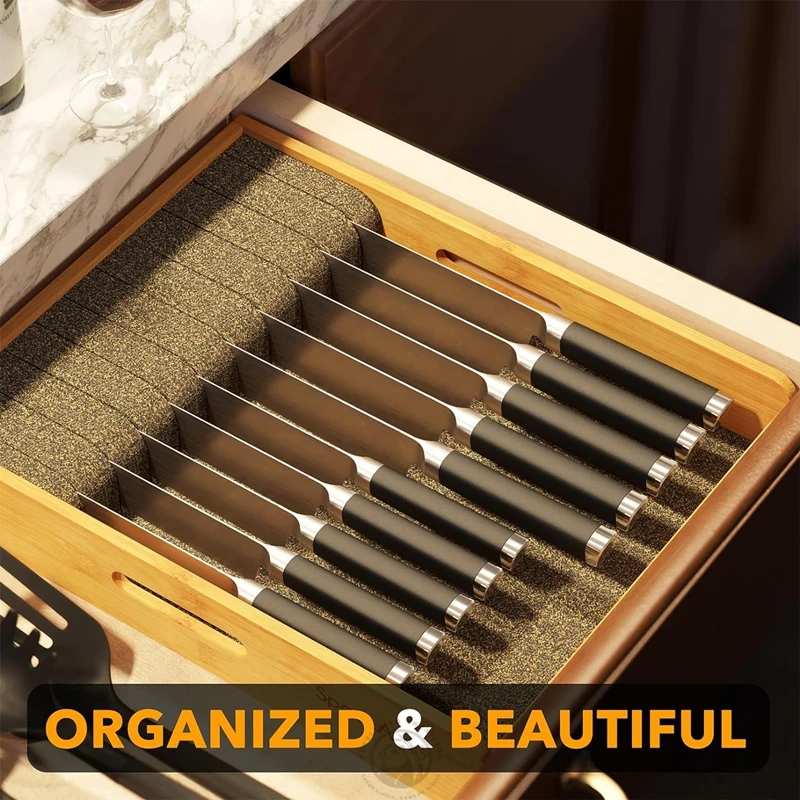 Customized Bamboo Wood Knife Organizer with Logo Rectangle Shape Drawer In-Drawer Knife Block for Kitchen Use
