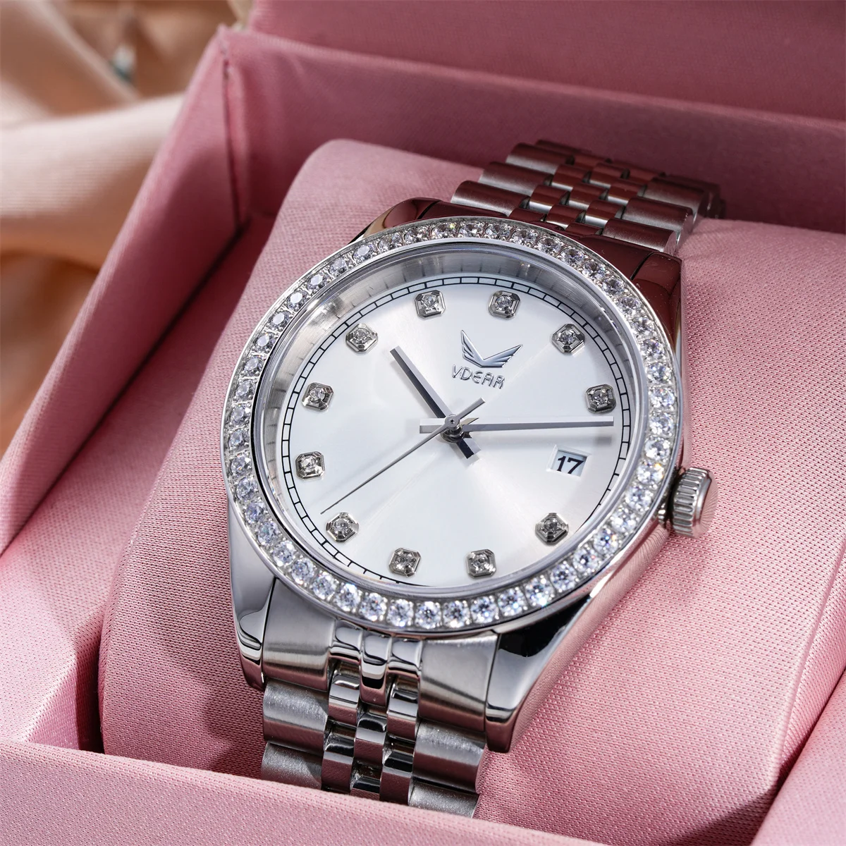 Classics Diamond Bezel 5bar Waterproof Silver Dial Calendar Reloj Oro Rosa Watches Men Stainless Steel Japan Movt Quartz Watch