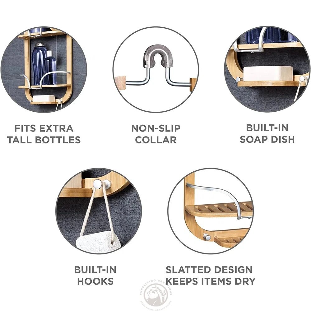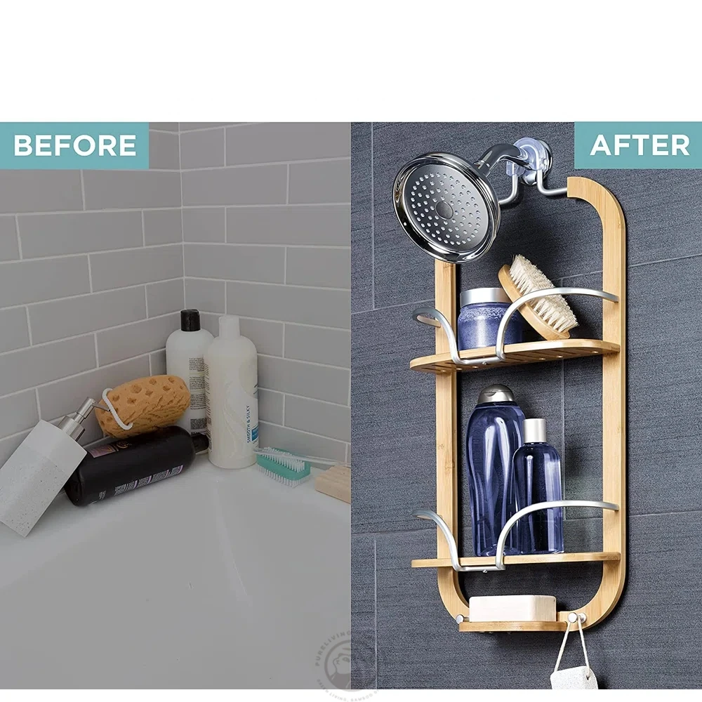 Waterproof Natural Bamboo and Stainless Steel Shower Caddy Storage Rack Wall Bathroom Shelves