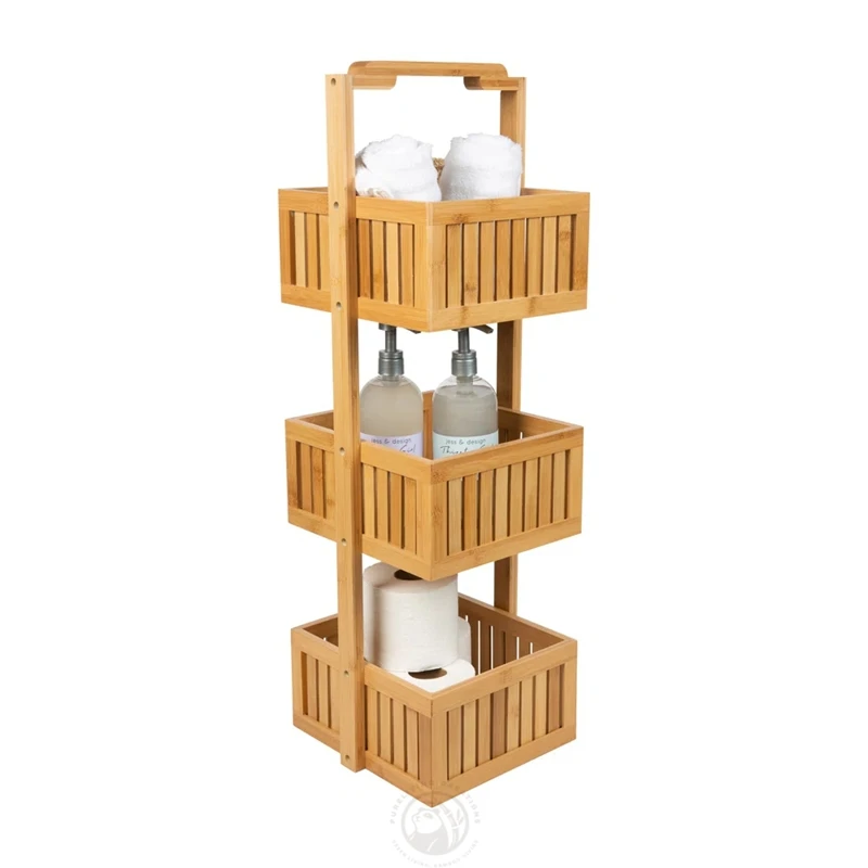 Standing 3 Tier Bamboo Wooden Shower Caddy Shelf with Handle Caddy Basket for Shampoo