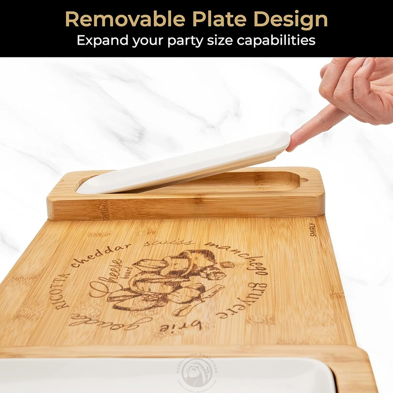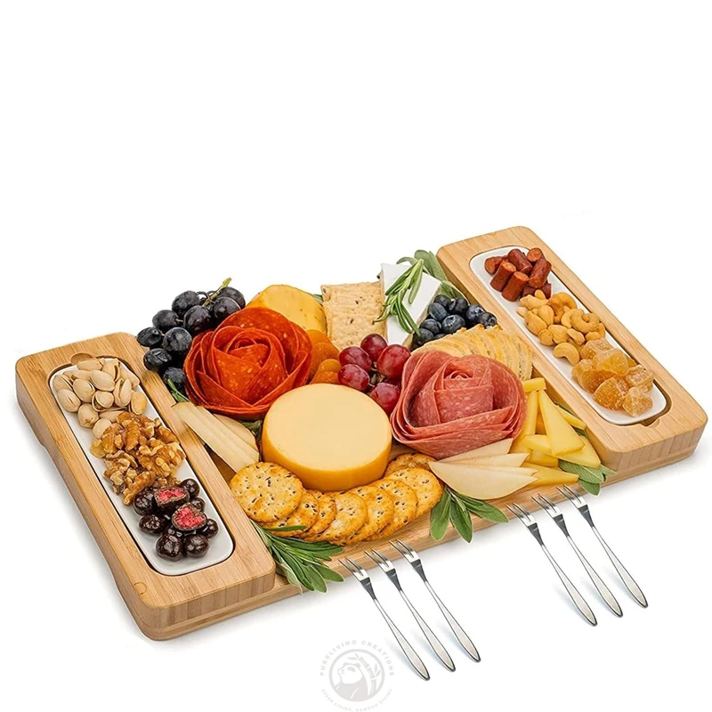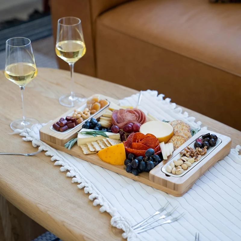 Unique Design with Two Ceramic Tray Rectangle Shape Bamboo Wood Charcuterie Preparation Board Custom Logo
