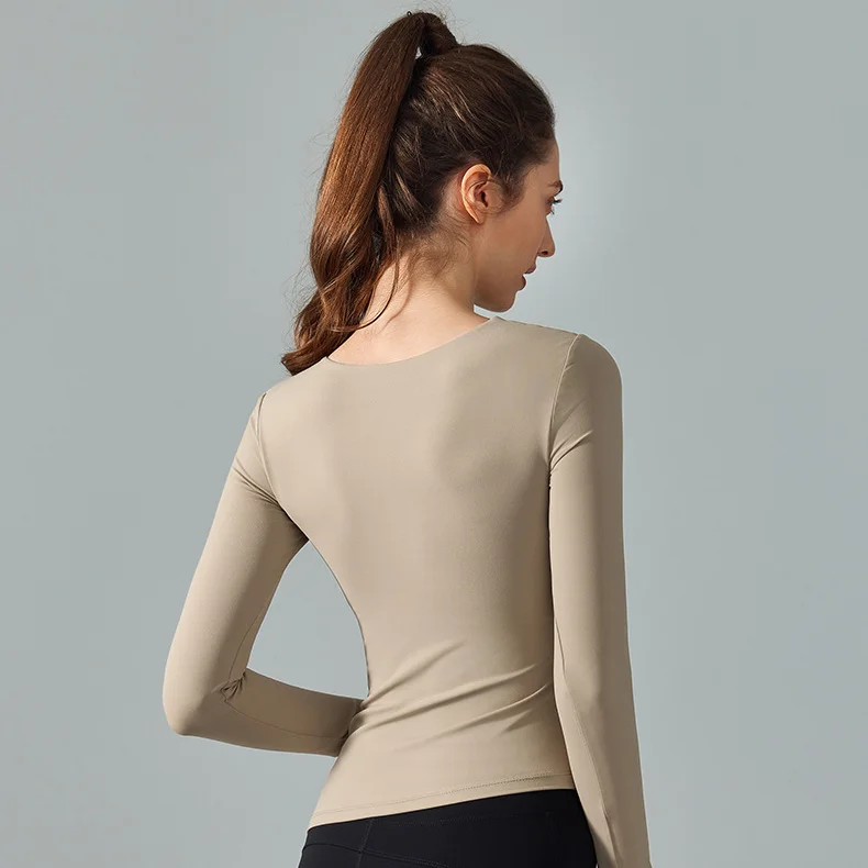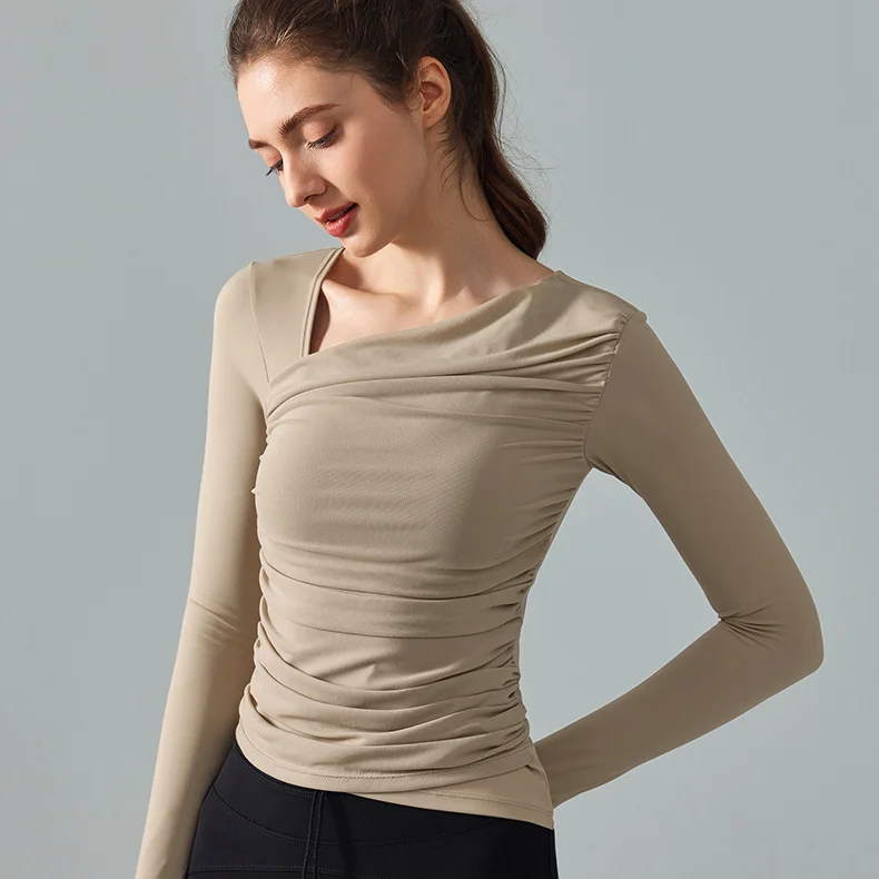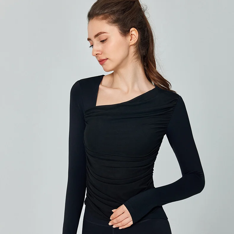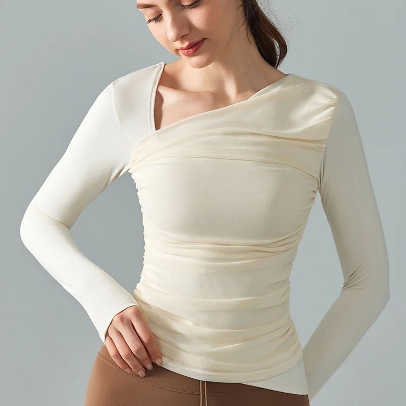 High Quality Women's Diagonal Neckline Sexy Casual Gauze Patchwork Long Sleeve Sports Yoga Fitness T-shirts Workout Running Top