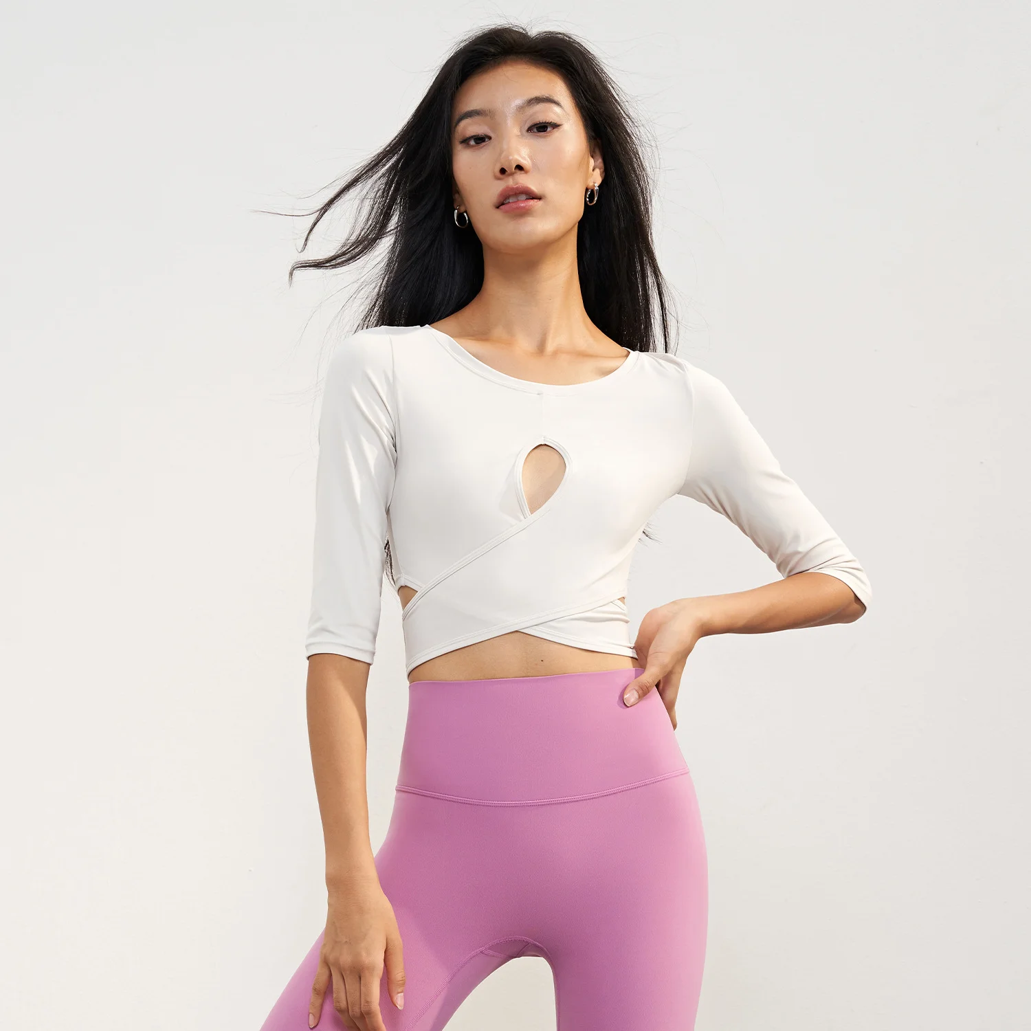 Women's Sexy Hollow-out Yoga T-shirt Sports Breathable Quick Dry Gym Fitness Workout Round Neck Cross Short Six-point Crop Top