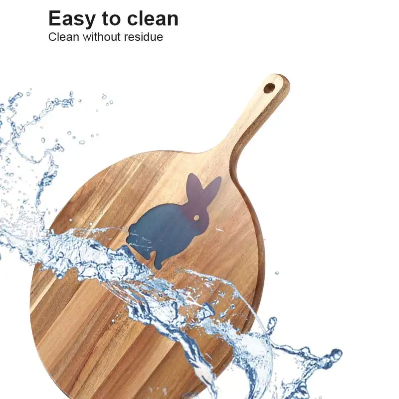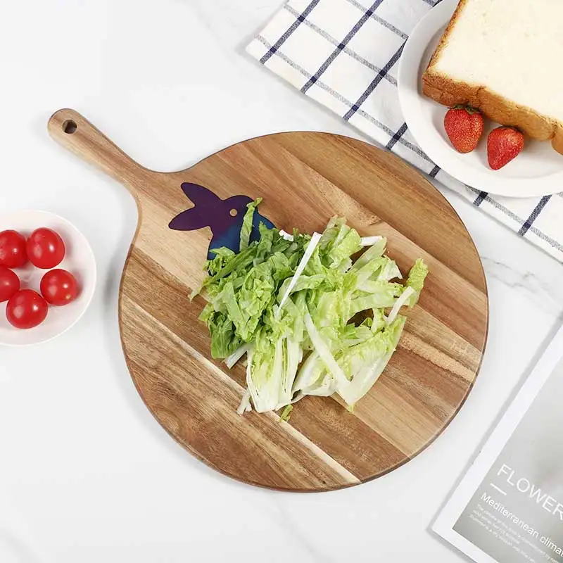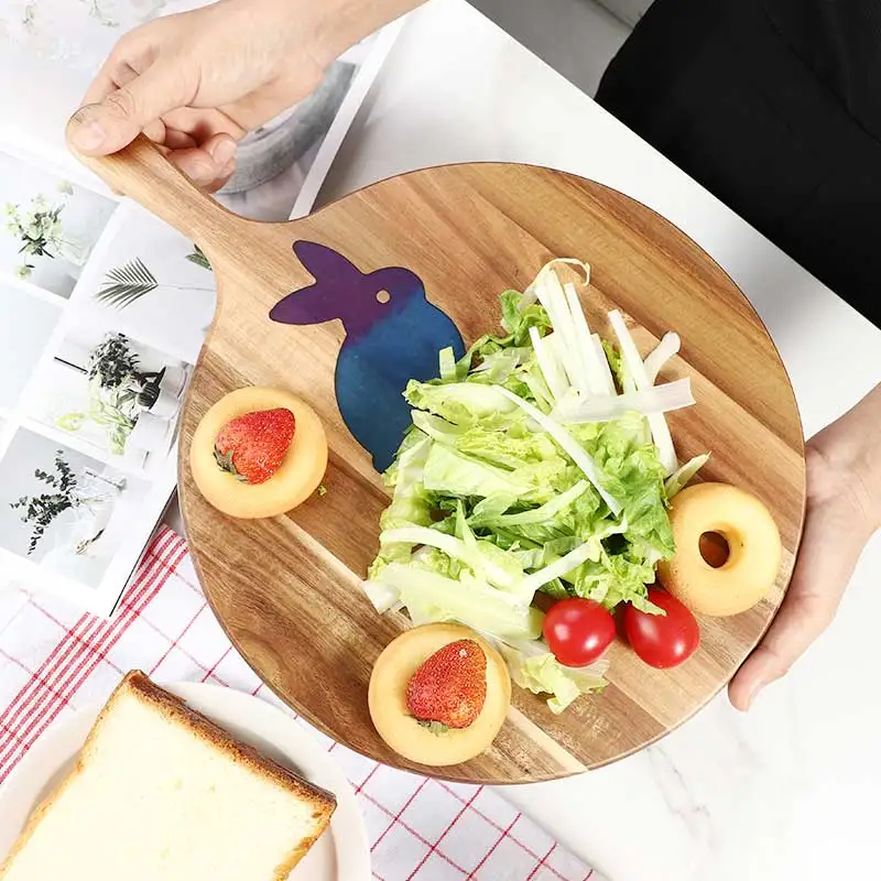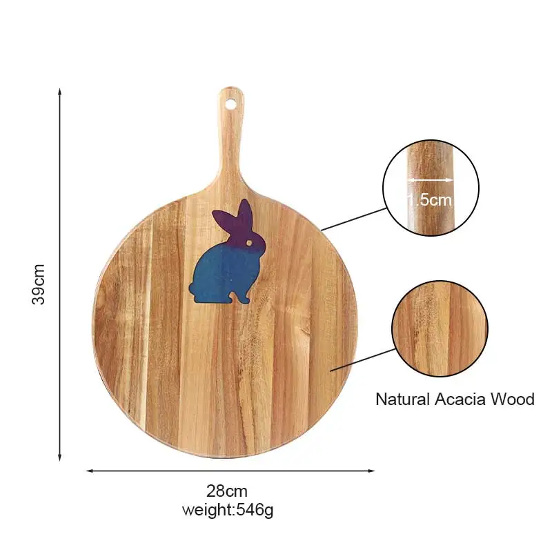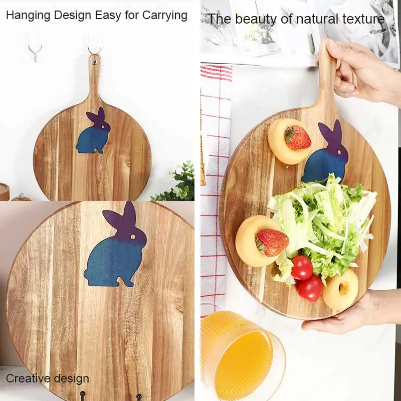 Custom Resin Rabbit Design Acacia Wood Round Cutting Board With Handle Pizza Tray Serving Board | ||||||||