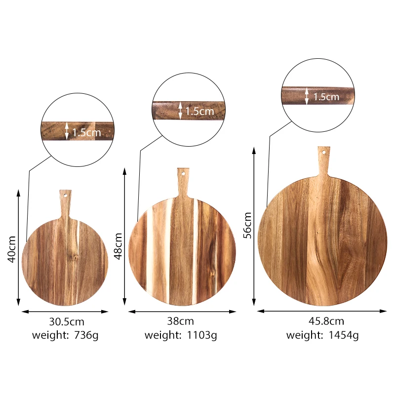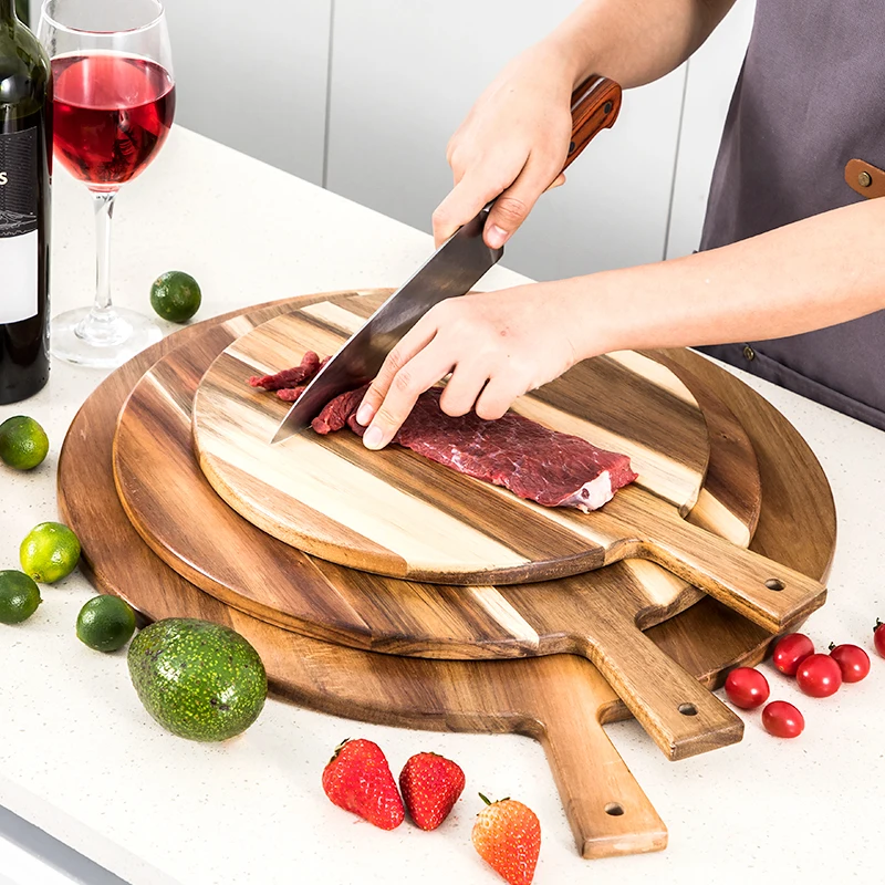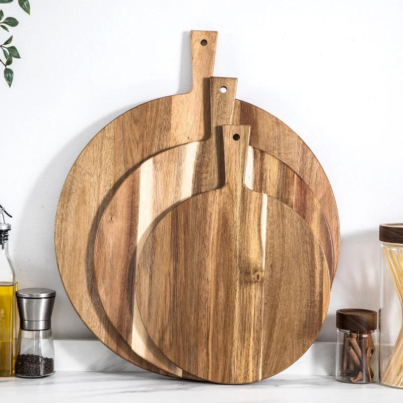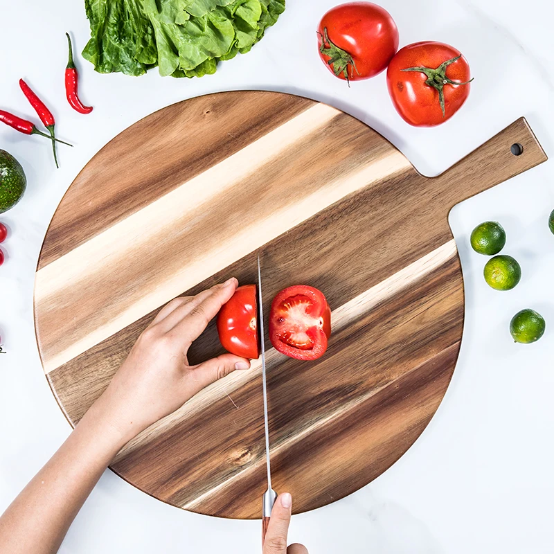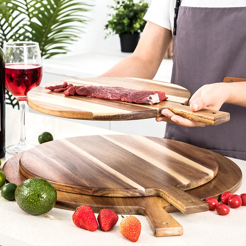 Round Acacia Wooden Pizza Bread Serving Board Cutting Board with Handle | ||||||||