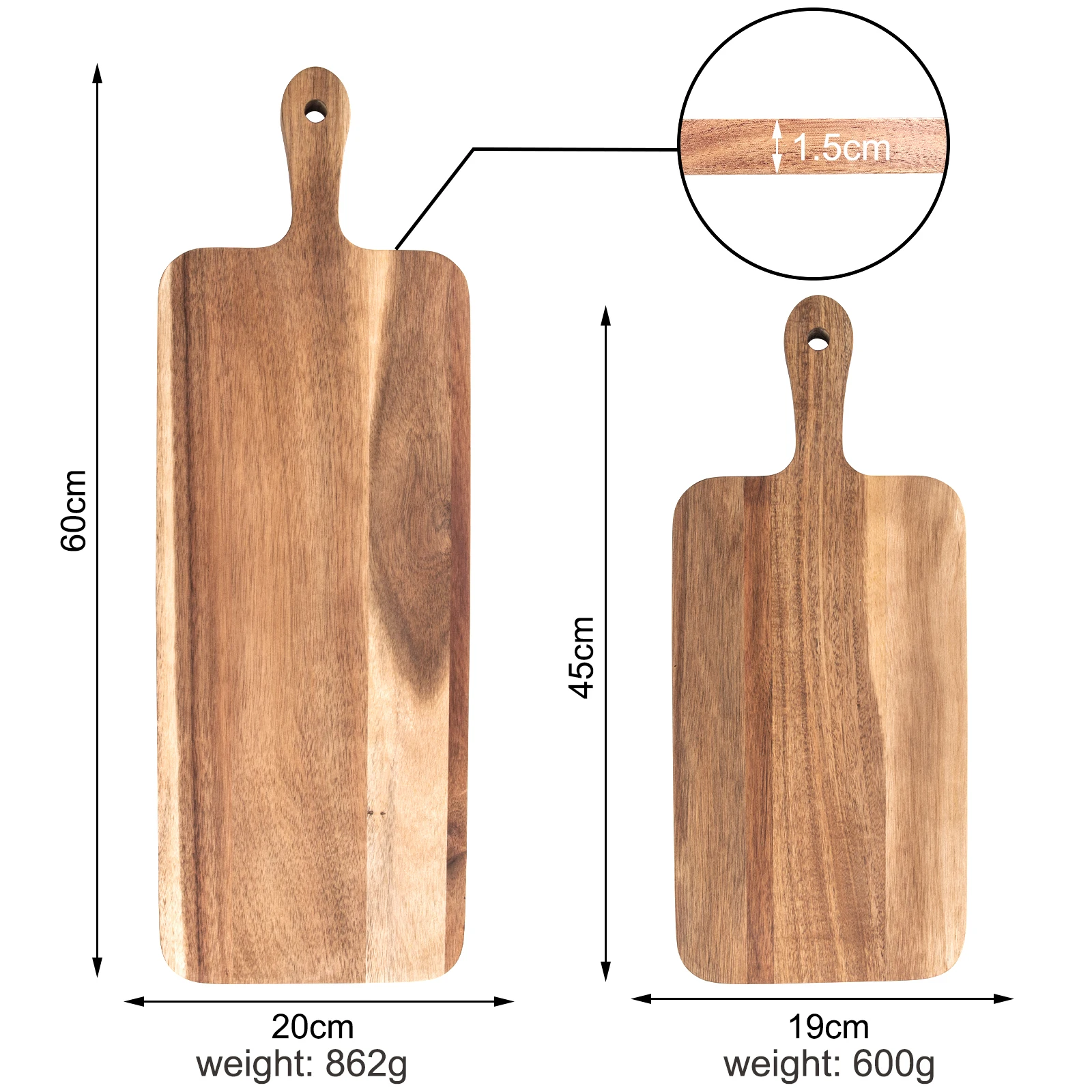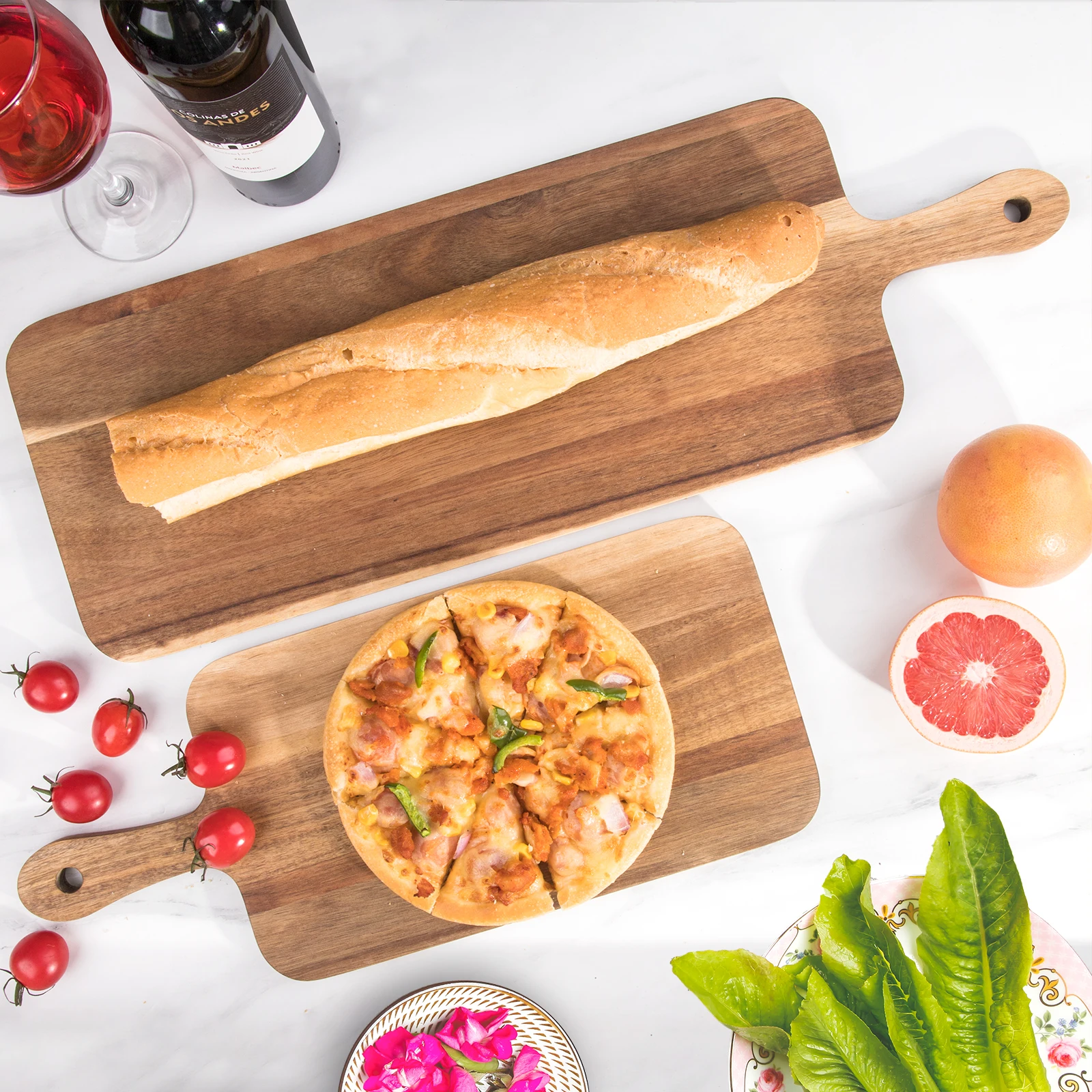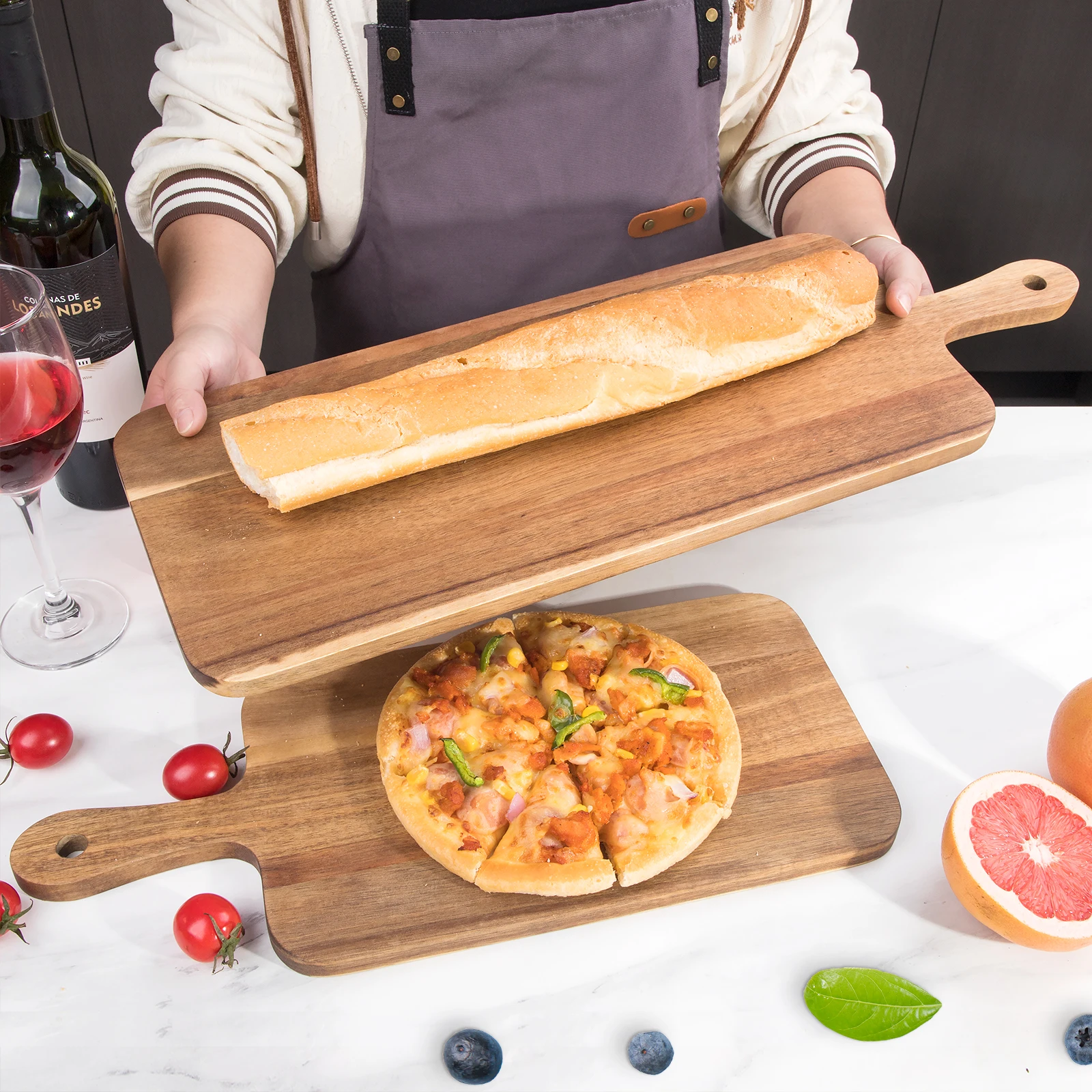 Wholesale Price Long Pizza Serving Paddle Board Acacia Wooden Bread Cutting Boards with Handle | ||||||||