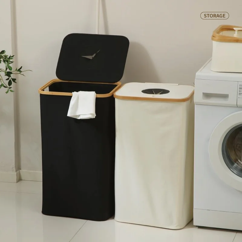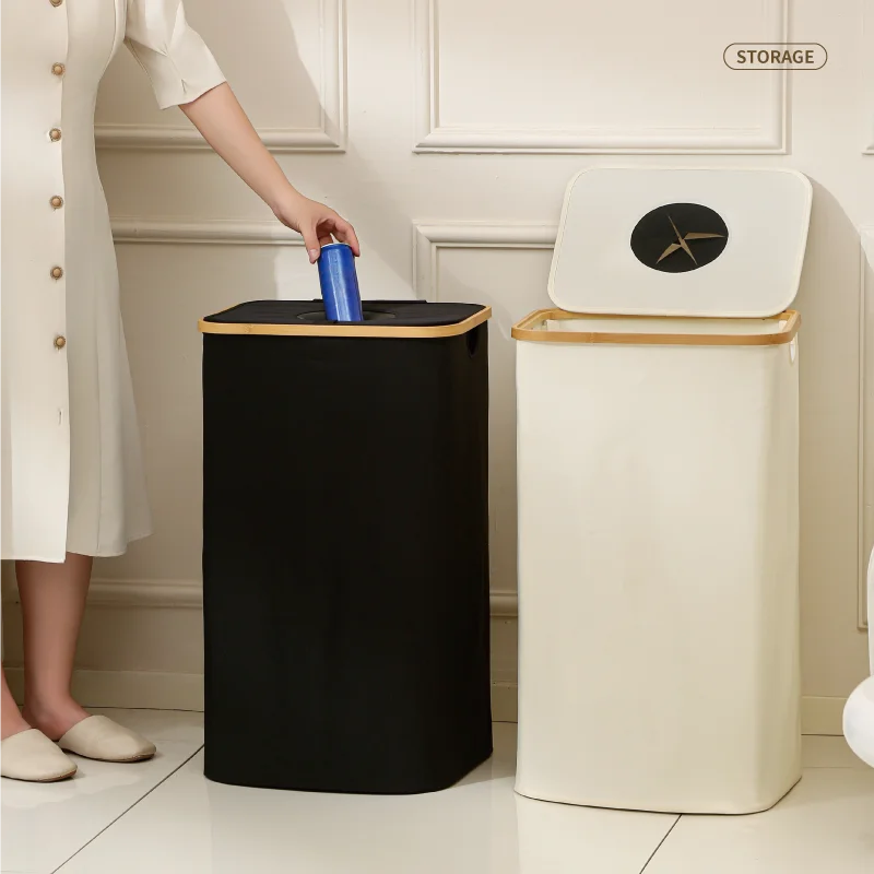 Classical Solid Bamboo Oxford Laundry Basket Rubbish Bin with Lid Household Kitchen Organizer Recycling Bottle Bin
