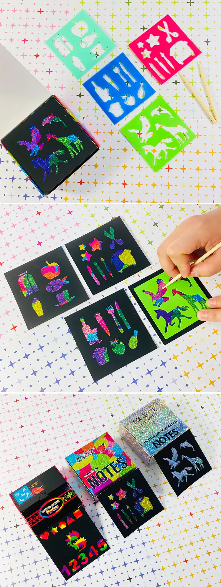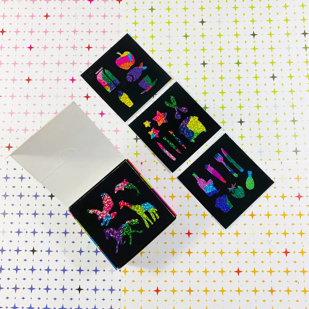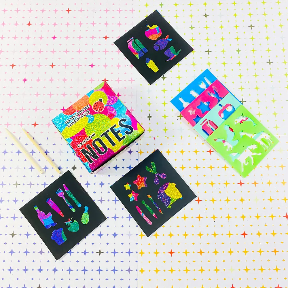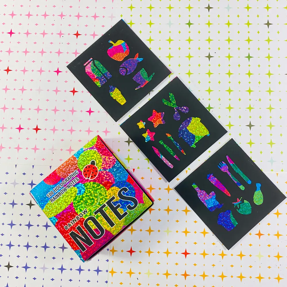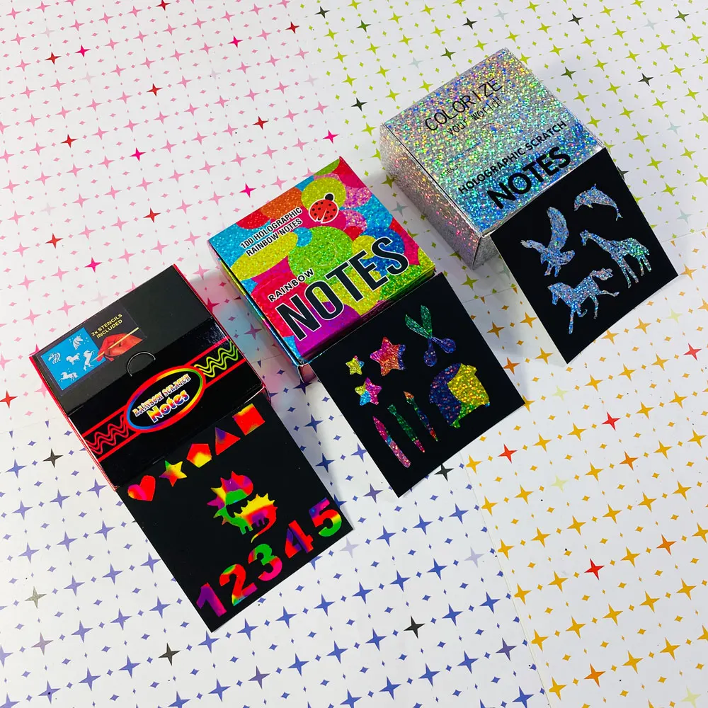 Products Name | GF 100 Holographic Rainbow Notes Laser Scratch Paper Sets Mini Art Notes Creative DIY Arts Crafts Kids Rainbow Scratch Paper | |||||