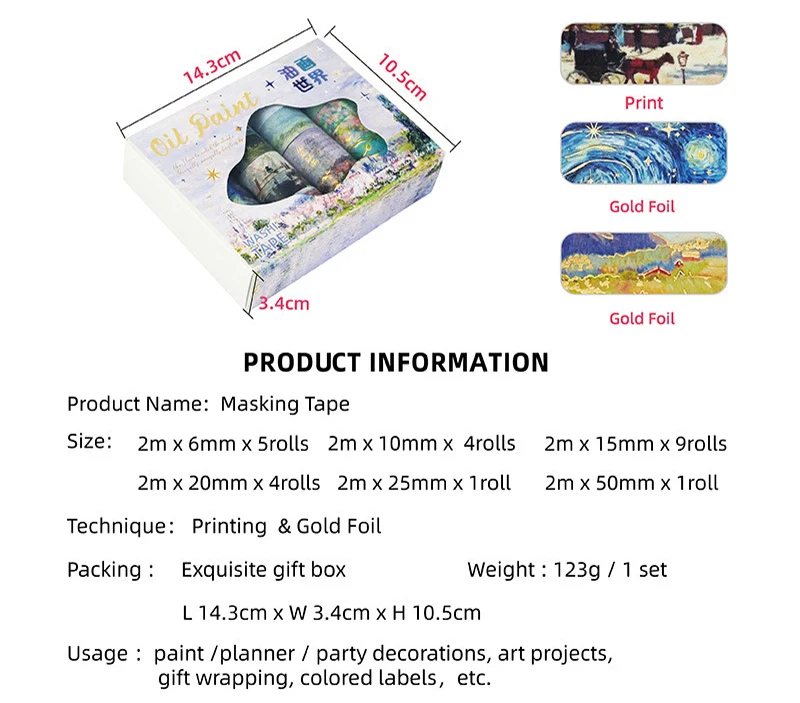 Products Name | GF Popular Oil Painting Gold Foil Decorative Masking Tape 24 Rolls Washi Tape Set for Bullet Journal Planner DIY Arts Crafts | |||||