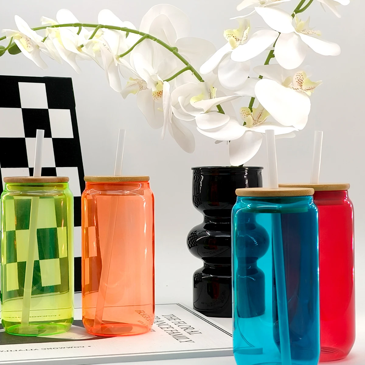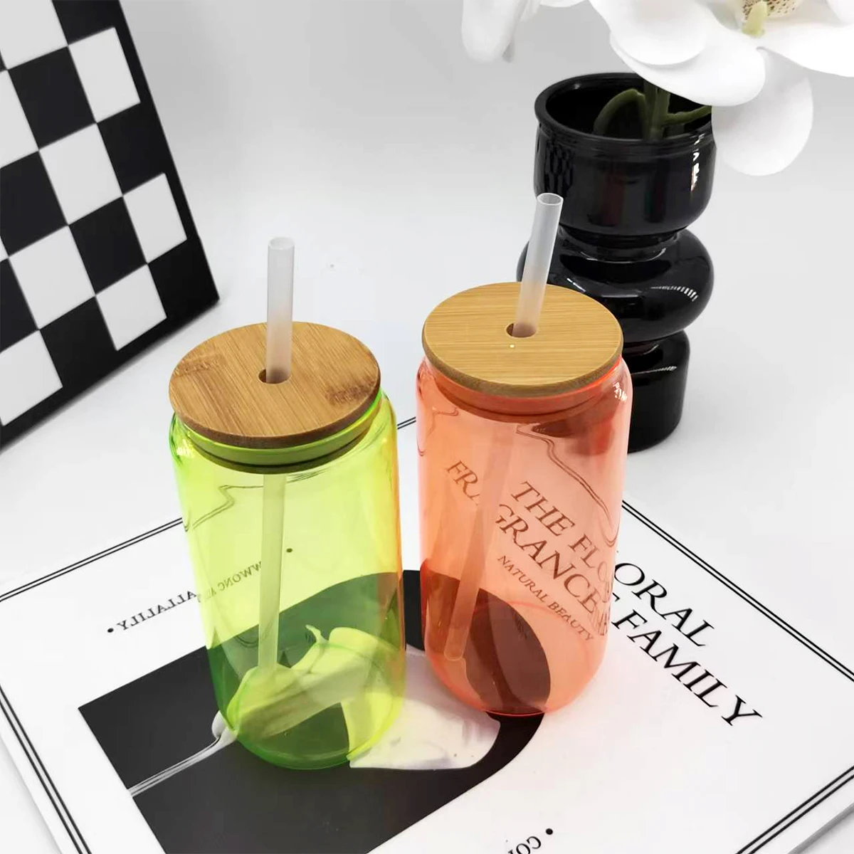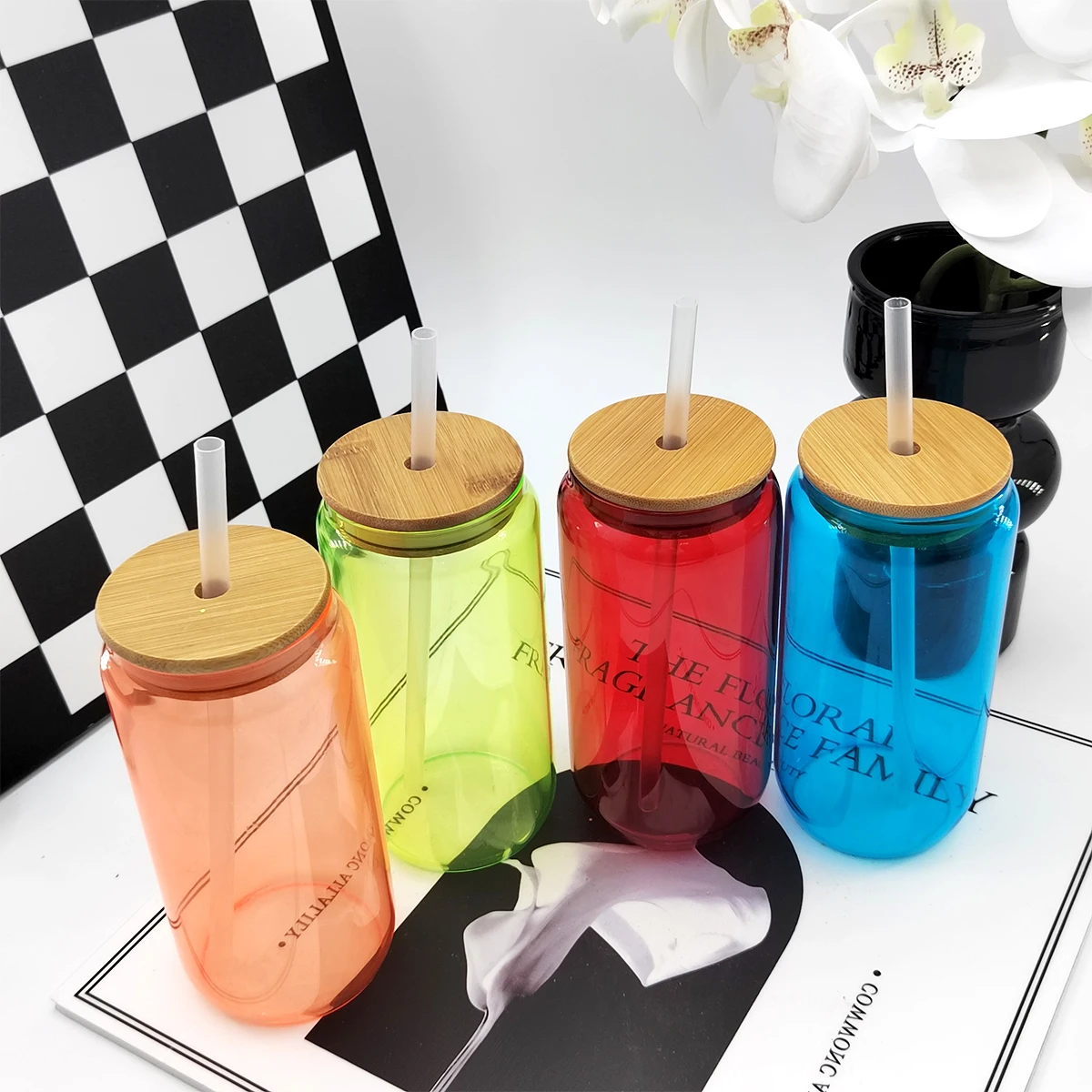 New Product Custom Color 16oz High Quality Borosilicate Tumbler Soda Beer Can Shaped Glass Juice Cup With Bamboo Lid