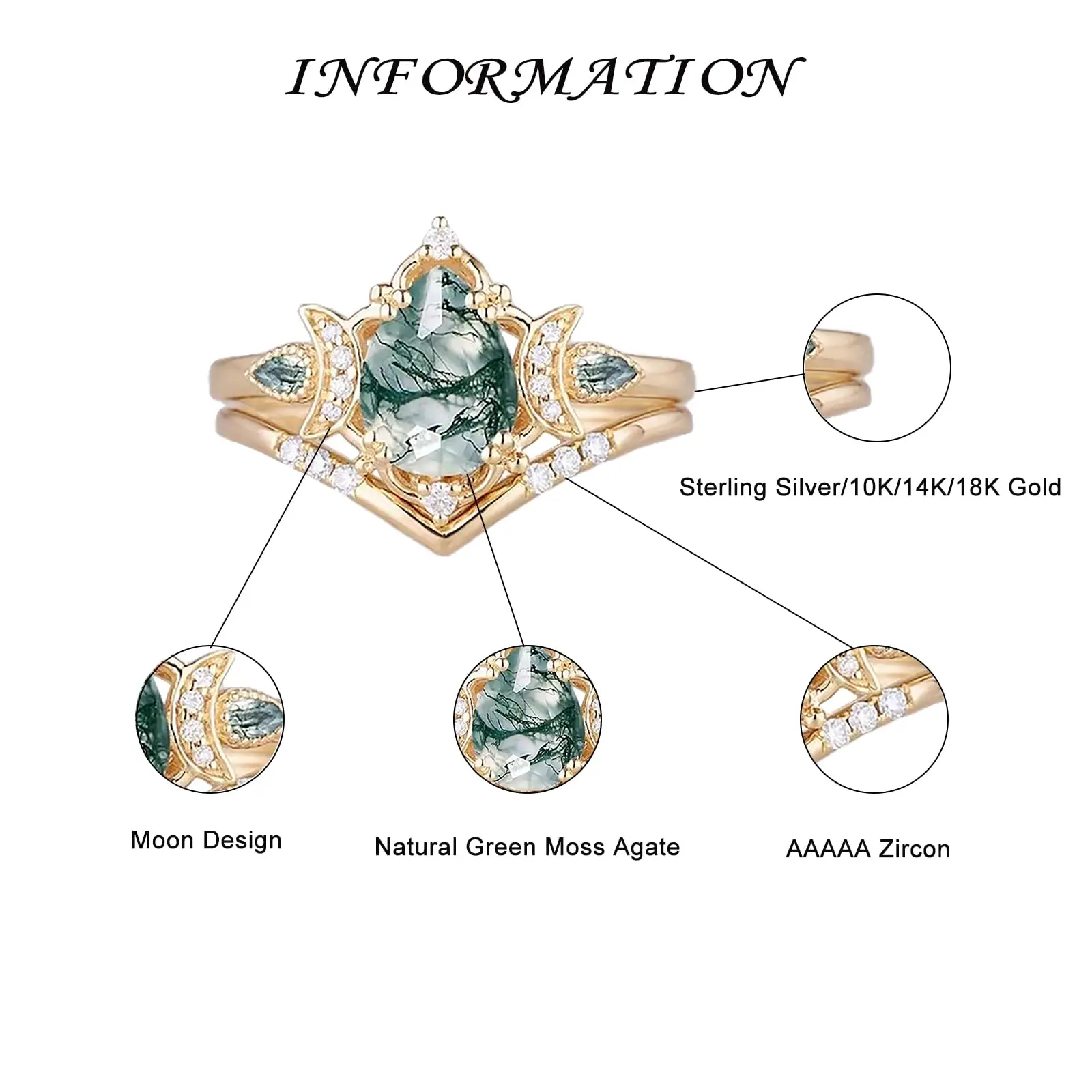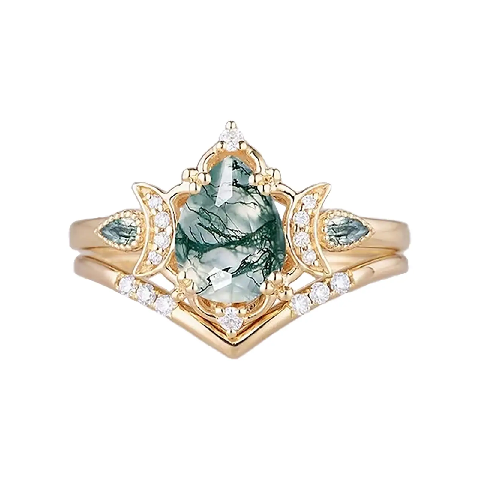 Hot Sale Jewelry 925 Sterling Silver Cubic Zircon Ring Crescent Moon Pear Moss Agate Ring