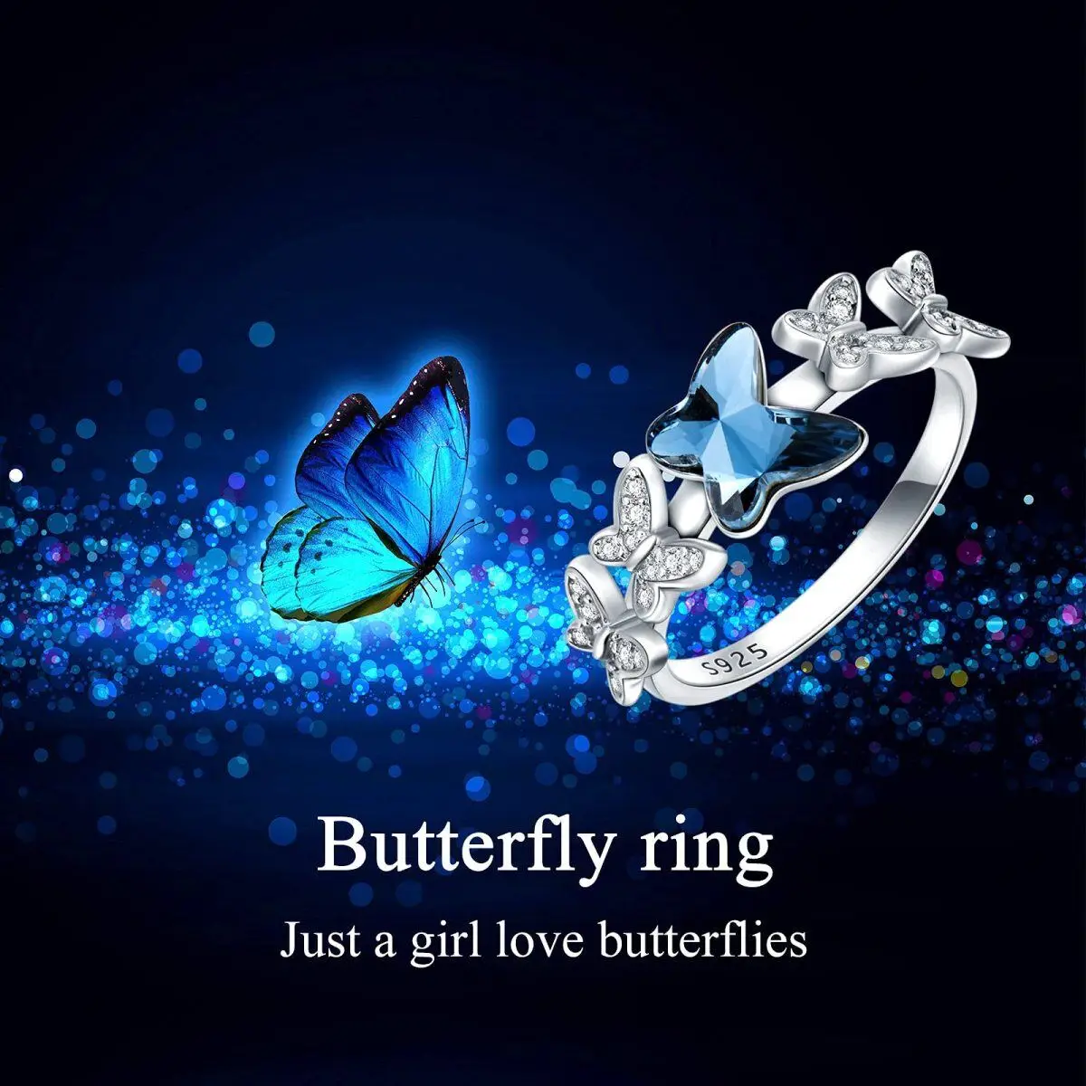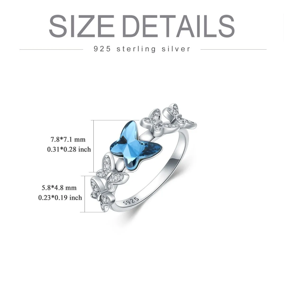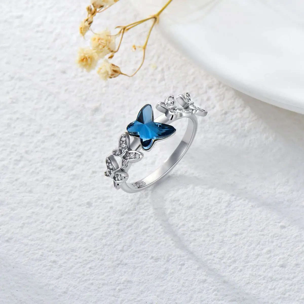 New Design 925 Sterling Silver Rhodium Plated Blue Crystal Butterfly Zircon Ring For Women