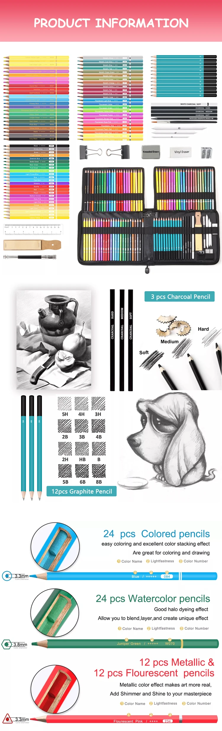 Products Name | GF Factory Wholesale Pop-up Nylon Bag Packed 102pcs Assorted Colors Artist Colored Pencil Drawing Art Set | |||||