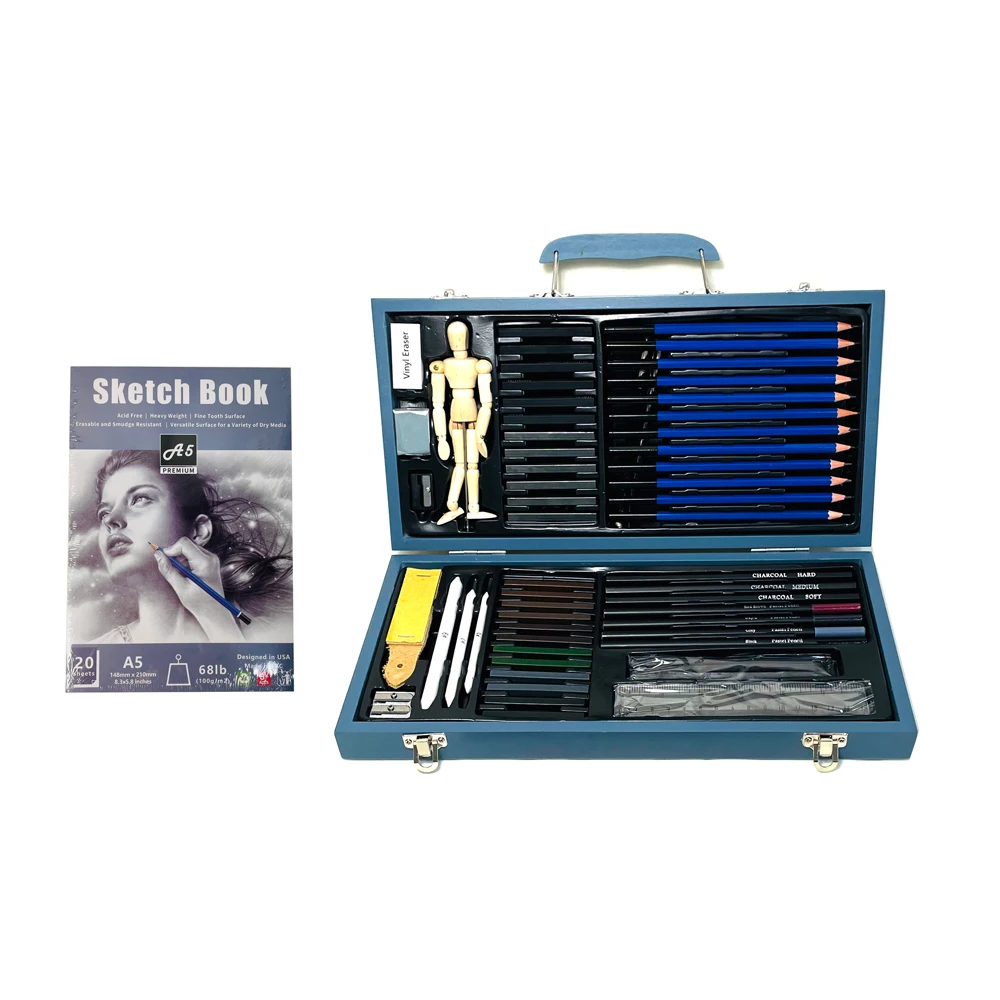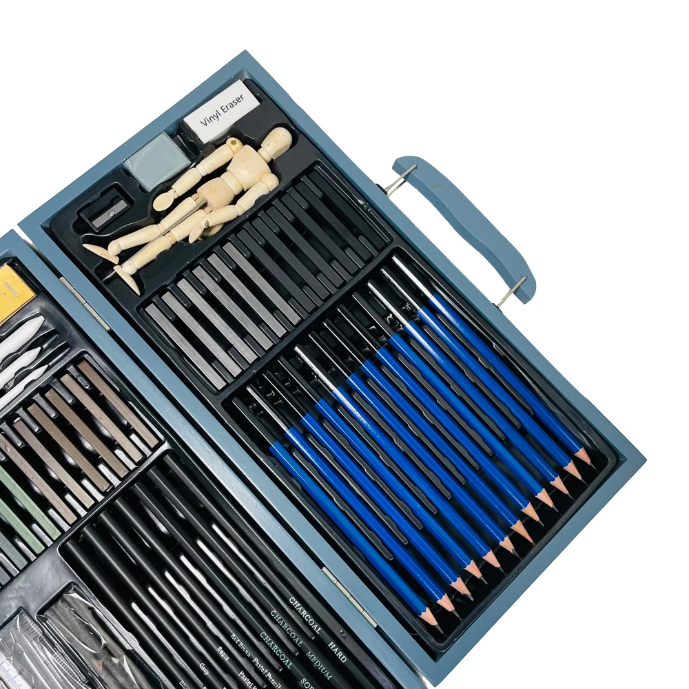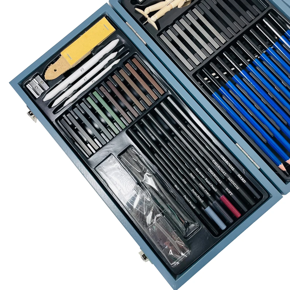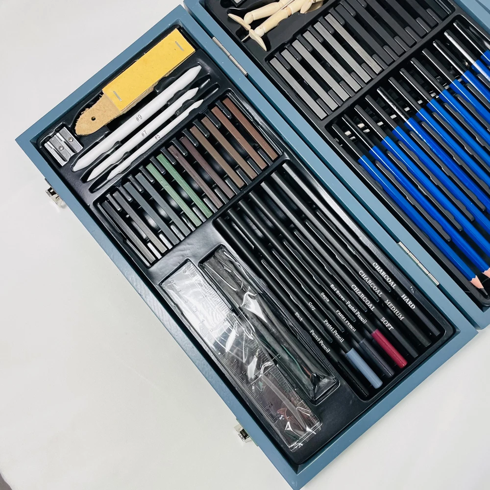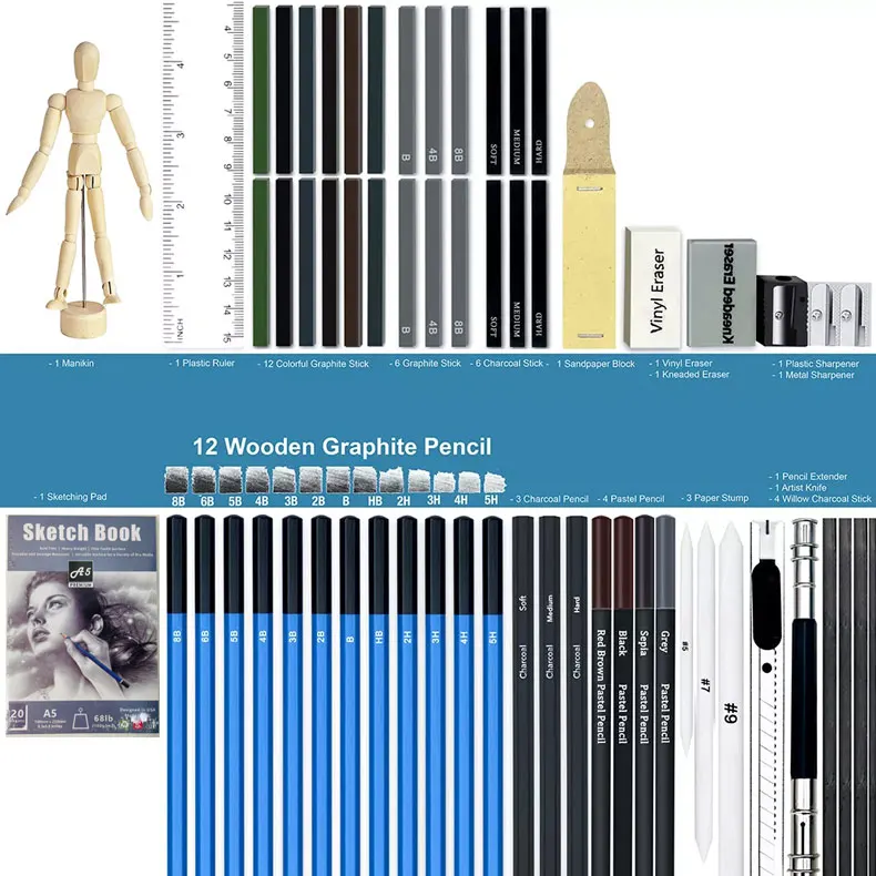 Details | 12 Sketching Pencil(5H,4H,3H,2H,HB,B,2B,3B,4B,5B,6B,8B) 12 Pastel Stick 6 Graphite Stick(6B,4B,2B,B,HB,2H) 6 Charcoal Stick(Soft,Medium,Hard) 4 Pastel Pencil 3 Charcoal Pencil(Soft,Medium,Hard) 3 Blending Stump 1 Vinyl Eraser 1 Kneaded Eraser 1 Sharpener 1 Sandpaper Block 1 Manikin 1 Sketching Pad 4 Willow Stick 1 Ruler 1Extender 1 metal knife | |||||