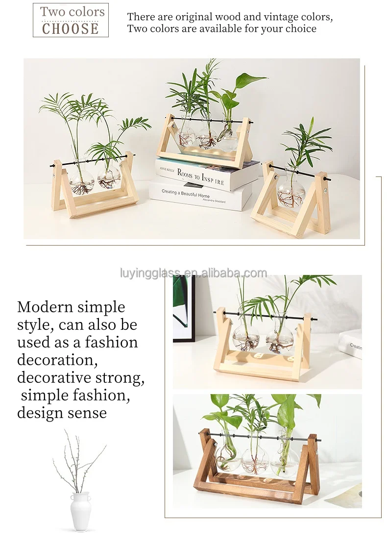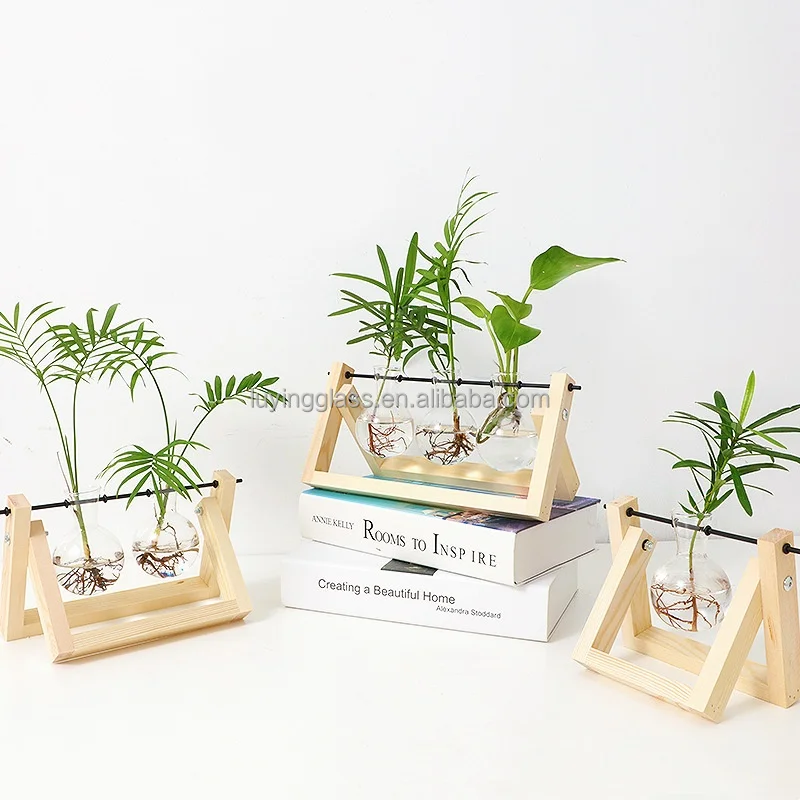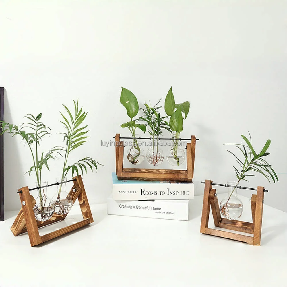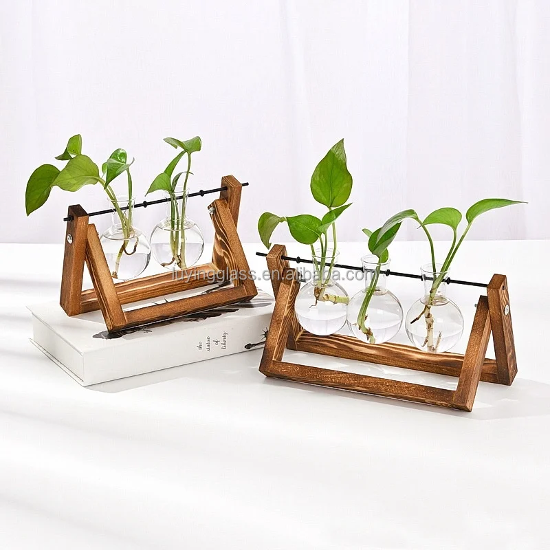 Home Office Decoration Purify Air Artificial Plant Flowers Spherical Hydroponic Glass Vase with Wooden Stand