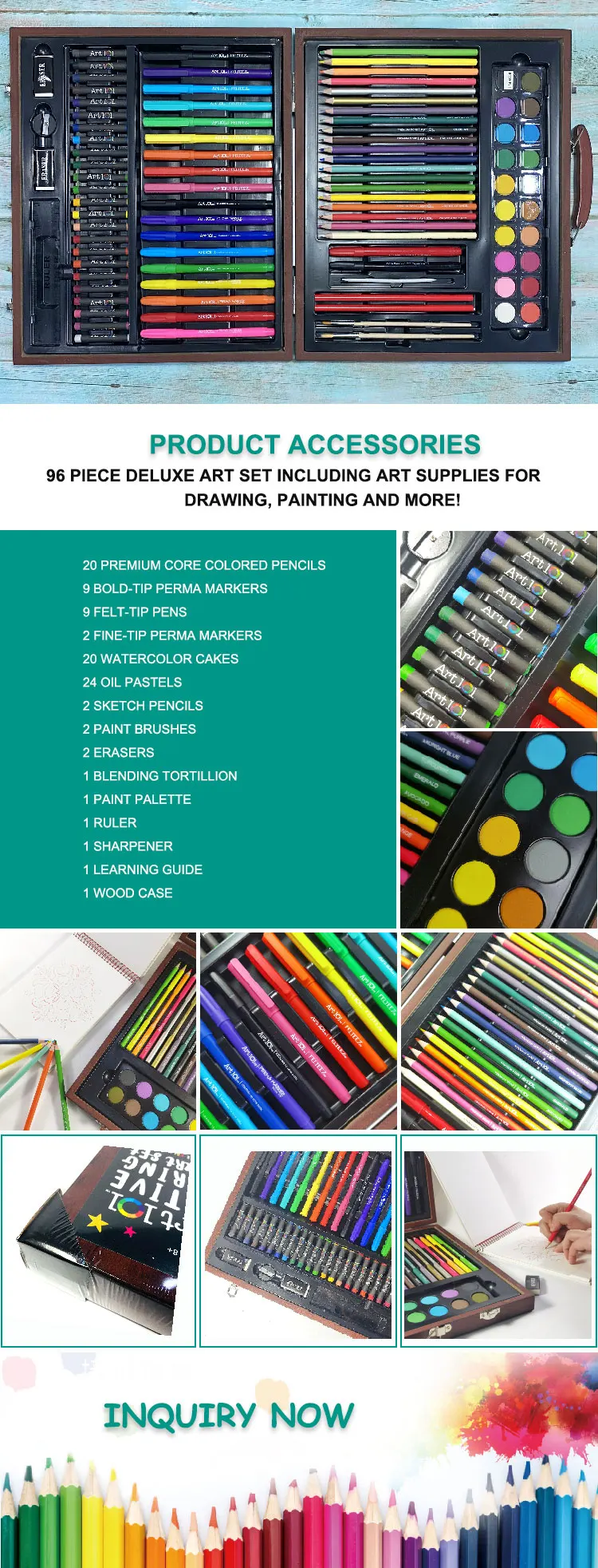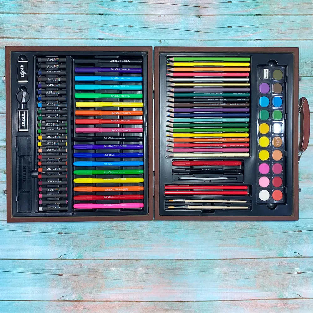 * Provides an artist with a wide range of quality materials in a handsome wood case with silver metal carry handle