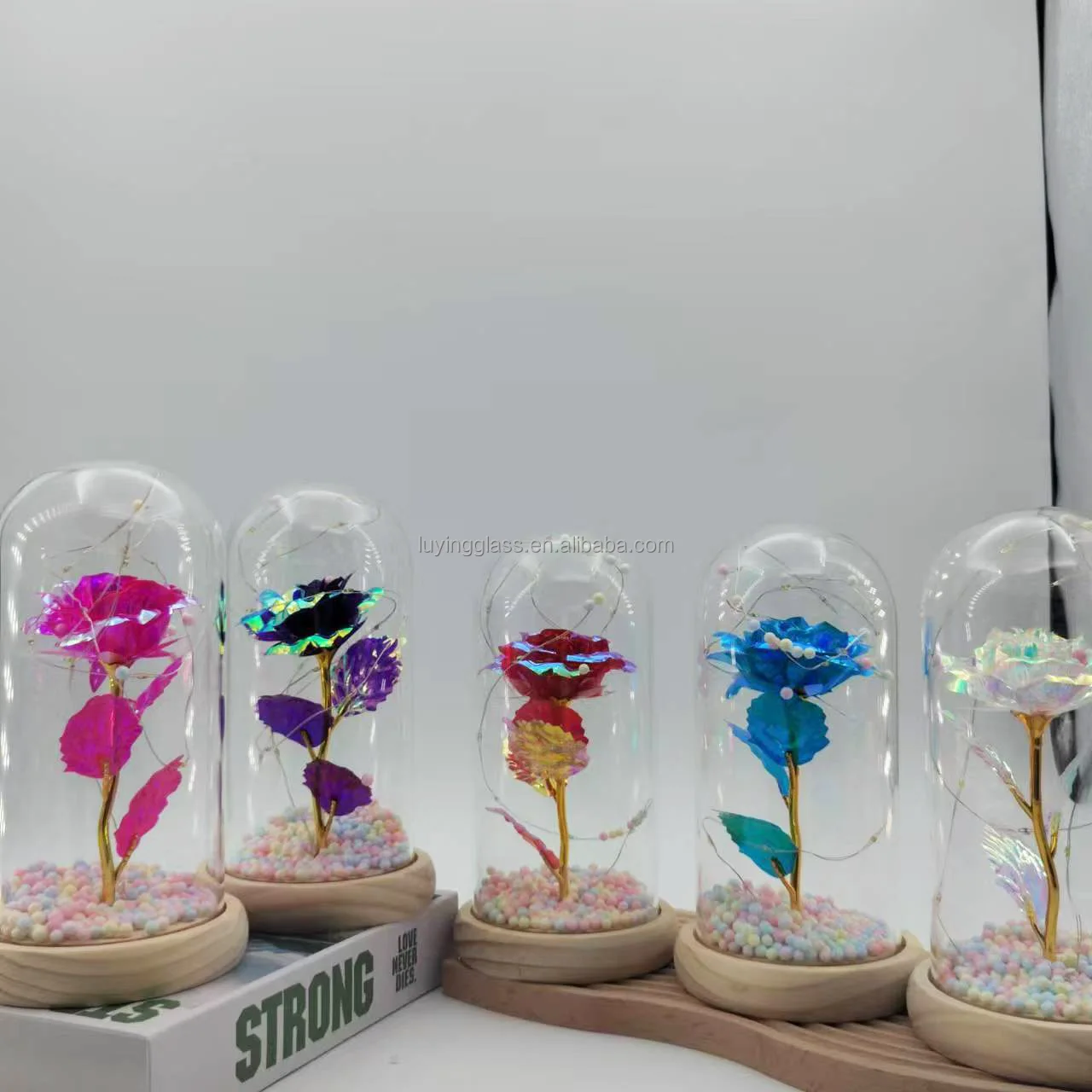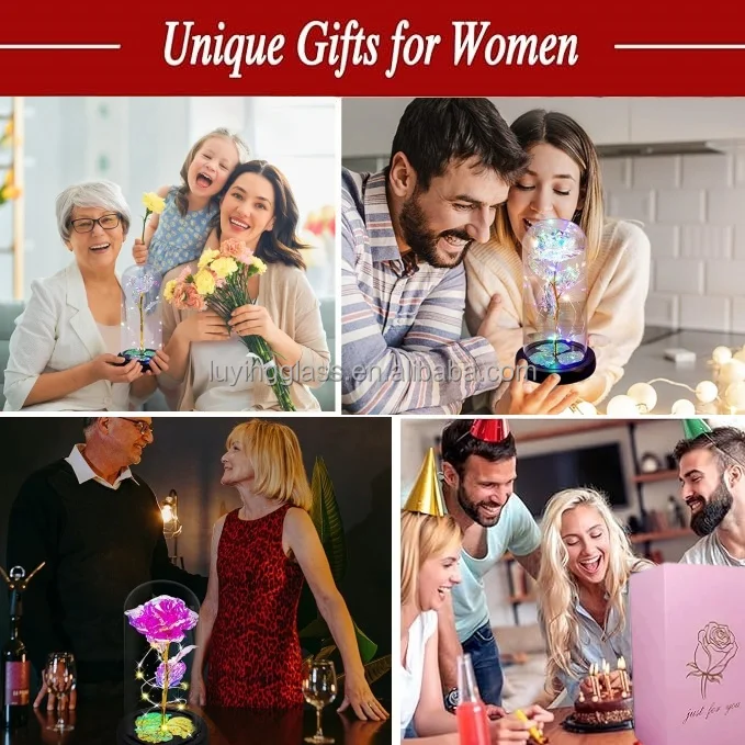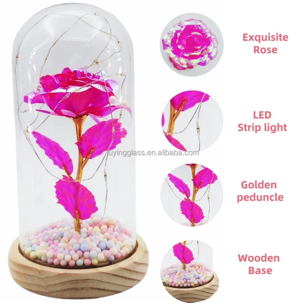 Valentine's Day Gifts Glass Dust Cover Artificial Simulation 24k Gold Foil Rose Glass Dome Decorative Flowers with Led Lamp