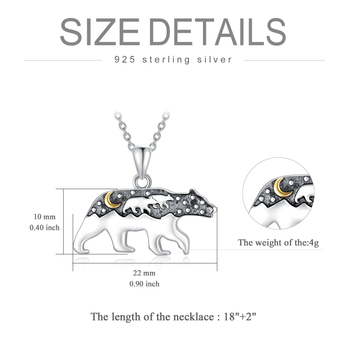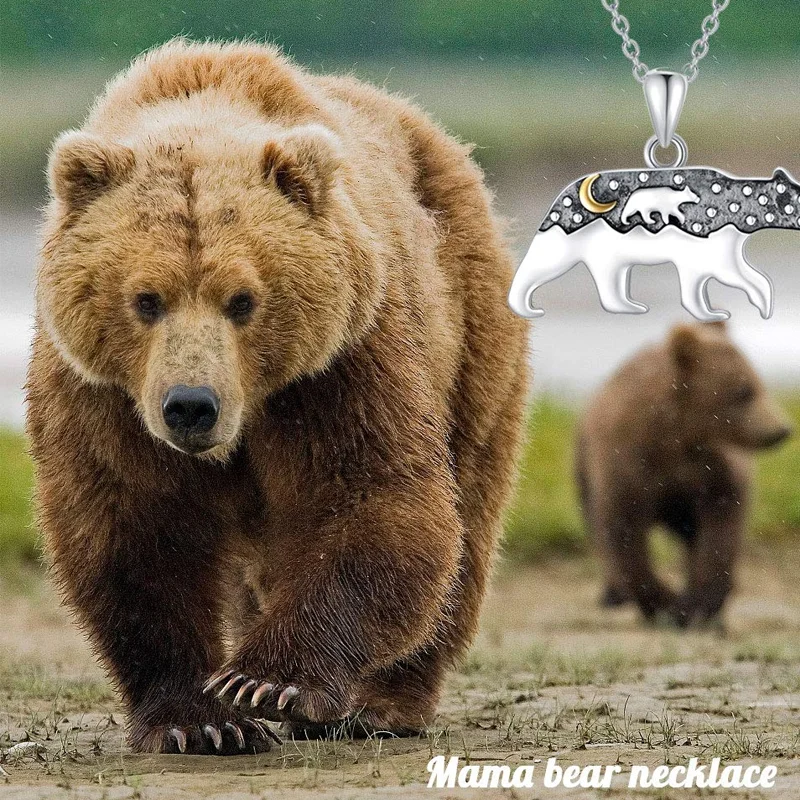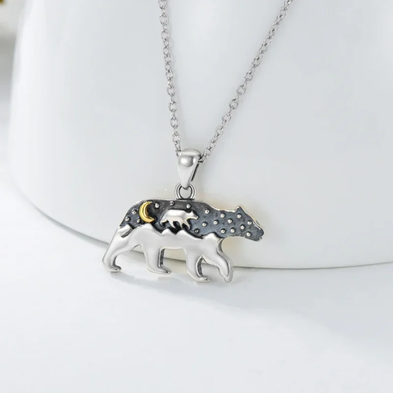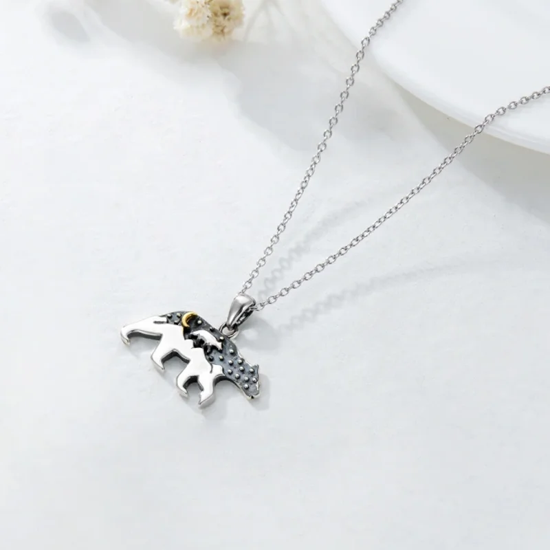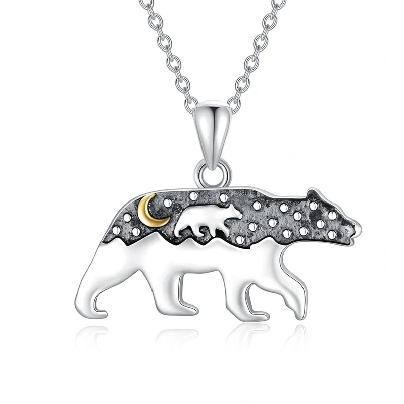 Fashion Cute Animal Jewelry For Women 925 Sterling Silver Two Tone Mama Bear & Moon Pendant Necklace