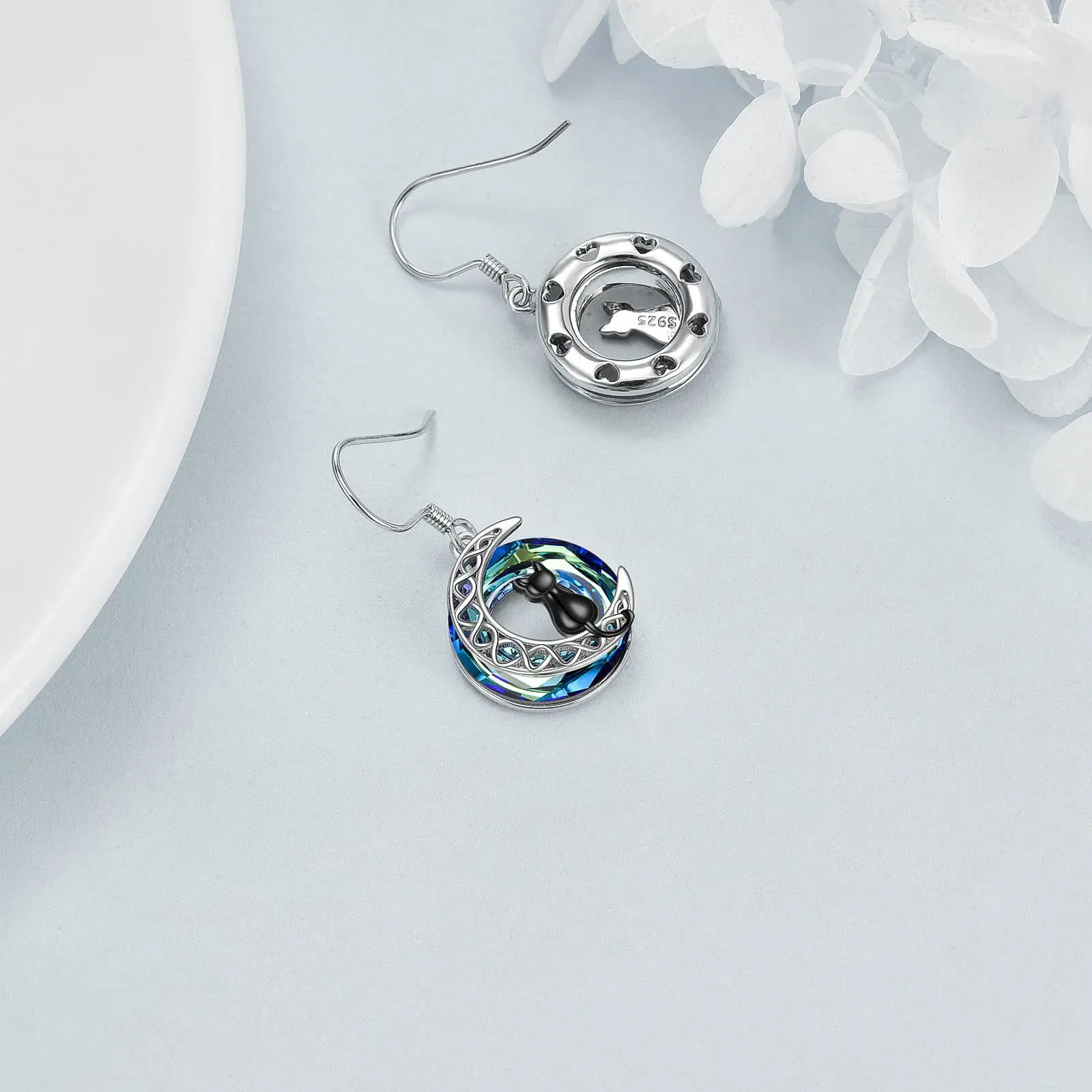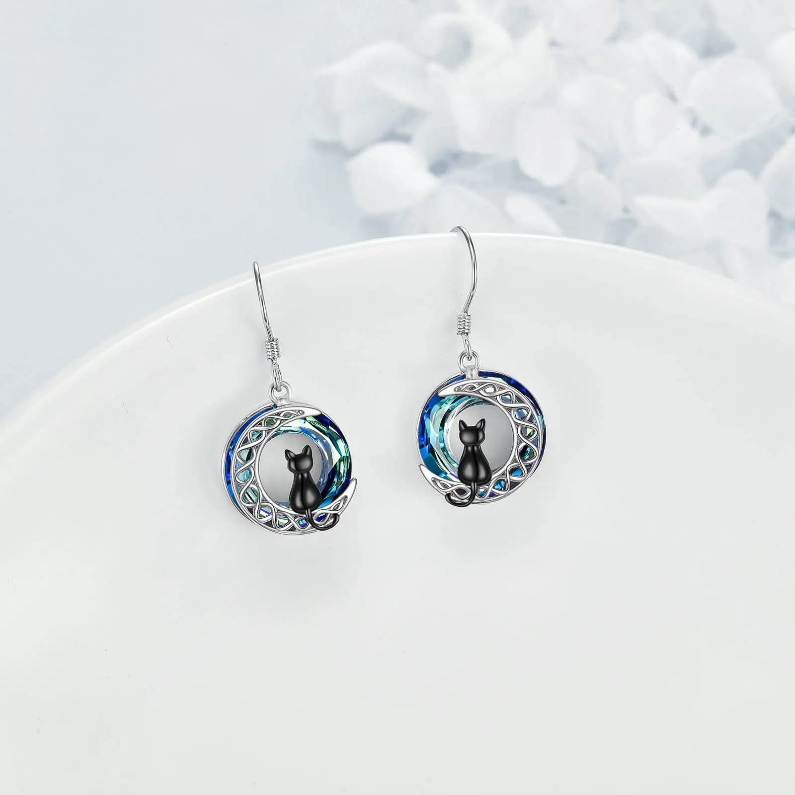 Crystal Black Cat Moon Celtic Knot 925 Sterling Silver Earrings for Women