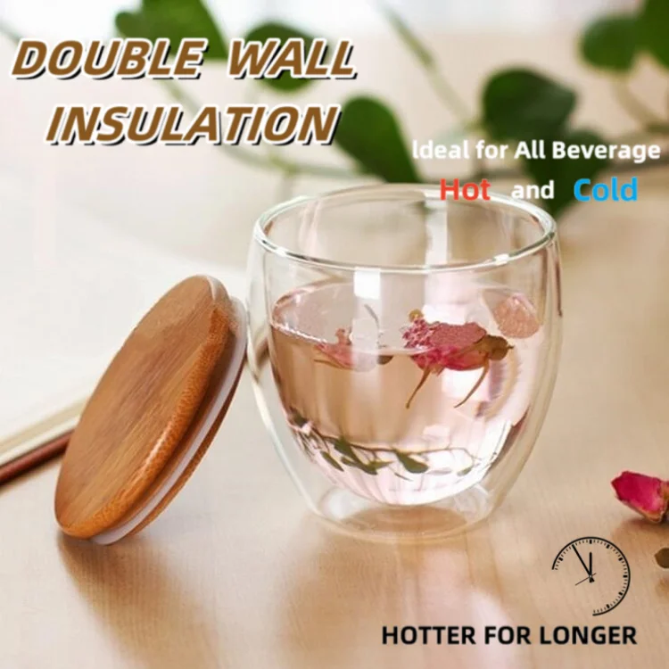 double wall glass tea cup with bamboo lid