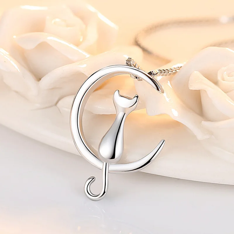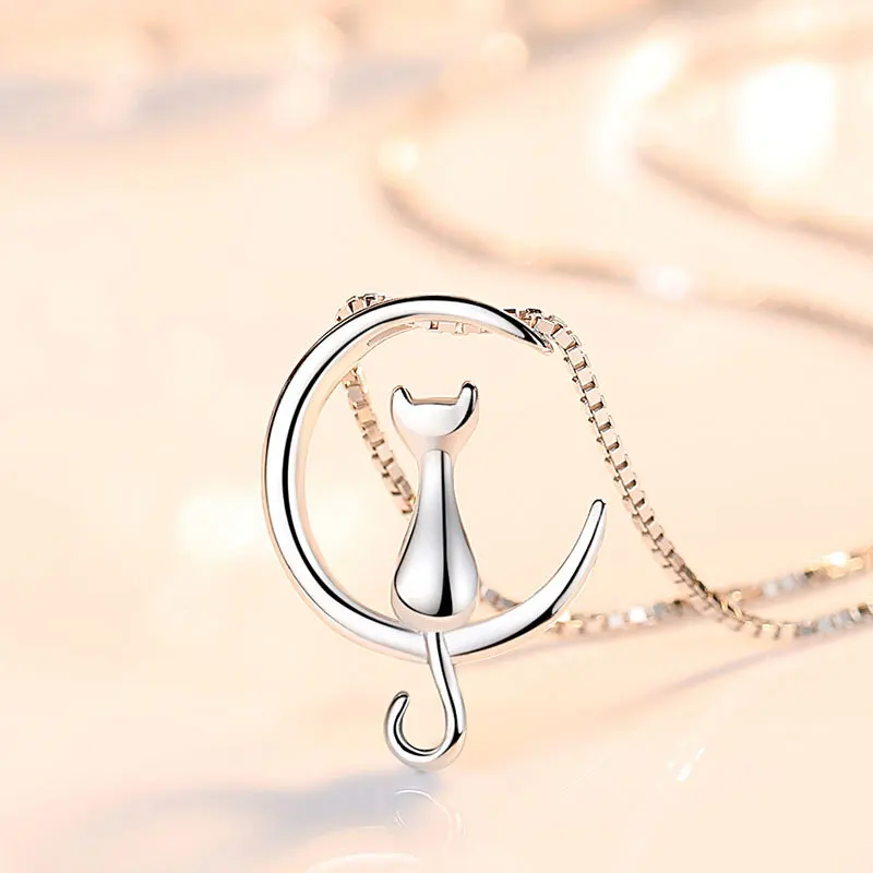 100% 925 Sterling Silver Cat Moon Necklace Meditation Women Jewelry Silver 925 Chain & Pendant Valentine Gift