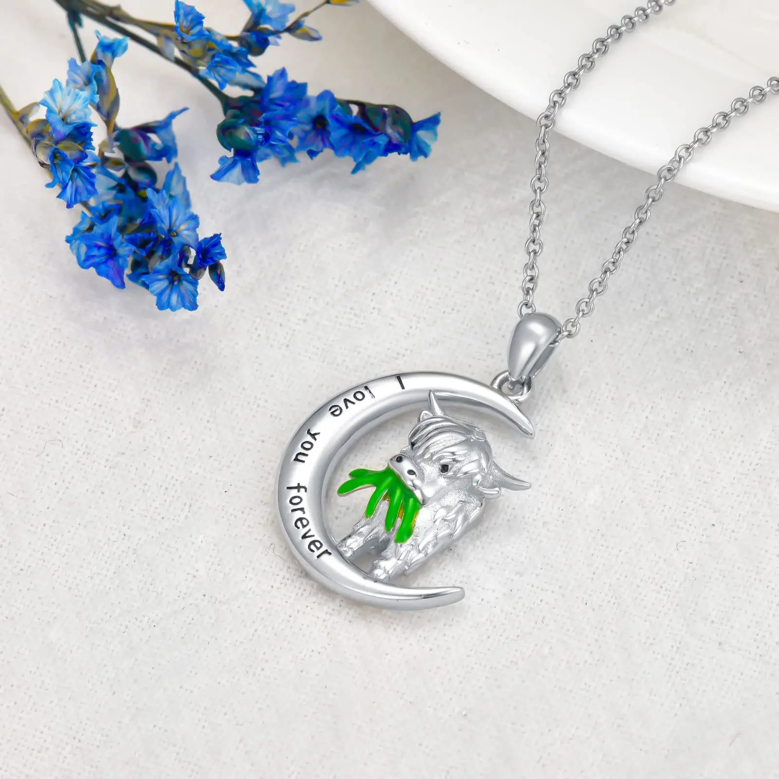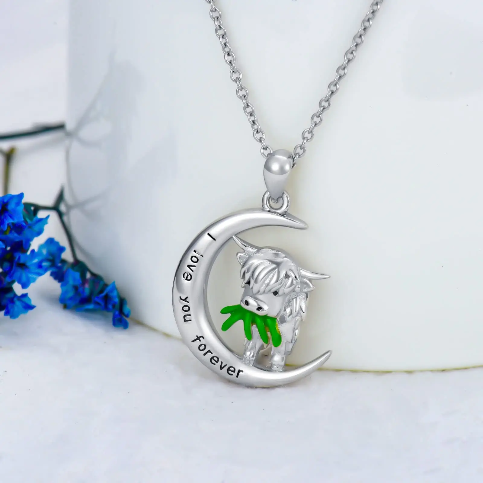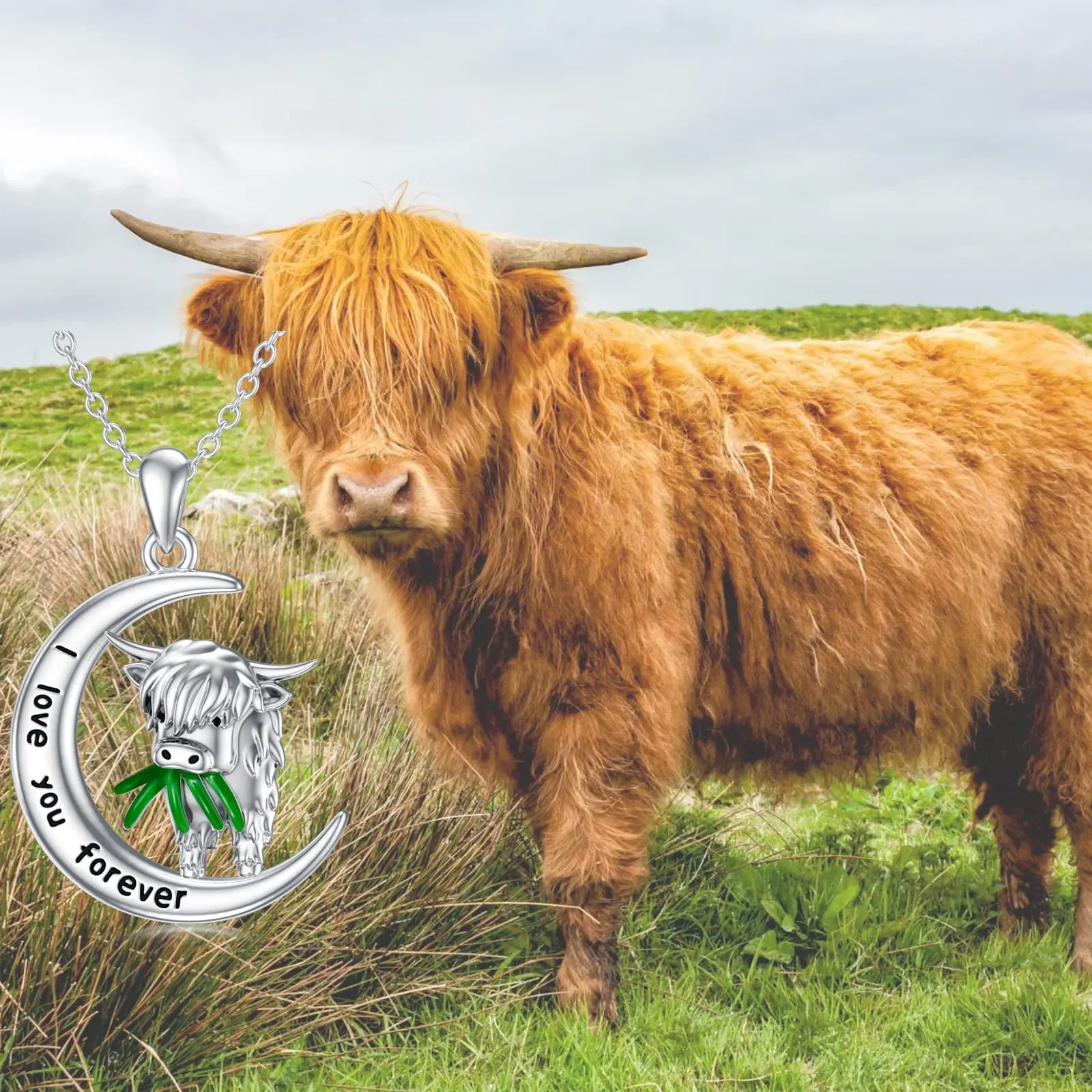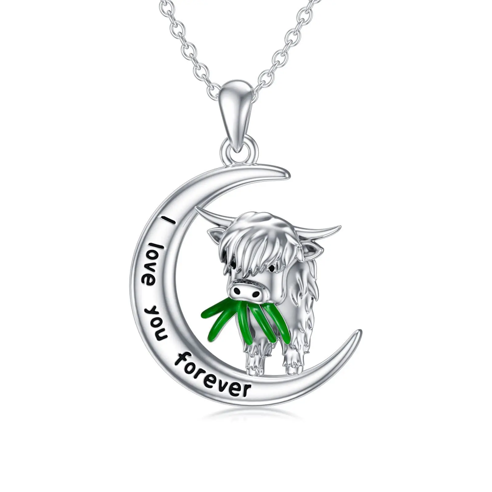 925 Sterling Silver moon Scotland highland Cow eat grass necklace