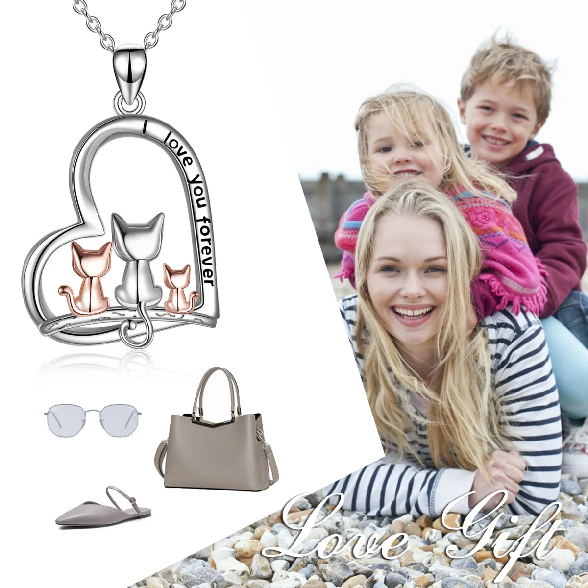 Fashion Cute Animal Jewelry For Women 925 Sterling Silver Two Tone Cat With Heart Engraved Word Pendant Necklace
