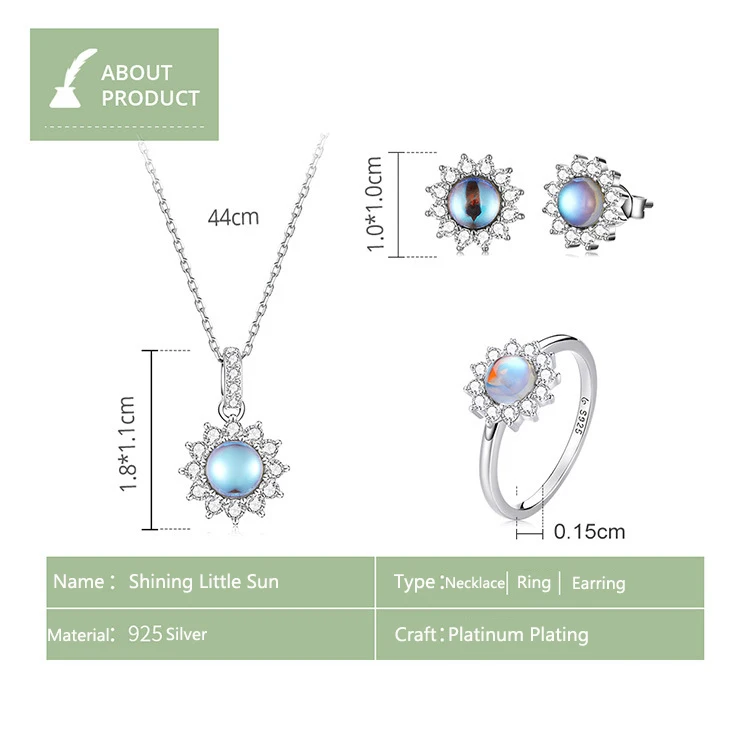Specification | Necklace: 2.8g, Pendant Height And Width: 1.8 * 1.1cm, Chain Length: 44cm (adjustable) Earrings: 1.9g, Height And Width: 1.0 *1.0cm Ring: 1.8g, Ring Width: 0.15cm, Sun: 1.0 * 1.0cm (Manual Measurement, The Actual Goods Specifications May Have A SlightError In Weight, Please Subject To The Actual Weight Of The Goods) |