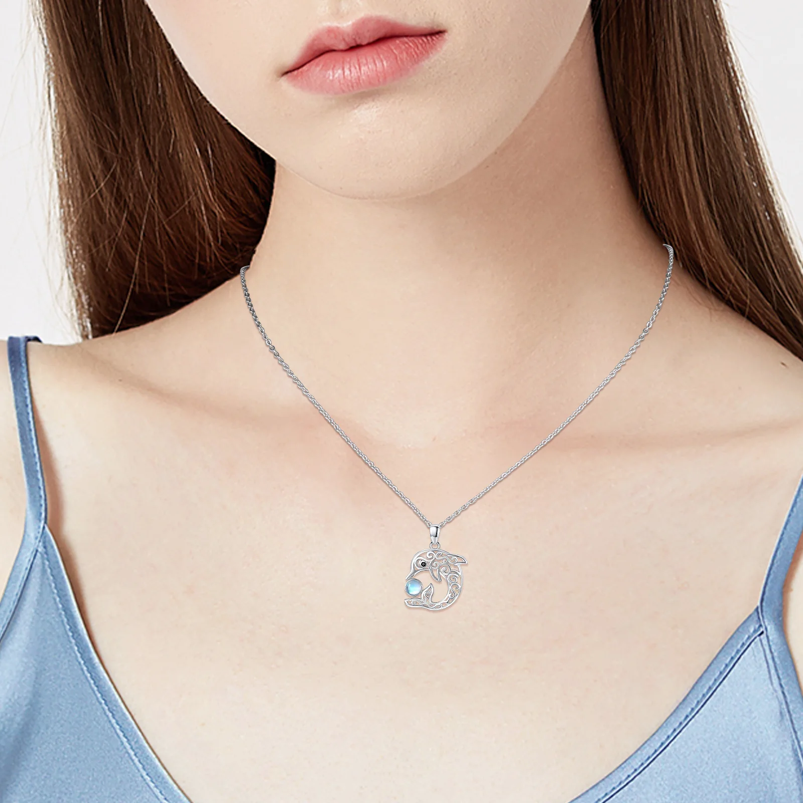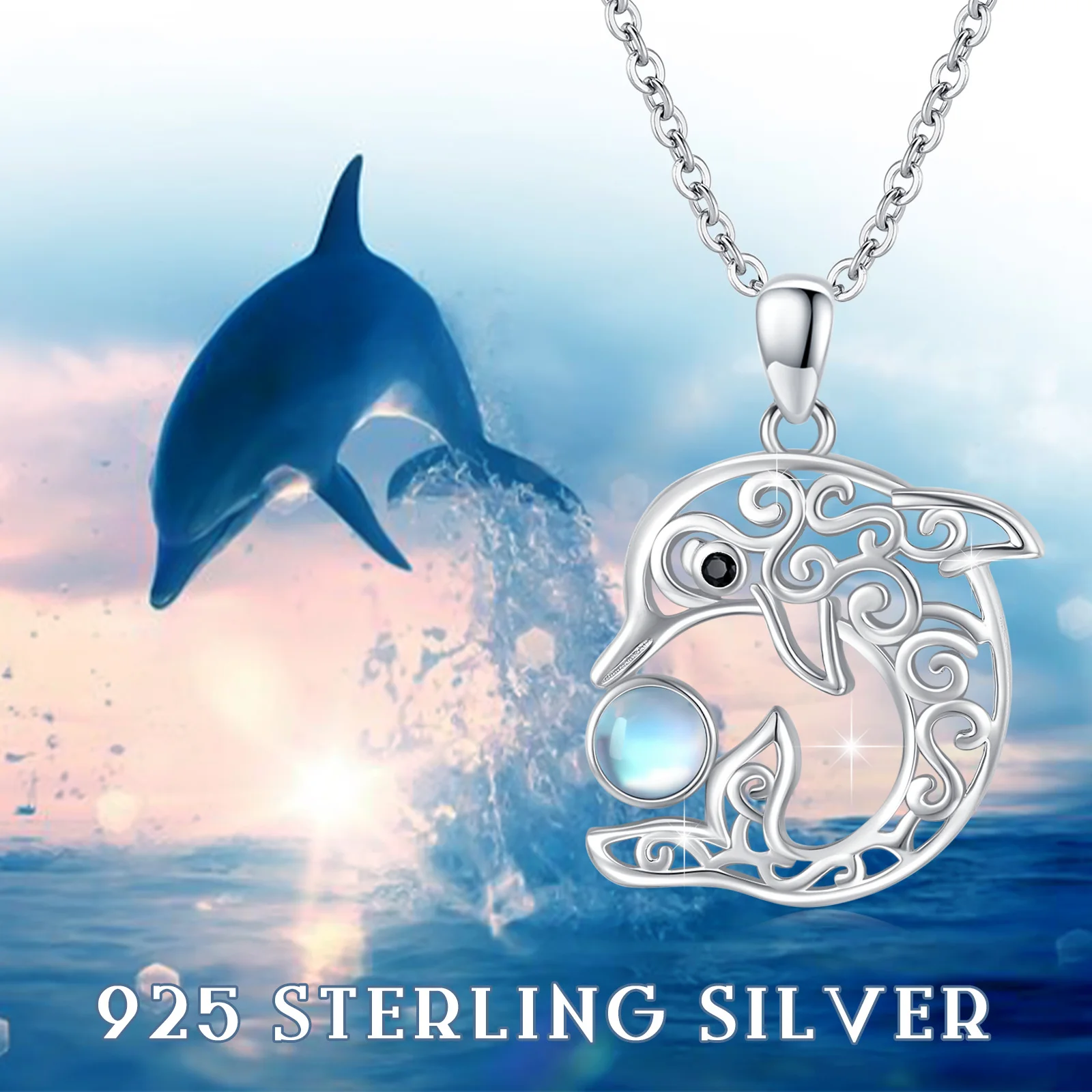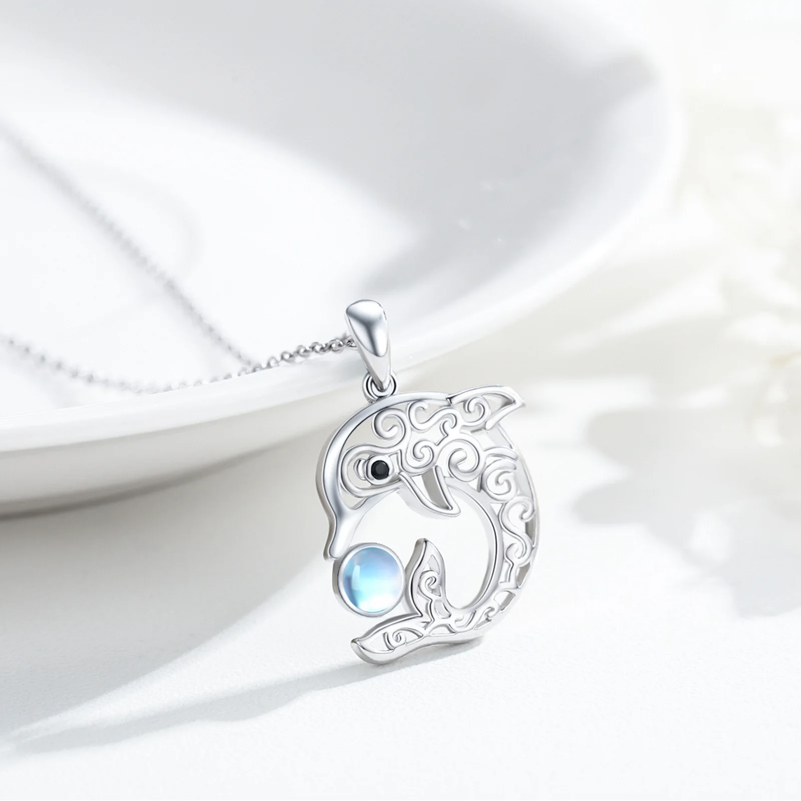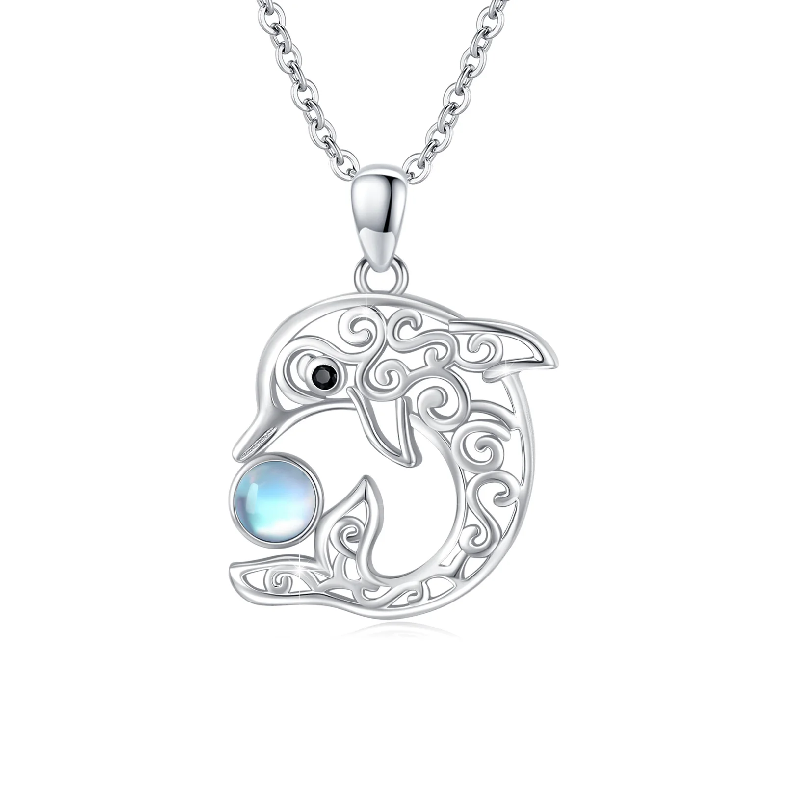 Fine Jewelry 925 Sterling Silver Cute Ocean Animal Celtic Knot Moonstone Dolphin Necklace