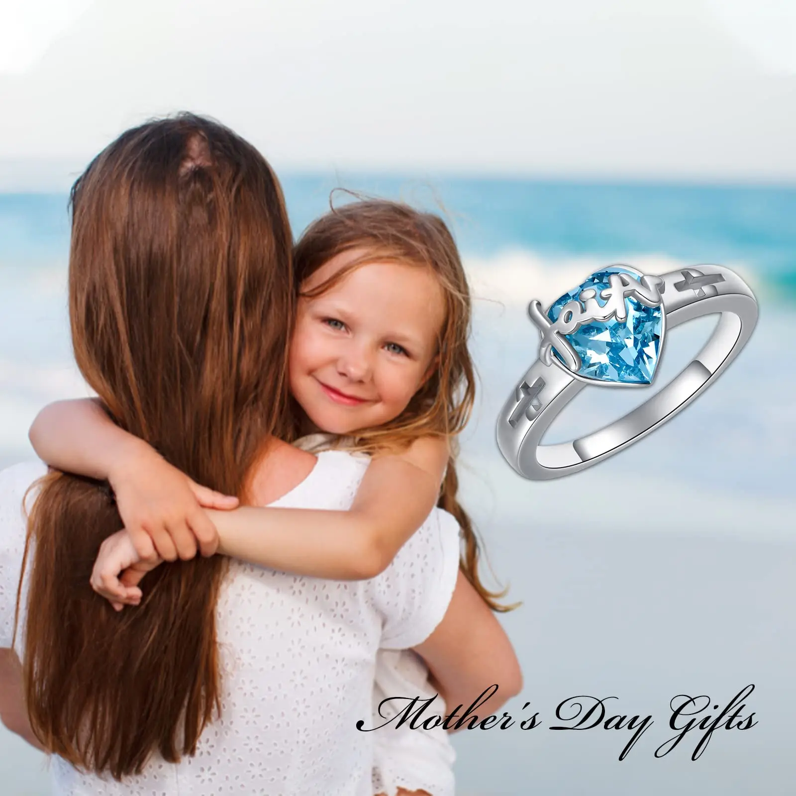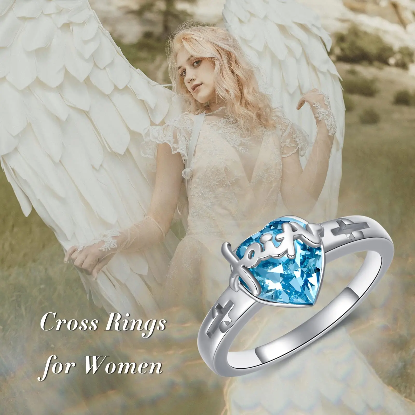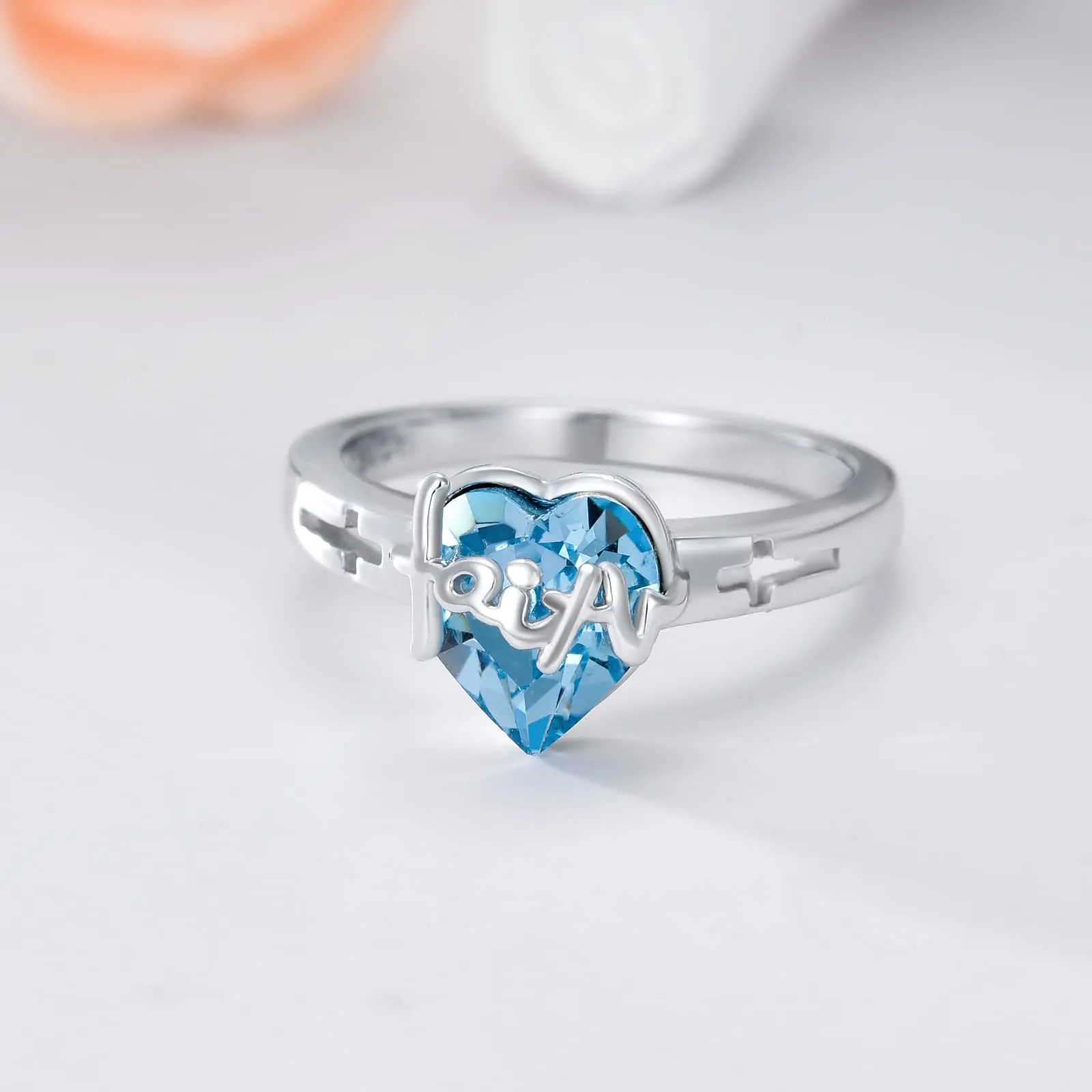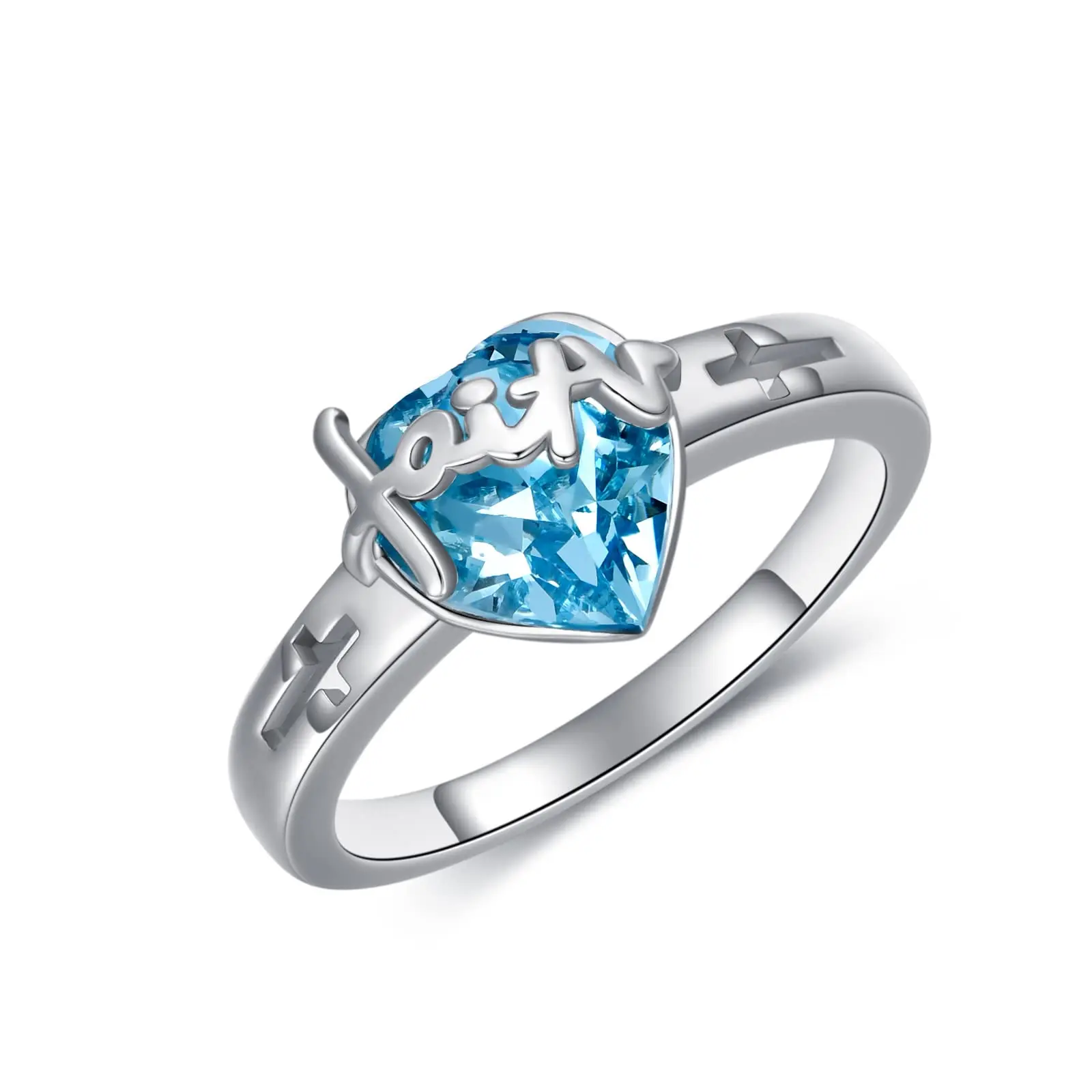 New Design 925 Sterling Silver blue heart crystal cross faith women mom ring
