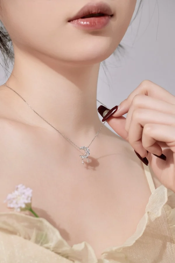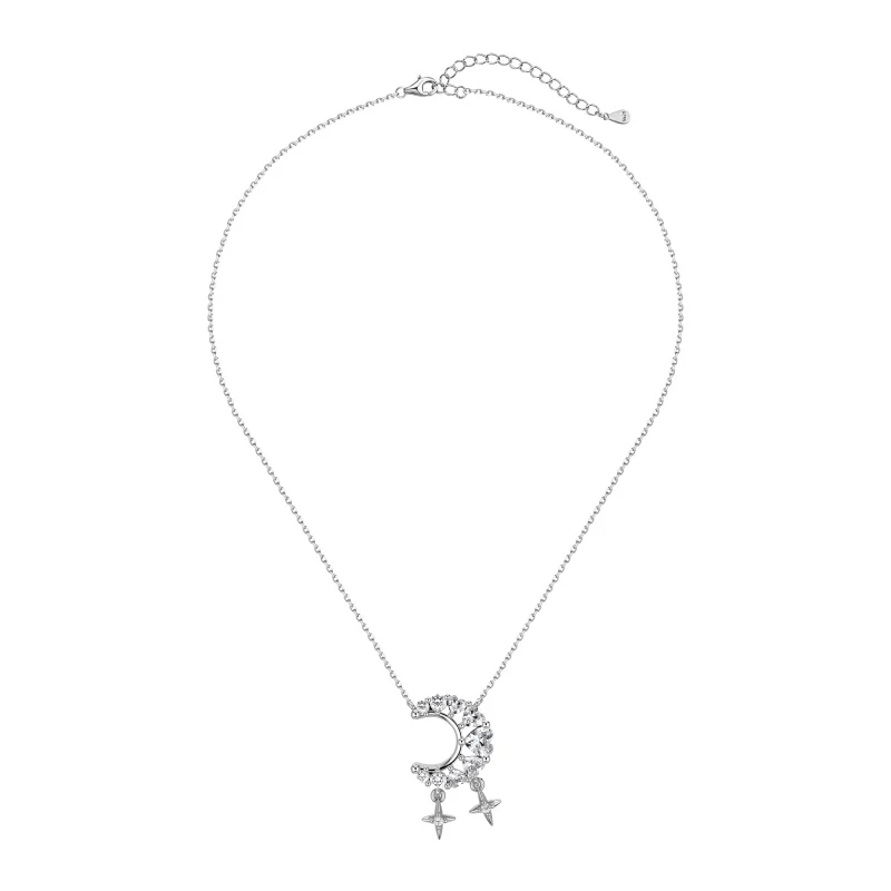 Hot Sale 925 Sterling Silver Jewelry Rhodium Plated Cubic Zircon Crescent Moon With Star Necklace