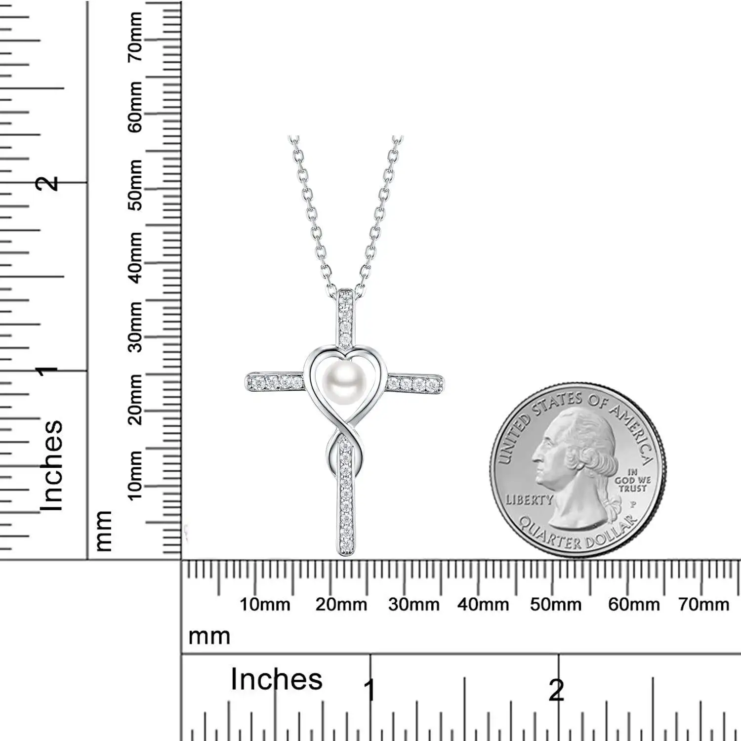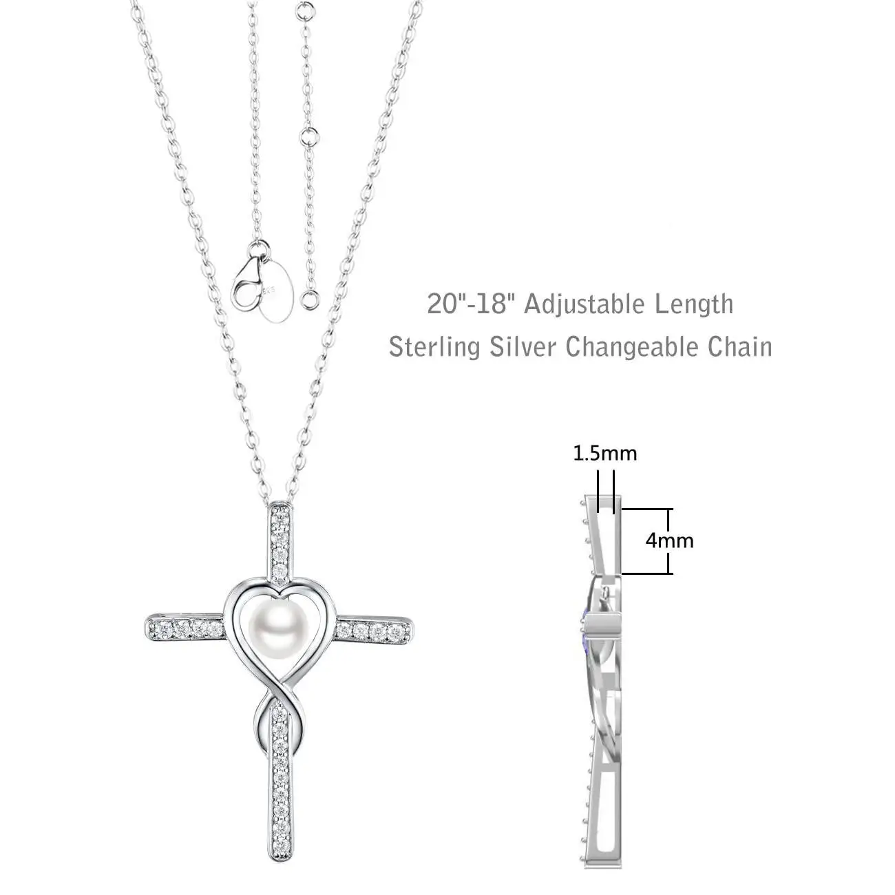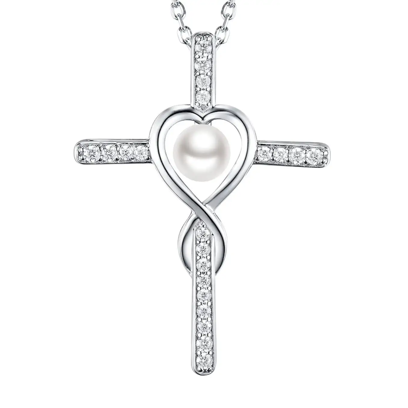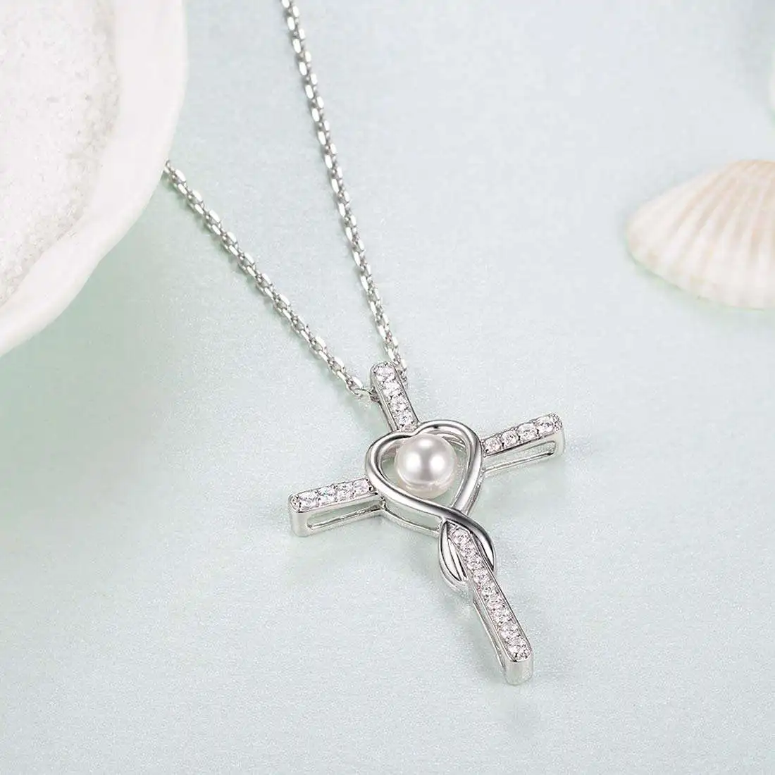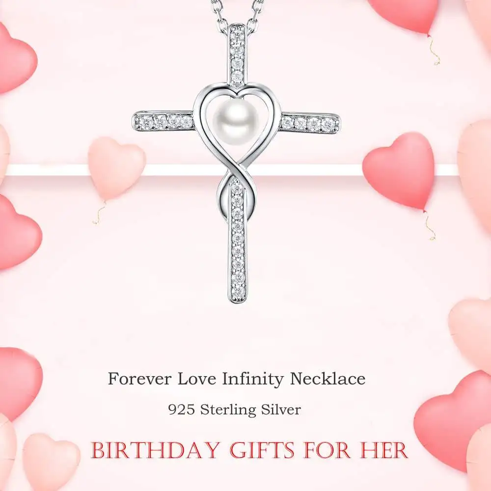 Religious Belief Jewelry 925 Sterling Silver Heart Freshwater White Pearl Cross Necklace for Women