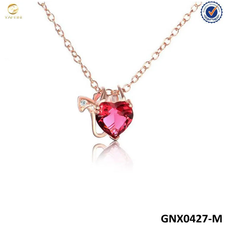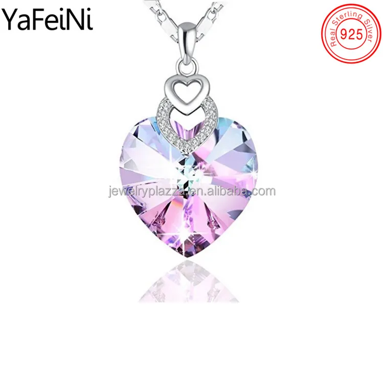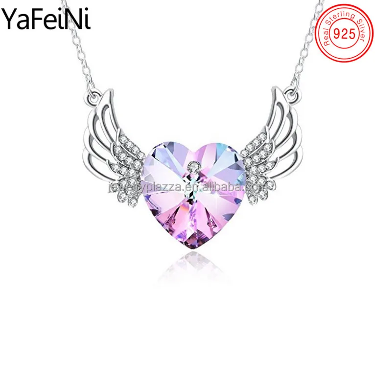 Valentine Fine Jewelry 925 Sterling Silver Love Heart Shape Pink Crystal Angel Wings Heart Necklace