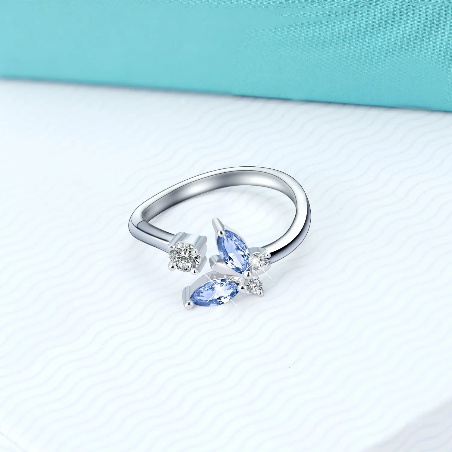 New Arrival 925 Sterling Silver Cubic Zircon Butterfly Kiss Blue Crystal Open Ring