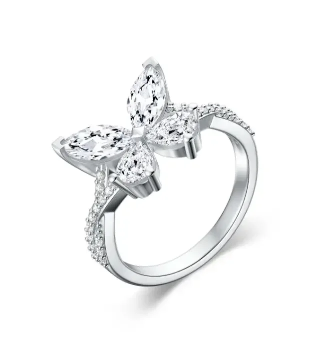 925 Sterling Silver Rhodium Plated Prong Setting Cubic Zircon Butterfly Ring For Women