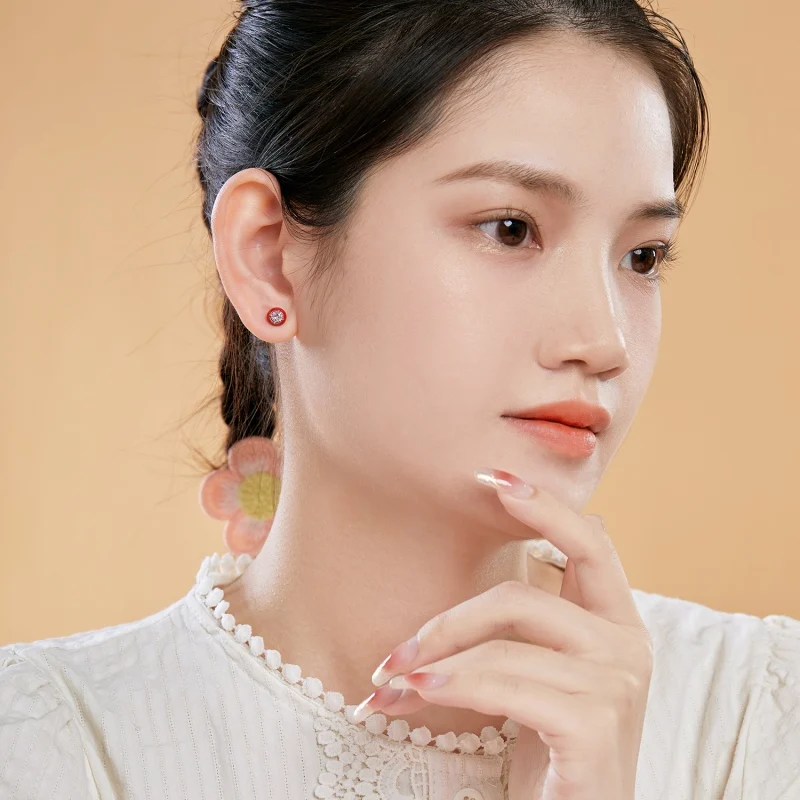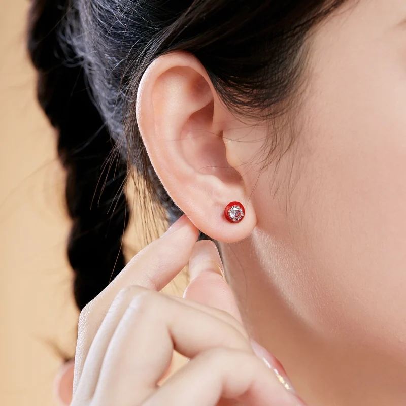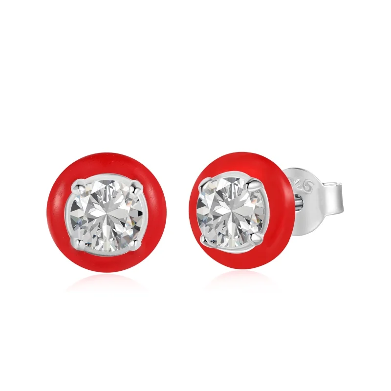 Minimalist Design 925 Sterling Silver Red Round Enamel 5A Zircon Stud Earrings For Women
