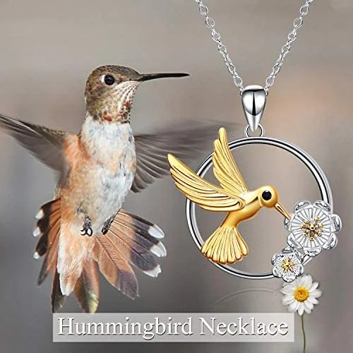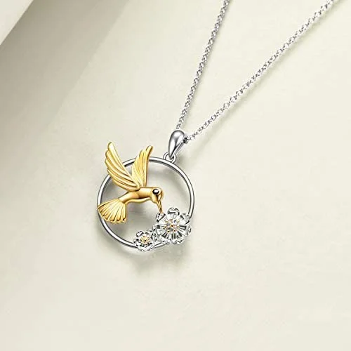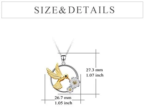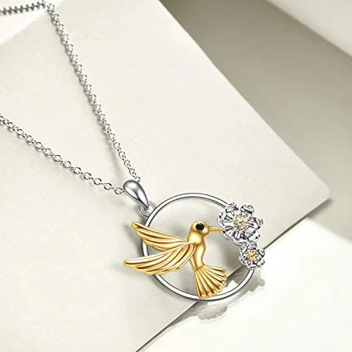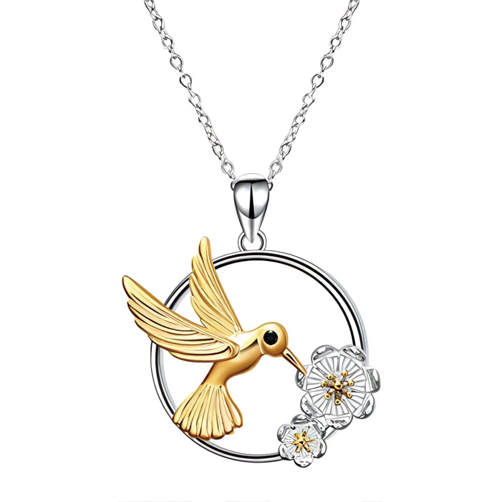 Cute Animal 925 Sterling Silver Jewelry Two Tone Hummingbird Flower Round Necklace