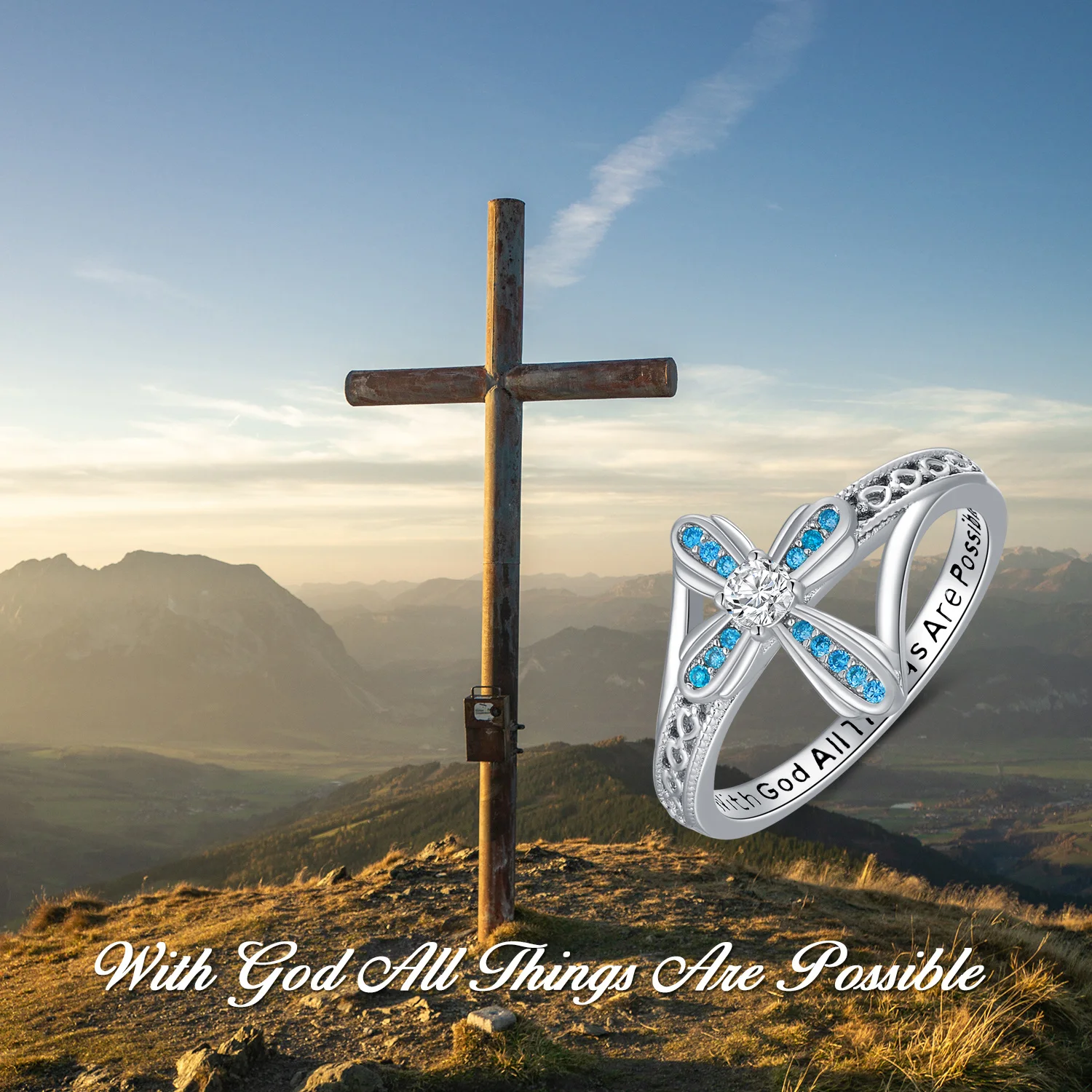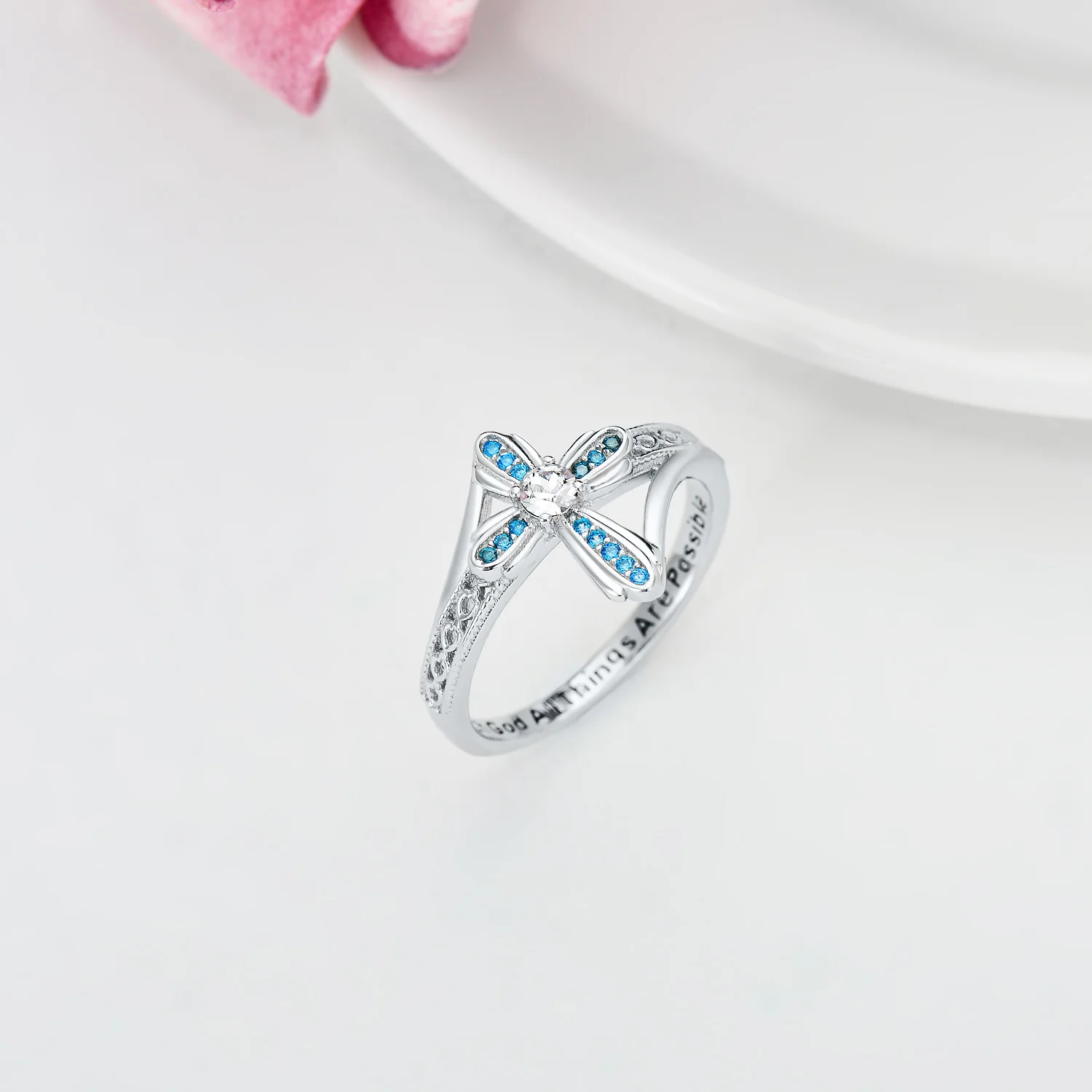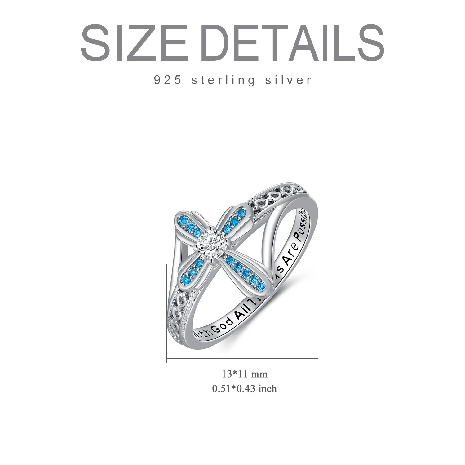 Religious Jewelry 925 Sterling Silver Engraved Bless Blue Zircon Cross Ring