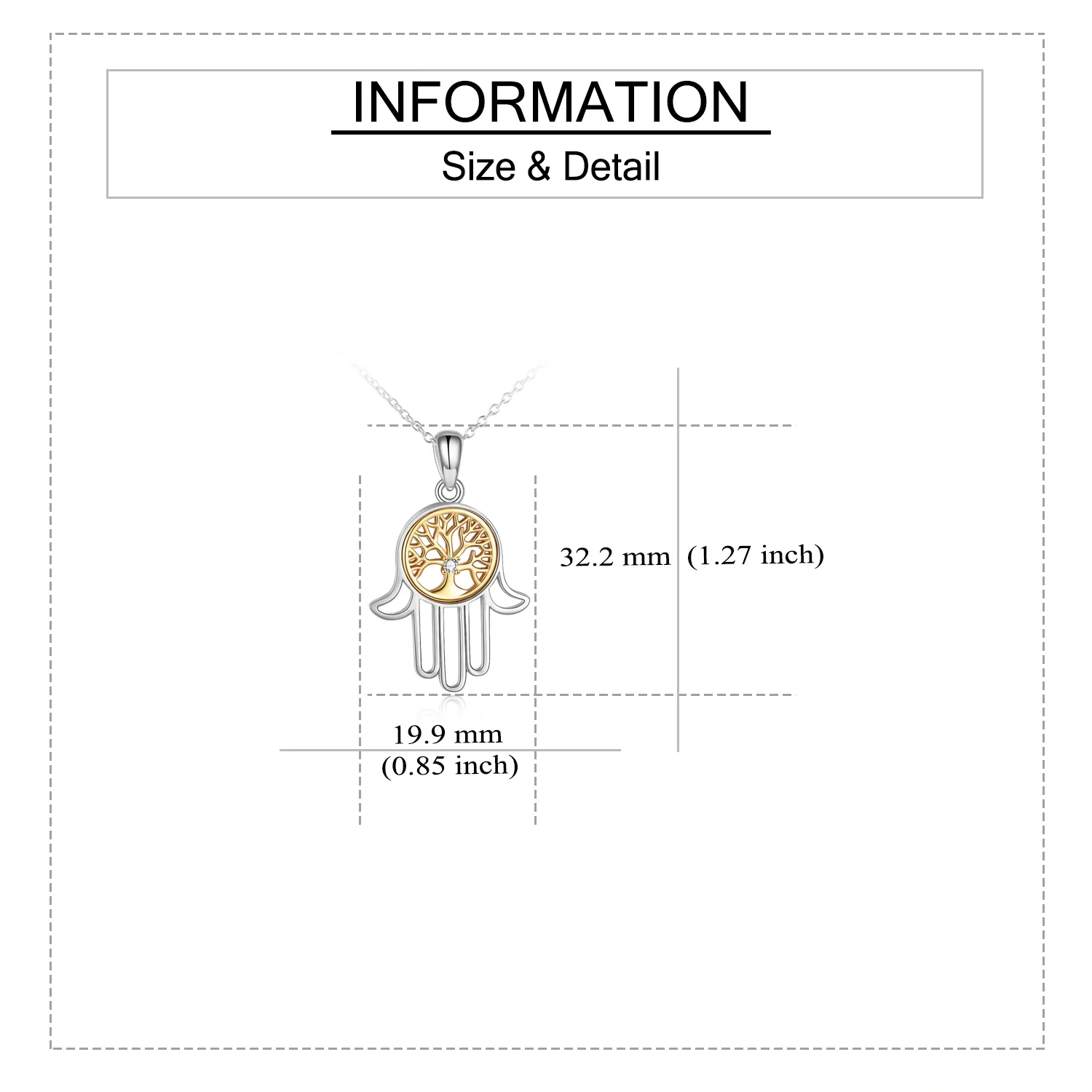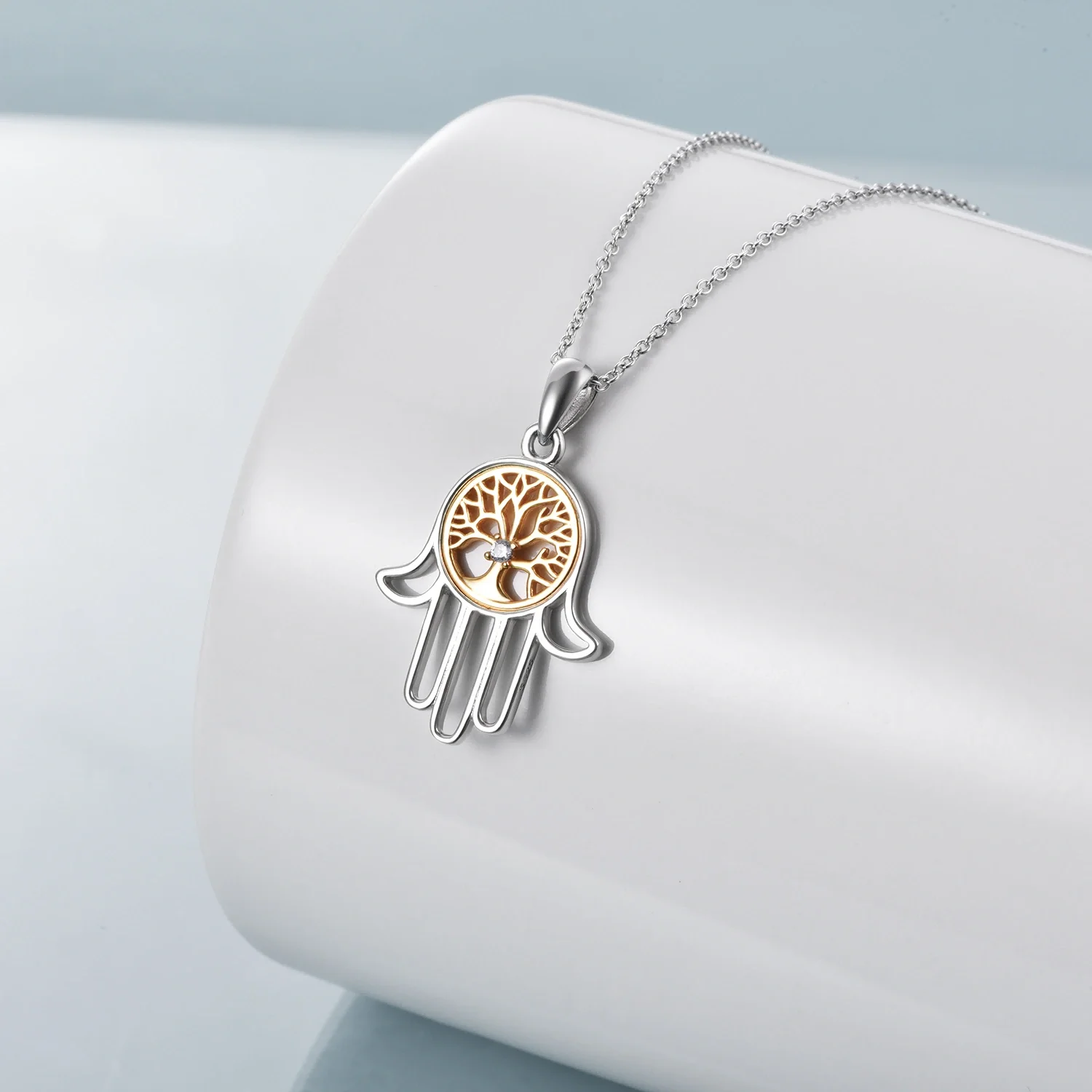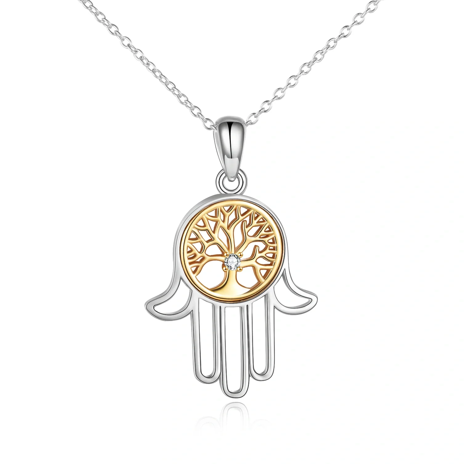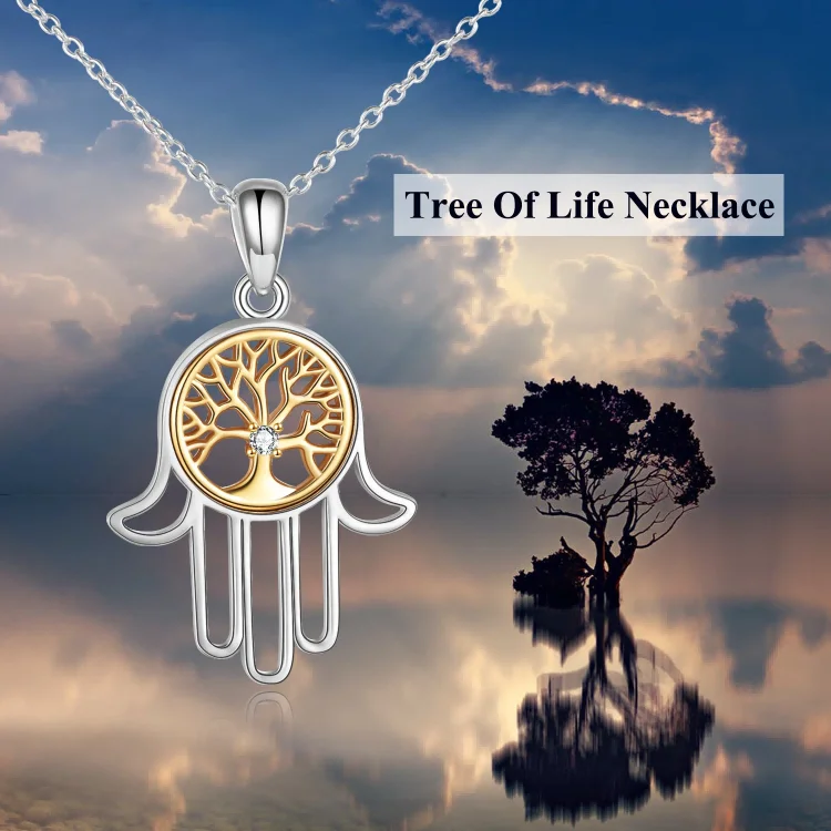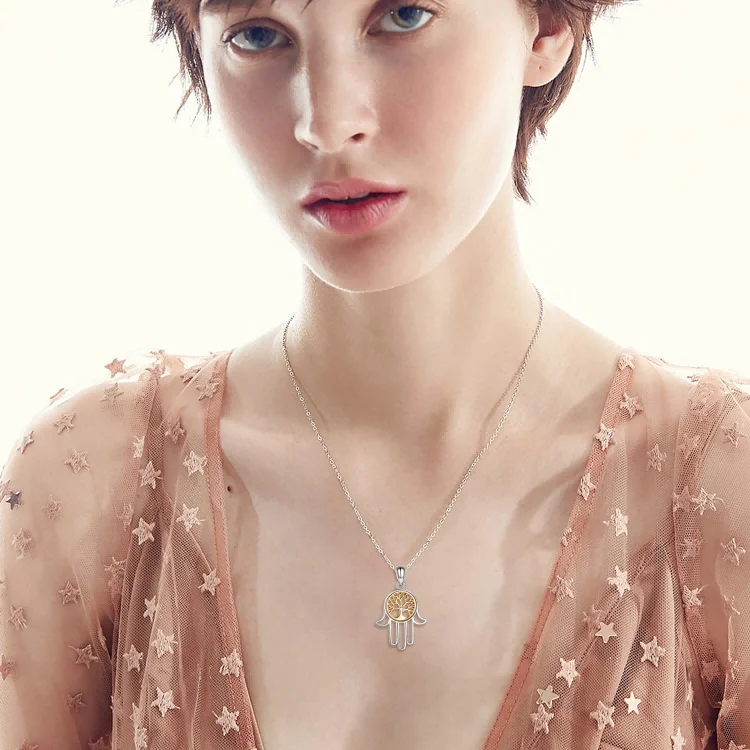 New Arrival 925 Sterling Silver Cubic Zircon Two Tone Tree Of Life Hamsa Hand Necklace
