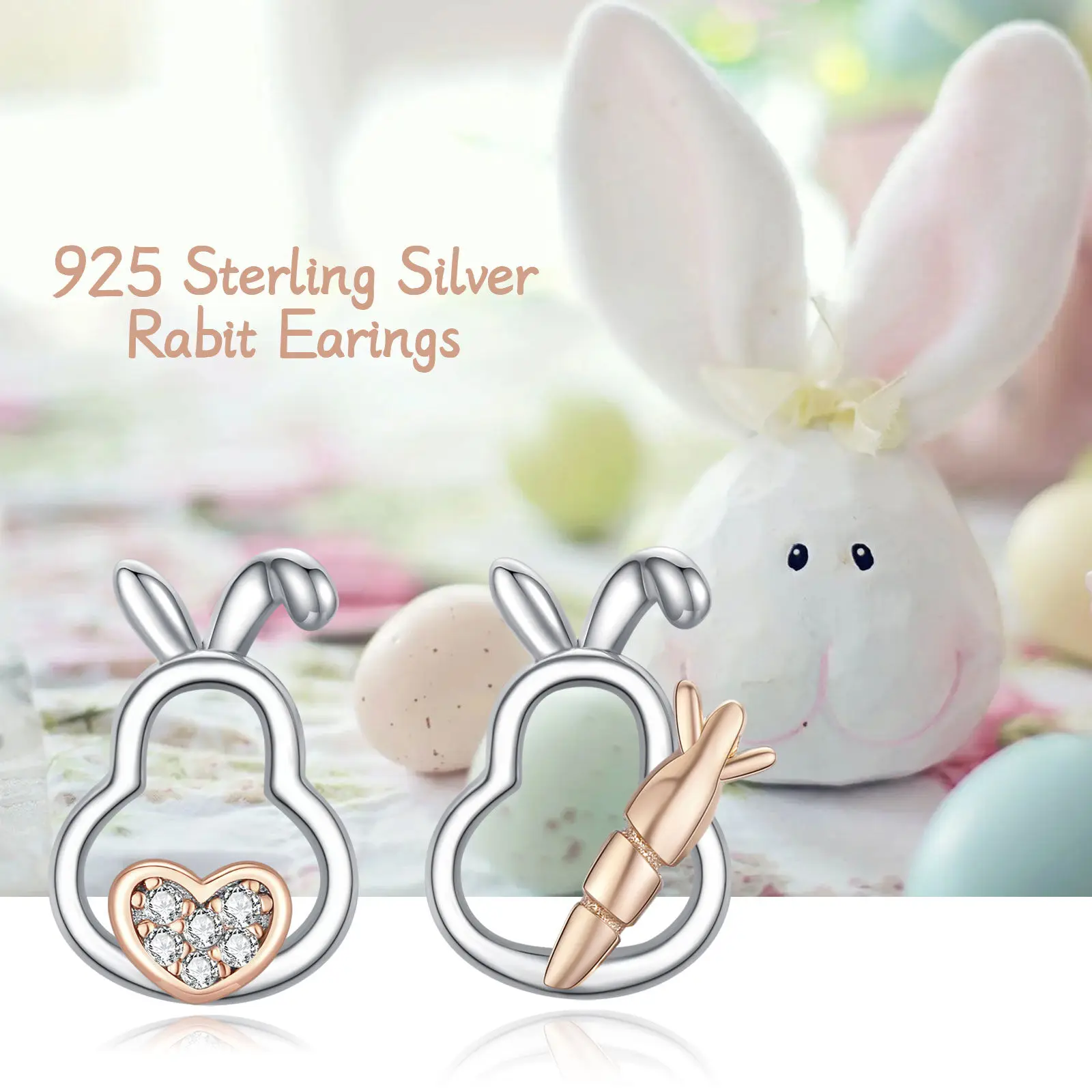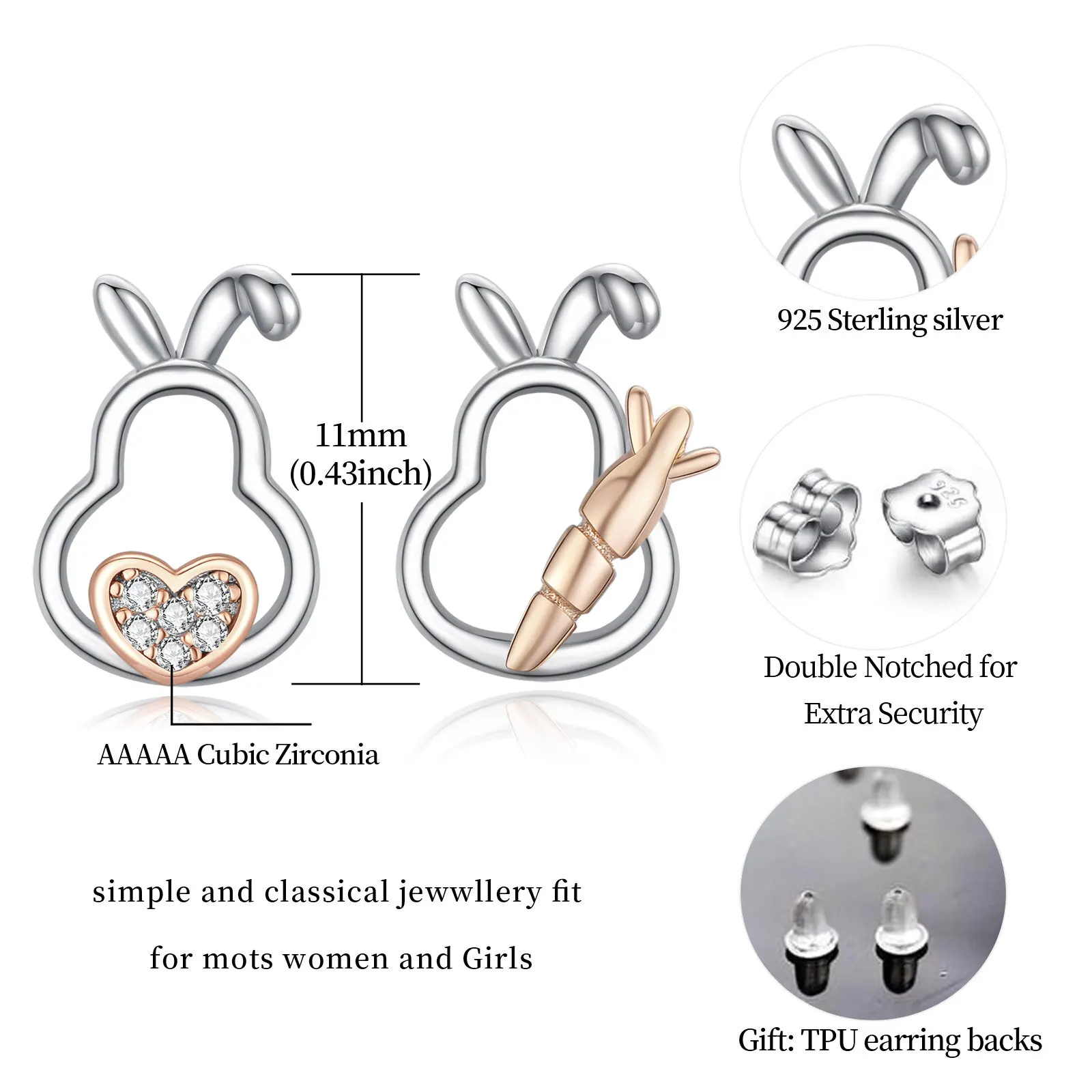 Simple Design 925 Sterling Silver Two Tone Tiny Bunny Radish 5A Zircon Heart Stud Earrings