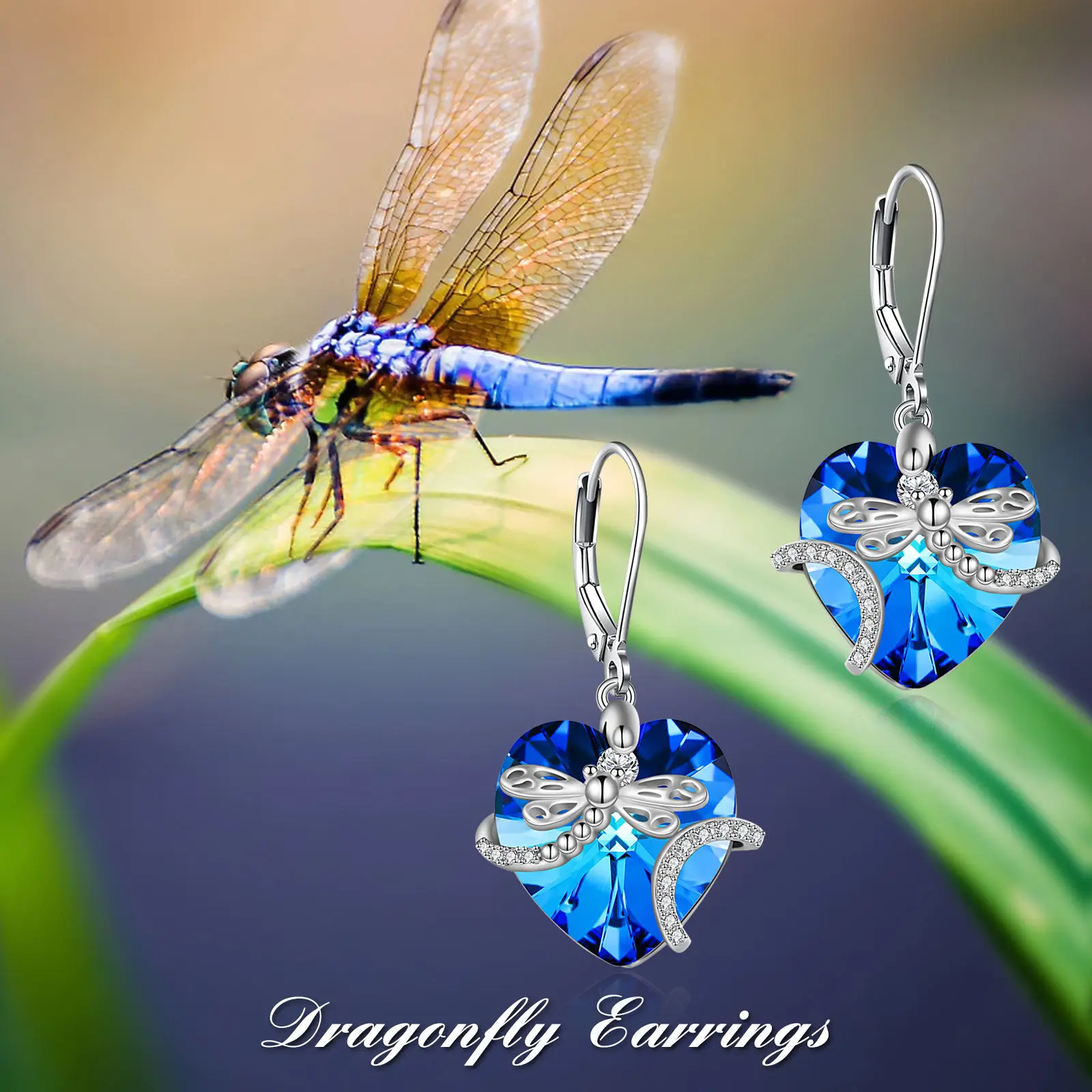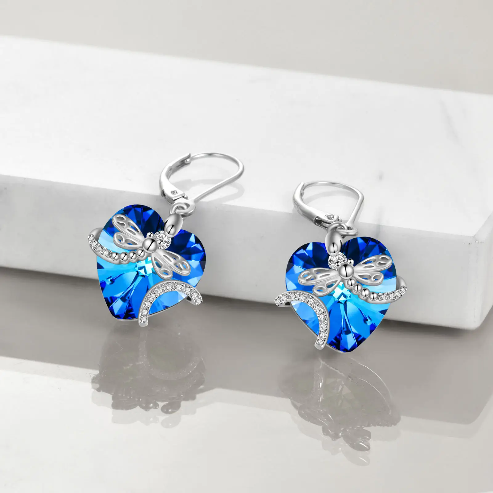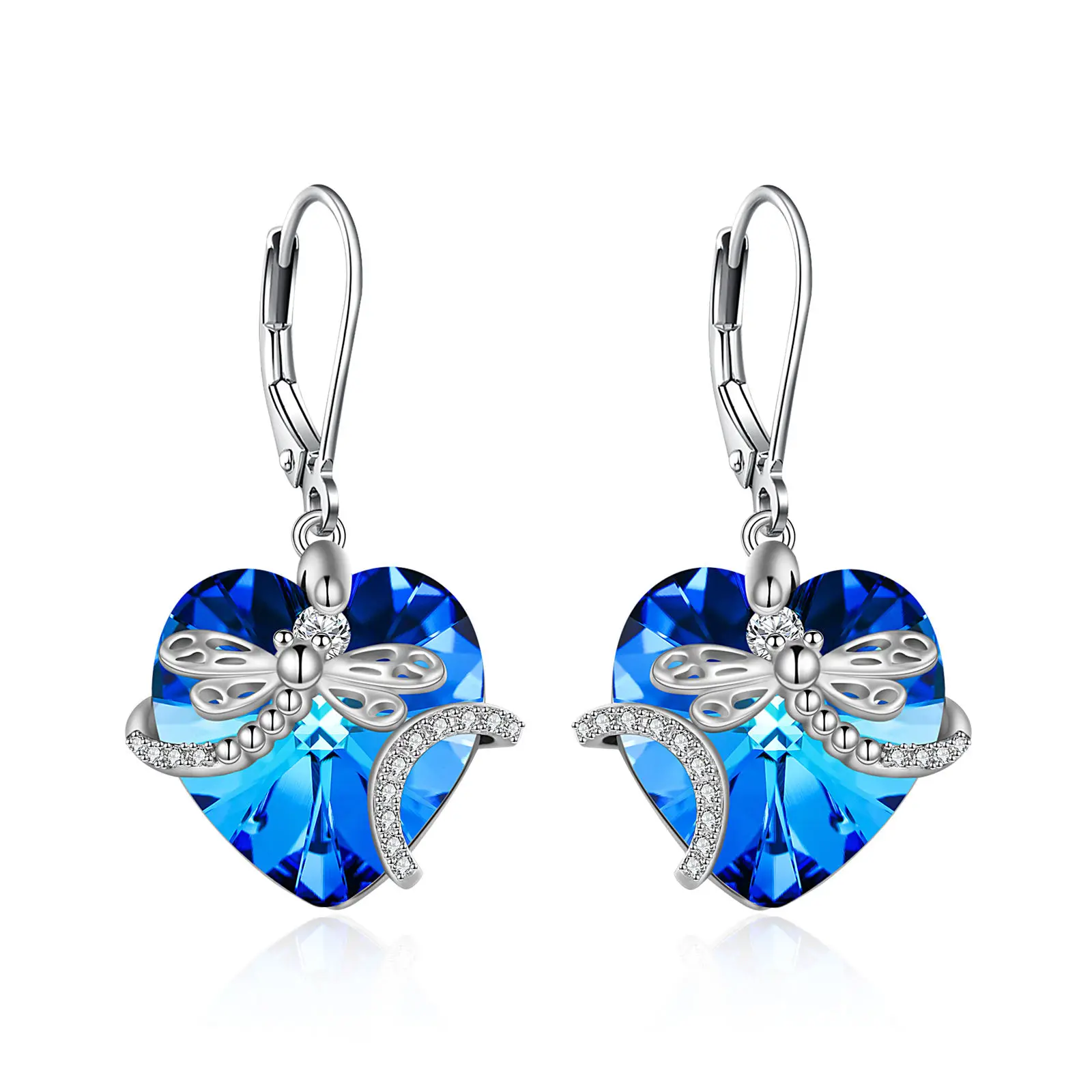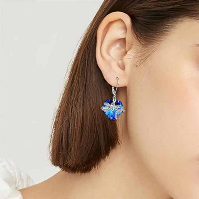 Jewelry Gifts 925 Sterling Silver Cubic Zircon Dragonfly Crystal Heart Drop Dangle Earrings