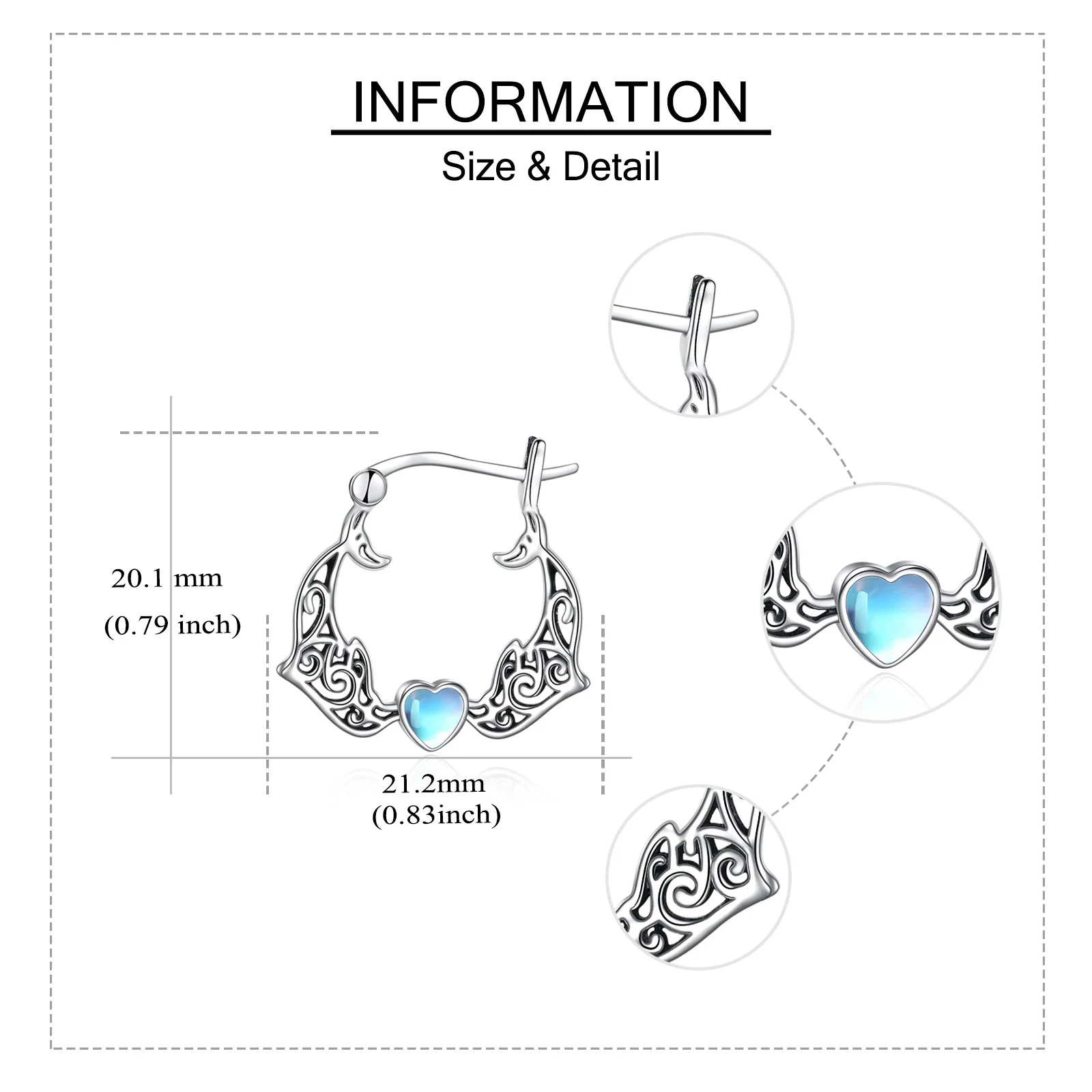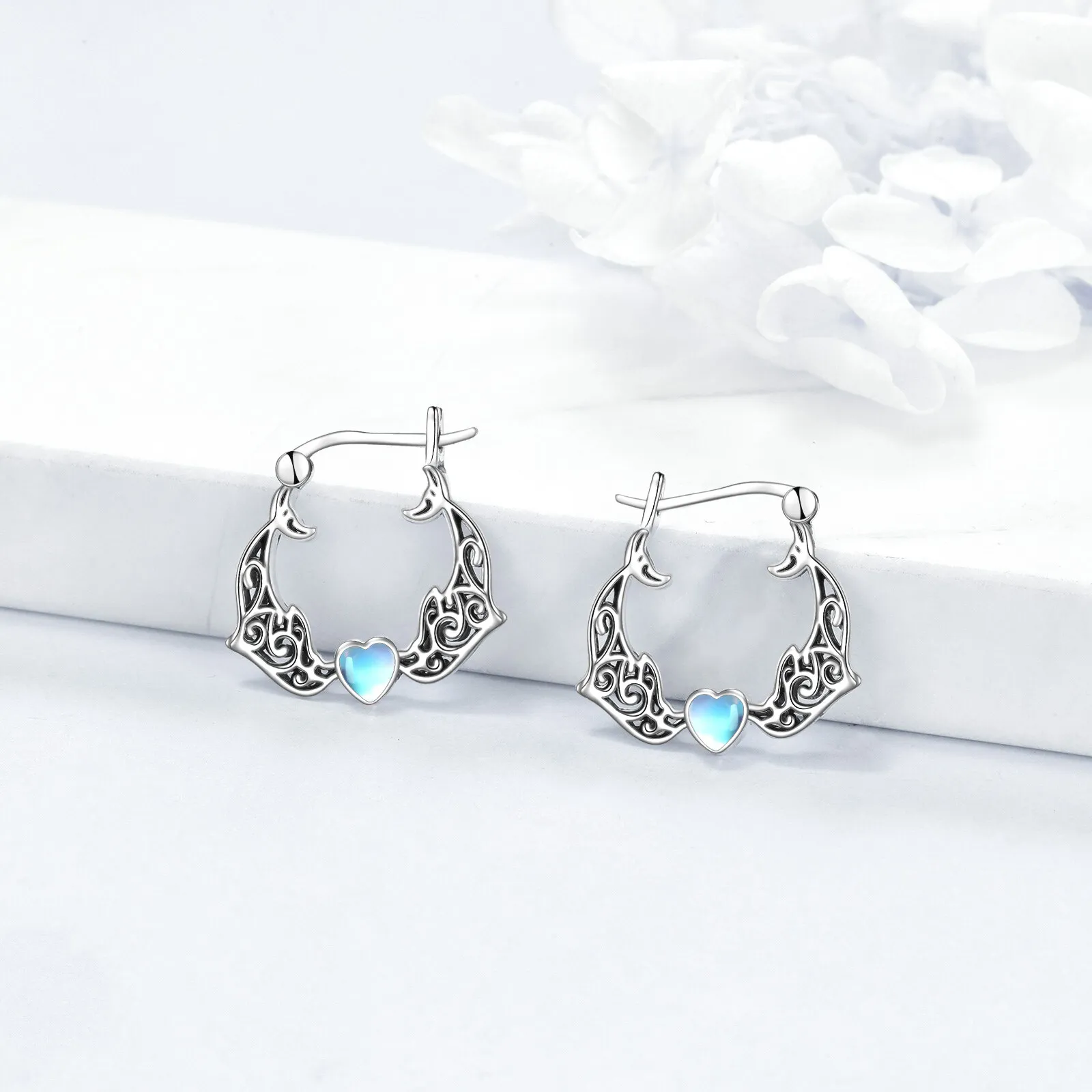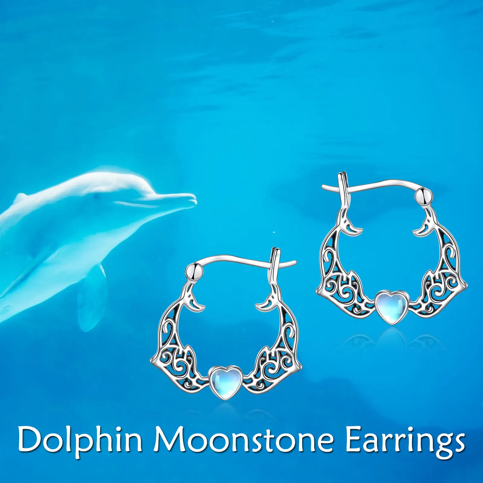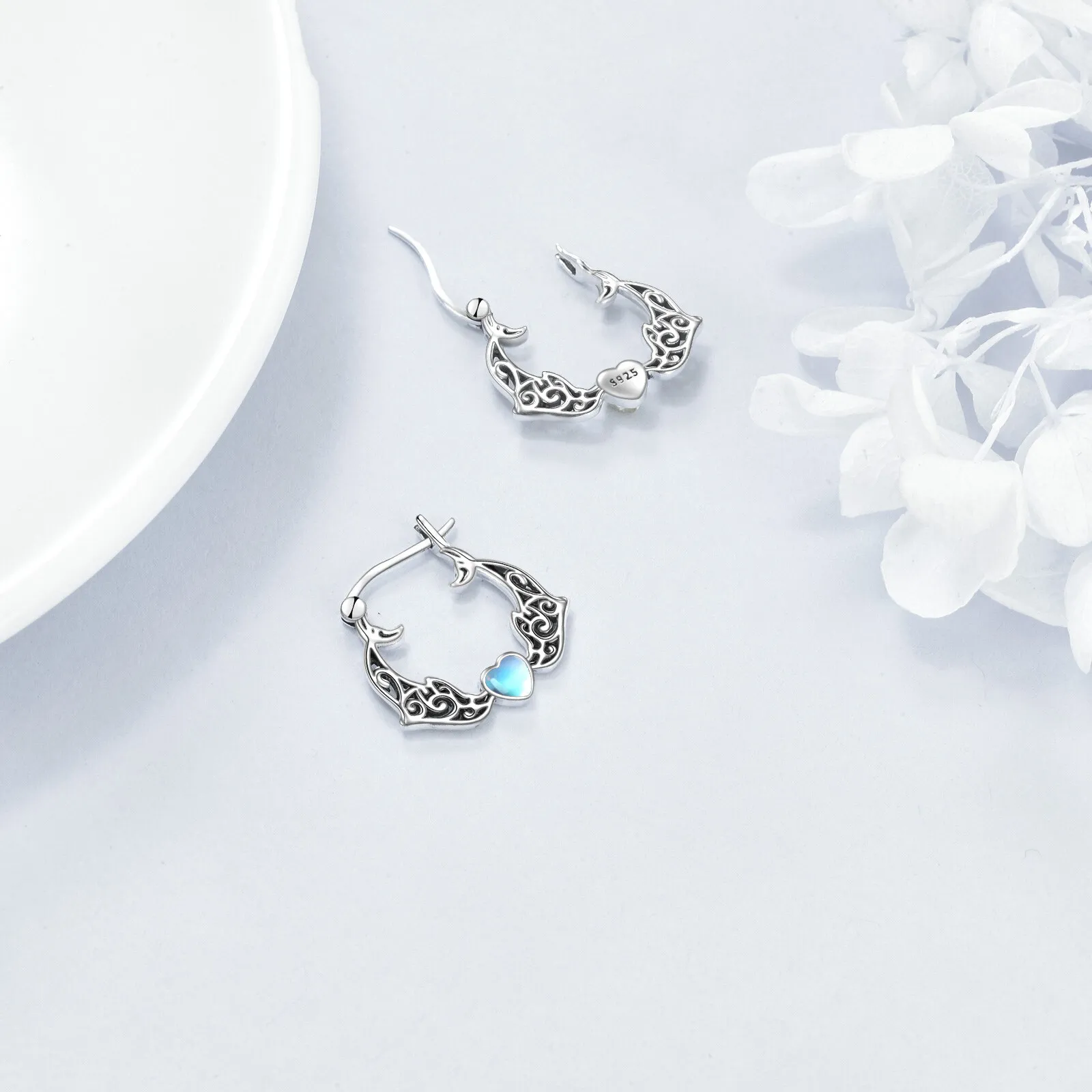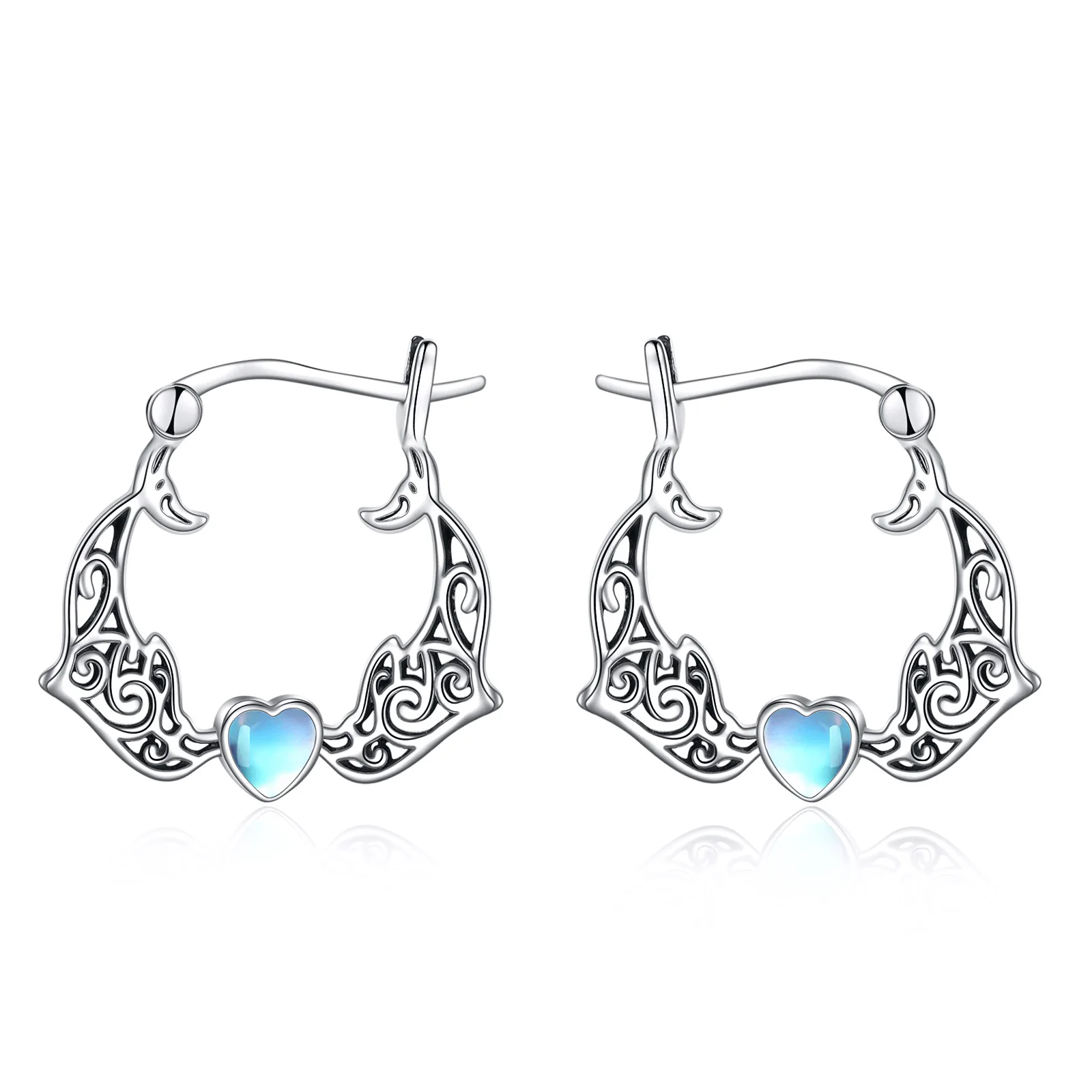 Fine Jewelry 925 Sterling Silver Cute Animal Dolphin Heart Moonstone Gemstone Hoop Earrings